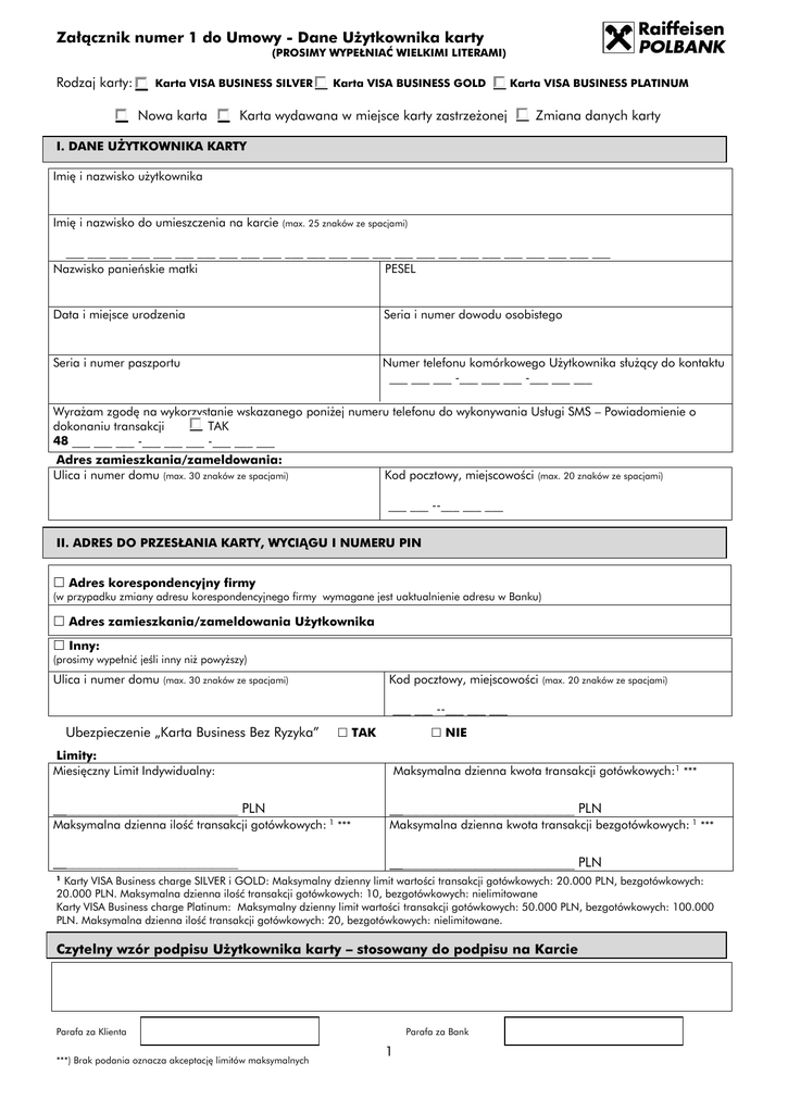 Załącznik numer 1 do Umowy - Dane Użytkownika karty (PROSIMY WYPEŁNIAĆ WIELKIMI LITERAMI) Rodzaj karty: Karta VISA BUSINESS SILVER Karta VISA BUSINESS GOLD Karta VISA BUSINESS PLATINUM Nowa karta Karta wydawana w miejsce karty zastrzeżonej Zmiana danych karty I. DANE UŻYTKOWNIKA KARTY Imię i nazwisko użytkownika Imię i nazwisko do umieszczenia na karcie (max. 25 znaków ze spacjami) ___ ___ ___ ___ ___ ___ ___ ___ ___ ___ ___ ___ ___ ___ ___ ___ ___ ___ ___ ___ ___ ___ ___ ___ ___ Nazwisko panieńskie matki PESEL Data i miejsce urodzenia Seria i numer dowodu osobistego Seria i numer paszportu Numer telefonu komórkowego Użytkownika służący do kontaktu ___ ___ ___ -___ ___ ___ -___ ___ ___ Wyrażam zgodę na wykorzystanie wskazanego poniżej numeru telefonu do wykonywania Usługi SMS – Powiadomienie o dokonaniu transakcji TAK 48 ___ ___ ___ -___ ___ ___ -___ ___ ___ Adres zamieszkania/zameldowania: Ulica i numer domu (max. 30 znaków ze spacjami) Kod pocztowy, miejscowości (max. 20 znaków ze spacjami) ___ ___ --___ ___ ___ II. ADRES DO PRZESŁANIA KARTY, WYCIĄGU I NUMERU PIN Adres korespondencyjny firmy (w przypadku zmiany adresu korespondencyjnego firmy wymagane jest uaktualnienie adresu w Banku) Adres zamieszkania/zameldowania Użytkownika Inny: (prosimy wypełnić jeśli inny niż powyższy) Ulica i numer domu Kod pocztowy, miejscowości (max. 30 znaków ze spacjami) (max. 20 znaków ze spacjami) ___ ___ --___ ___ ___ Ubezpieczenie „Karta Business Bez Ryzyka” TAK NIE Limity: Miesięczny Limit Indywidualny: Maksymalna dzienna kwota transakcji gotówkowych:1 *** ____________________________ PLN ____________________________ PLN Maksymalna dzienna ilość transakcji gotówkowych: 1 *** Maksymalna dzienna kwota transakcji bezgotówkowych: 1 *** ____________________________ ____________________________ PLN 1 Karty VISA Business charge SILVER i GOLD: Maksymalny dzienny limit wartości transakcji gotówkowych: 20.000 PLN, bezgotówkowych: 20.000 PLN. Maksymalna dzienna ilość transakcji gotówkowych: 10, bezgotówkowych: nielimitowane Karty VISA Business charge Platinum: Maksymalny dzienny limit wartości transakcji gotówkowych: 50.000 PLN, bezgotówkowych: 100.000 PLN. Maksymalna dzienna ilość transakcji gotówkowych: 20, bezgotówkowych: nielimitowane. Czytelny wzór podpisu Użytkownika karty – stosowany do podpisu na Karcie Parafa za Klienta ***) Brak podania oznacza akceptację limitów maksymalnych Parafa za Bank 1 III. OŚWIADCZENIA UŻYTKOWNIKA KARTY 1. Oświadczamy, że podane we Wniosku informacje są prawdziwe. Oświadczamy, że zapoznaliśmy się i akceptujemy postanowienia Regulaminu oraz zobowiązujemy się do stosowania postanowień Regulaminu. Oświadczamy, że otrzymaliśmy wzór Oświadczenia o odstąpieniu od Umowy. 2. Oświadczamy, że dobrowolnie wyrażamy zgodę na przetwarzanie naszych danych przez Raiffeisen Bank Polska S.A. z siedzibą na ulicy Pięknej 20, 00-549 Warszawa (zwany dalej Bankiem), przekazywania naszych danych do Biura Informacji Kredytowej S.A., First Data Polska S.A., VISA International, VISA Polska, Raiffeisen International AG, International Airline Passengers Association Ltd oraz innych podmiotów (tym jednostkom Banku w kraju i za granicą) za pośrednictwem których Bank wykonuje czynności w celu zawarcia i wykonywania postanowień Umowy. Przyjmujmy do wiadomości, że mamy prawo wglądu do danych przekazanych do Banku oraz prawo ich poprawiania. 3. Oświadczamy, że upoważniamy Bank do przekazywania wszelkich informacji objętych tajemnicą bankową do First Data Polska S.A., VISA International w celu wykonywania postanowień Umowy. 4. Oświadczamy, że dobrowolnie wyrażamy zgodę na przetwarzanie naszych danych w celu oferowania innych produktów i usług bankowych przez Bank, TAK 5. 6. NIE Zostaliśmy poinformowani, że w przypadku objęcia ochroną ubezpieczeniową administratorem moich danych jest UNIQA Towarzystwo Ubezpieczeń S.A. z siedzibą w Łodzi, ul. Gdańska 132, dane osobowe są zbierane w celu oceny ryzyka ubezpieczeniowego oraz wykonania Umowy Ubezpieczenia, odbiorcami danych są podmioty wskazane w ustawie z dnia 22 maja 2003 roku o działalności ubezpieczeniowej, podanie danych jest dobrowolne, posiadam prawo dostępu do treści swoich danych oraz ich poprawiania Oświadczamy, że w przypadku objęcia ochroną ubezpieczeniową wyrażamy zgodę na wystąpienie przez UNIQA TU S.A. do podmiotów, które udzielały świadczeń zdrowotnych o informacje o okolicznościach związanych z oceną ryzyka ubezpieczeniowego i weryfikacją podanych danych o stanie zdrowia, ustaleniem prawa do świadczenia z zawartej umowy ubezpieczenia i wysokością tego świadczenia, a także informacje o przyczynie śmierci ubezpieczonego, z wyłączeniem wyników badań genetycznych. Data i podpis użytkownika karty Opłata za wydanie Karty / Opłata roczna : ________________ zł IV.AKCEPTACJE POSIADACZA I BANKU Podpisy za Posiadacza - Firmę Data Miejscowość _______________________________________________________________________ Pieczęć firmowa, podpisy osób upoważnionych do reprezentowania Posiadacza Firmy Informacje przedstawiciela Banku: Podpisy sprawdzono*/ złożono w mojej obecności* Zgodne z reprezentacją Data Miejscowość *) Niepotrzebne skreślić Obszary zacieniowane wypełnia Bank _________________________________________________________________________ Podpis i pieczątka Pracownika/Przedstawiciela Banku przyjmującego dokument 2