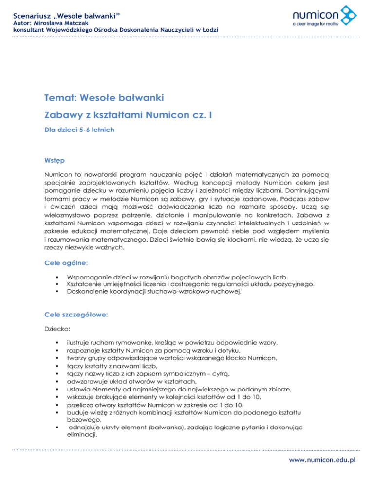 Scenariusz „Wesołe bałwanki” Autor: Mirosława Matczak konsultant Wojewódzkiego Ośrodka Doskonalenia Nauczycieli w Łodzi Temat: Wesołe bałwanki Zabawy z kształtami Numicon cz. I Dla dzieci 5-6 letnich Wstęp Numicon to nowatorski program nauczania pojęć i działań matematycznych za pomocą specjalnie zaprojektowanych kształtów. Według koncepcji metody Numicon celem jest pomaganie dziecku w rozumieniu pojęcia liczby i zależności między liczbami. Dominującymi formami pracy w metodzie Numicon są zabawy, gry i sytuacje zadaniowe. Podczas zabaw i ćwiczeń dzieci mają możliwość doświadczania liczb na rozmaite sposoby. Uczą się wielozmysłowo poprzez patrzenie, działanie i manipulowanie na konkretach. Zabawa z kształtami Numicon wspomaga dzieci w rozwijaniu czynności intelektualnych i uzdolnień w zakresie edukacji matematycznej. Daje dzieciom pewność siebie pod względem myślenia i rozumowania matematycznego. Dzieci świetnie bawią się klockami, nie wiedzą, że uczą się rzeczy niezwykle ważnych. Cele ogólne: Wspomaganie dzieci w rozwijaniu bogatych obrazów pojęciowych liczb. Kształcenie umiejętności liczenia i dostrzegania regularności układu pozycyjnego. Doskonalenie koordynacji słuchowo-wzrokowo-ruchowej. Cele szczegółowe: Dziecko: ilustruje ruchem rymowankę, kreśląc w powietrzu odpowiednie wzory, rozpoznaje kształty Numicon za pomocą wzroku i dotyku, tworzy grupy odpowiadające wartości wskazanego klocka Numicon, łączy kształty z nazwami liczb, łączy nazwy liczb z ich zapisem symbolicznym – cyfrą. odwzorowuje układ otworów w kształtach, ustawia elementy od najmniejszego do największego w podanym zbiorze, wskazuje brakujące elementy w kolejności kształtów od 1 do 10, przelicza otwory kształtów Numicon w zakresie od 1 do 10. buduje wieżę z różnych kombinacji kształtów Numicon do podanego kształtu bazowego, odnajduje ukryty element (bałwanka), zadając logiczne pytania i dokonując eliminacji. www.numicon.edu.pl Scenariusz „Wesołe bałwanki” Autor: Mirosława Matczak konsultant Wojewódzkiego Ośrodka Doskonalenia Nauczycieli w Łodzi Metody: czynna (zadań stawianych do wykonania) słowna (objaśnianie), oglądowa (pokaz), elementy pedagogiki zabawy, elementy metody MDS Formy: zbiorowa, w grupach, w parach, indywidualna Pomoce: kształty Numicon, kołeczki, plastikowe tablice, woreczki, sylwety bałwanków, kredki, dowolne nagranie wesołej muzyki. Przebieg: 1. „Bałwanek” –zaproszenie do zabaw z bałwankami. Nauczycielka mówi rymowankę jednocześnie ilustrując ją ruchem, dzieci rysują w powietrzu. Toczę kule trzy (dzieci kreślą w powietrzu jedno koło), Czy pomożesz mi? (dzieci kreślą w powietrzu drugie koło nad tym pierwszym), Bałwan stoi już. (dzieci kreślą w powietrzu trzecie koło nad drugim), Kapelusz mu włóż! (dzieci mówiąc ostatni wers rymowanki sylabami rysują kapelusz od lewej – kreska pozioma w prawo, pionowa w górę, pozioma w prawo, pionowa w dół, pozioma w prawo) 2. „Taniec bałwanków” – dzieci tańczą swobodnie po sali przy wesołej muzyce. Na przerwę w muzyce tworzą grupy odpowiadające kształtom Numicon wskazywanych przez nauczycielkę i tańczą według polecenia: Kształt z dwoma otworami – walczyk w parach. Kształt z trzema otworami – w grupach trzyosobowych obroty dookoła siebie w prawą stronę i w lewą stronę. Kształt z czterema otworami – w kółeczkach czteroosobowych krok do środka kółeczka, krok na zewnątrz kółeczka. Kształt z pięcioma otworami – podskoki z nogi na nogę w kółeczku pięcioosobowym. Kształt z sześcioma otworami – „pociągi” sześcioosobowe chodzą po sali wykonując rytm: cztery kroki, trzy klaśnięcia, cztery kroki, trzy klaśnięcia itd. Uwaga: wskazanie przez nauczycielkę klocka z jednym otworem powoduje powrót dzieci do indywidualnego tańca i ponowne tworzenie grup wg. wskazanego kształtu. 3. „Guziki dla bałwanka” – każde dziecko otrzymuje sylwetkę bałwanka. Sylwety są na tasiemkach. Bałwanki mają kapelusze w pięciu kolorach (czerwony, zielony, brązowy, niebieski, żółty) i na każdym kapeluszu jest naklejona jedna cyfra (z zakresu od 1 do 10). Zadaniem dziecka jest wylosowanie z worka, za pomocą dotyku, kształtu Numicon odpowiadającego symbolowi graficznemu liczby zapisanego na kapeluszu bałwanka. Następnie dziecko nakłada wybrany kształt na postać bałwanka i koloruje kredką same otwory, rysując w ten sposób guziki bałwanka. Np.: bałwanek z cyfrą 4 będzie miał cztery www.numicon.edu.pl Scenariusz „Wesołe bałwanki” Autor: Mirosława Matczak konsultant Wojewódzkiego Ośrodka Doskonalenia Nauczycieli w Łodzi guziki, bałwanek z cyfrą 6, będzie miał sześć guzików. Dzieci liczą guziki swoich bałwanków. 4. „Jakich bałwanków brakuje?” – dzieci zakładają na siebie sylwety bałwanków (wykonane w przednim ćwiczeniu), ustawiają się w grupy według kolorów kapeluszy. Nauczycielka prosi, by w grupach ustawiły się od najmniejszej liczby guzików do największej. W grupach będą bałwanki z różnymi liczbami guzików np.: 3,4,5,6; 7,8,9,10; 1,2,3,4, itd. Dzieci określają, jakich bałwanków brakuje w ich grupie? Czy brakujące bałwanki mają większą, czy mniejszą liczbę guzików, a może brakuje tych z mniejszą liczbą guzików i z większą. 5. „Zabawa w kole” – Na melodię „O jak miło i wesoło…” dzieci śpiewają: „O jak miło i wesoło, kiedy jeden krąży wkoło”…”, kiedy cztery krąży wkoło…” itp. do 10. Dzieci z sylwetami bałwanków odpowiadających danemu kształtowi Numicon, wykonują jedno okrążenie na zewnątrz koła. 6. „Domki dla bałwanków” – dzieci w parach otrzymują bałwanka oznaczonego cyfrą na kapeluszu i narysowanymi guzikami (w zakresie od 4 do 10). Wybierają odpowiedni kształt Numicon, układają go na białej planszy i we wszystkie otwory wkładają ko