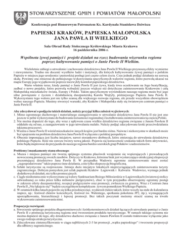 STOWARZYSZENIE GMIN I POWIATÓW MAŁOPOLSKI Konferencja pod Honorowym Patronatem Ks. Kardynała Stanisława Dziwisza PAPIESKI KRAKÓW, PAPIESKA MAŁOPOLSKA JANA PAWŁA II WIELKIEGO Sala Obrad Rady Stołecznego Królewskiego Miasta Krakowa 16 października 2006 r. Wspólnota żywej pamięci i projekt działań na rzecz budowania wizerunku regionu poprzez kultywowanie pamięci o Janie Pawle II Wielkim. Wieloletnie zabiegi o utrwalenie i zachowanie dziedzictwa Jana Pawła II Wielkiego przynoszą efekty wymierne i niewymierne. Trudno nie docenić wysiłków ludzi i instytucji, dla których kultywowanie żywej pamięci o polskim Papieżu w miejscu jego urodzenia i pasterskiej posługi jest często celem życia. Czas jednak podjąć działania na szerszą skalę. Powinny one zmierzać do pełniejszego wykorzystania specyficznych walorów regionu, które pozwolą ukazać na mapie Europy jego wyjątkowość poprzez niezwykły kontekst papieskiego dziedzictwa. Warto właśnie teraz, kiedy pamięć o Janie Pawle II jest żywa, kiedy trwa oczekiwanie na Jego beatyfikację, zadbać o nowe projekty, które pozwolą wzbudzić jeszcze większe niż dotychczas zainteresowanie Krakowem i całą Małopolską mieszkańców świata, Europy i Polski. Takim specyficznym wyróżnikiem naszego regionu może być jego silne powiązanie z życiem i działalnością duszpasterską Karola Wojtyły, późniejszego Papieża Jana Pawła II. Wykorzystanie tego waloru jest nie tylko szansą dla większego rozwoju regionu, ale przede wszystkim obowiązkiem wobec naszego Papieża. Musimy stworzyć warunki, aby Kraków i Małopolska stały się światowym centrum pamięci o Janie Pawle II. Aby zdecydować o podjęciu takich działań, należy przyjąć kilka założeń wyjściowych: 1. Mimo ogromnego duchowego i materialnego zaangażowania w utrwalanie dziedzictwa Jana Pawła II nie jest ono jeszcze w pełni wykorzystane do budowania tożsamości regionalnej i kształtowania zainteresowania tą częścią Polski. 2. Nie można dopuścić do tego, aby wraz z upływem czasu wielkie dziedzictwo regionu związane z Janem Pawłem II oddalało się od nas, a zaangażowanie w jego utrwalaniu malało. Należy podjąć zdecydowane kroki przeciwdziałania takiemu procesowi. 3. Wiedza o Janie Pawle II wśród mieszkańców innych krajów jest bardzo różna. Naiwne i niekorzystne w skutkach może być spojrzenie na problem dziedzictwa Jana Pawła II wyłącznie z polskiej perspektyw. 4. Obecnie imponująca jest liczba inicjatyw, nawet stosunkowo drobnych, które zmierzają do utrwalenia dziedzictwa polskiego Papieża. Ilość nie zawsze tworzy nową jakość. Pojawia się konieczność szukania takich form aktywności, które będą inspirować do przyjazdu do naszego regionu bardzo szerokich grup Polaków i cudzoziemców. Problemy i mankamenty stanu obecnego: a. Muzea i miejsca pamięci nie tworzą spójnego systemu placówek wzajemnie się wspierających i prowadzących nowoczesną promocję swoich zasobów. Dotyczy to Krakowa, któremu brak jest wystarczająco atrakcyjnej ekspozycji prezentującej dziedzictwo Jana Pawła II. W przypadku Wadowic ogromne zainteresowanie musi zostać „zagospodarowane” także poprzez inne działania, a nie tylko ekspozycję biograficzną. b. Szlaki turystyczne są rozproszone. Istnieje dużo inicjatyw lokalnych nieprzyciągających zainteresowania turysty zagranicznego. Dobrym pomysłem jest szlak papieski Kraków Łagiewnik i Kalwaria Wadowice, wymaga jednak dodatkowych działań, nie tylko promocyjnych. c. Ciągle niedostatecznie wykorzystane są walory Sanktuarium Bożego Miłosierdzia w Łagiewnikach (światowej stolicy odwiedzanej co roku przez kilka milionów pielgrzymów), choć w tym przypadku obserwujemy ogromny postęp w zakresie oferty duszpasterskiej, recepcji pielgrzymów oraz promocji, zwłaszcza za granicą. Wraz z Centrum Jana Pawła II „Nie lękajcie się!” będzie szczególnym kompleksem żywym pomnikiem Wielkiego Papieża. d. W ostatnich kilku latach pojawiło się kilka przedsięwzięć, wydarzeń (także takich, które weszły na stałe do kalendarza imprez, np.: festiwal chórów kościelnych, festiwal św. Walentego, spotkania pokolenia JP2, itp.), wymagających uporządkowania, hierarchizacji i lepszej promocji. Bez takich poczynań możemy stracić szansę na trwałe wykreowanie zainteresowania nimi. Propozycje rozwiązań: a. Stworzenie spójnego projektu długoterminowych i krótkoterminowych działań łączących utrwalanie pamięci o Janie Pawle II z promocją turystyczną regionu oraz tworzeniem produktu turystycznego. W ramach takiego systemu nie można dopuścić do tego, aby dziedzictwo duchowe związane z Janem Pawłem II zostało traktowane wyłącznie jako swego rodzaju atrakcja turystyczna. b. Zdecydowane zintensyfikowanie w ciągu najbliższych 2-3 lat promocji „wątku papieskiego” i tworzenie propozycji dla odbiorcy zagranicznego. c. Maksymalne wykorzystanie obecnego międzynarodowego zainteresowania Krakowem dla pobudzania i ukierunkowania tego zjawiska w stronę dziedzictwa Jana Pawła II. d. Zwiększenie wykorzystania nowoczesnych form komunikowania, z równoczesnym zachowaniem wypracowanych rozwiązań tradycyjnych, dobrze postrzeganych przez starszych odbiorców. e. Ścisła współpraca instytucji kościelnych i świeckich (miejskich i regionalnych) dla skoncentrowania wysiłków na kilku wiodących projektach. Ograniczenie negatywnych skutków nadmiernego rozproszenia sił i nadmiernej mnogości inicjatyw. Instrumenty oraz konkretne projekty w ramach wskazanych działań: 1. Stworzenie jednego, wiodącego szlaku papieskiego łatwego w promocji i obsłudze, dającego również turystom zagranicznym możliwość szybkiego zapoznania się z krakowskim i małopolskim dziedzictwem Jana Pawła II. Równocześnie należy przygotować kilka dodatkowych wariantów, np. dla grup narodowych mających specyficzne oczekiwania. Podstawą powinien być szlak