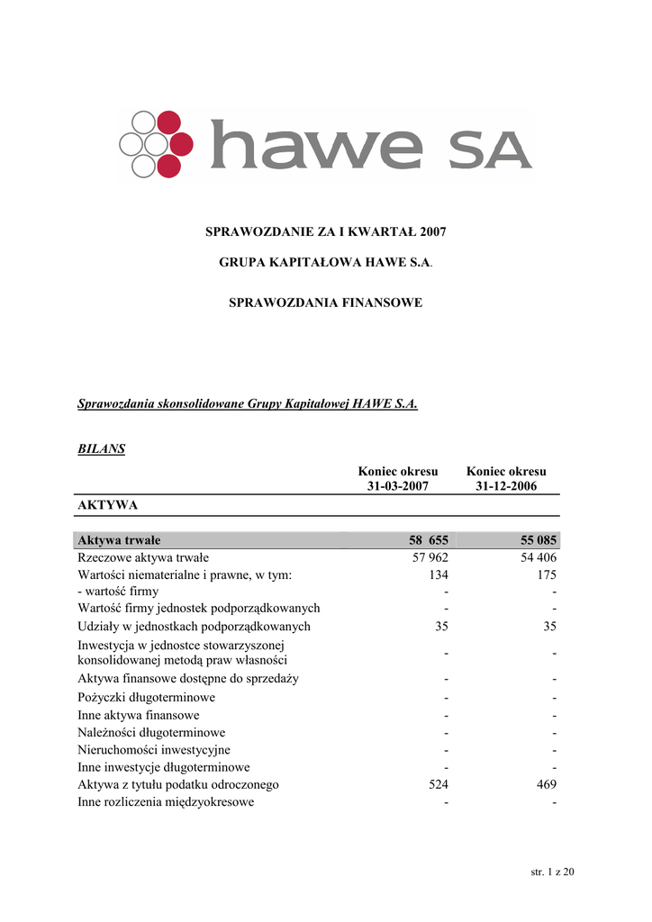 SPRAWOZDANIE ZA I KWARTAŁ 2007 GRUPA KAPITAŁOWA HAWE S.A. SPRAWOZDANIA FINANSOWE Sprawozdania skonsolidowane Grupy Kapitałowej HAWE S.A. BILANS Koniec okresu 31-03-2007 Koniec okresu 31-12-2006 AKTYWA Aktywa trwałe Rzeczowe aktywa trwałe Wartości niematerialne i prawne, w tym: - wartość firmy Wartość firmy jednostek podporządkowanych Udziały w jednostkach podporządkowanych Inwestycja w jednostce stowarzyszonej konsolidowanej metodą praw własności Aktywa finansowe dostępne do sprzedaŜy PoŜyczki długoterminowe Inne aktywa finansowe NaleŜności długoterminowe Nieruchomości inwestycyjne Inne inwestycje długoterminowe Aktywa z tytułu podatku odroczonego Inne rozliczenia międzyokresowe 58 655 57 962 134 35 55 085 54 406 175 35 - - 524 - 469 - str. 1 z 20 Aktywa obrotowe Zapasy NaleŜności handlowe NaleŜności krótkoterminowe inne PoŜyczki krótkoterminowe Aktywa finansowe przeznaczone do obrotu Środki pienięŜne i ich ekwiwalenty Rozliczenie kontraktów Krótkoterminowe rozliczenia międzyokresowe Aktywa trwałe przeznaczone do zbycia Aktywa razem 16 328 2 165 2 166 2 945 655 2 835 5 210 352 - 11 706 1 130 1 749 2 024 1 608 760 4 361 74 - 74 983 66 791 Koniec okresu 31-03-2007 Koniec okresu 31-12-2006 PASYWA Kapitał własny Kapitał podstawowy Udziały (akcje) własne (-) Kapitały zapasowy ze sprzedaŜy akcji powyŜej ceny nominalnej Kapitały zapasowy Kapitał z aktualizacji wyceny RóŜnice kursowe z wyceny jednostek działających za granicą Pozostałe kapitały Zyski zatrzymane Zysk/ strata netto Kapitał akcjonariuszy mniejszościowych Zobowiązania długoterminowe Kredyty i poŜyczki Rezerwa z tytułu odroczonego podatku dochodowego Zobowiązania długoterminowe inne Rezerwa na świadczenia emerytalne i podobne Rezerwy na zobowiązania Zobowiązania krótkoterminowe Kredyty i poŜyczki - część bieŜąca Zobowiązania handlowe Zobowiązania podatkowe Zobowiązania krótkoterminowe inne 27 251 4 539 - 24 201 548 - - - 23 986 - 24 172 - - - 222 -519 -977 16 422 500 1 432 -1 951 13 488 530 1 577 1 396 14 299 11 537 17 17 29 31 310 2 421 7 745 1 610 19 362 8 29 102 15 536 6 957 1 338 5 089 str. 2 z 20 Rezerwa na świadczenia emerytalne i podobne Rezerwy na zobowiązania Zobowiązania bezpośrednio związane z aktywami trwałymi klasyfikowanymi jako przeznaczone do sprzedaŜy Pasywa razem Wartość księgowa akcji w tys. zł Liczba akcji w szt. Wartość księgowa na jedną akcję w zł 1 171 1 181 - - 74 983 66 791 27 251 4 539 156 6,00 24 201 8 956 2 702,21 1 508 600 600 908 908 1 553 1 553 3 061 1 508 600 600 908 908 1 508 POZYCJE POZABILANSOWE 1. NaleŜności warunkowe 2. Zobowiązanie warunkowe 2.1. Na rzecz jednostek powiązanych z tytułu: - poręczeń wekslowych 2.2. Na rzecz pozostałych jednostek, z tytuły: - gwarancji dobrego wykonania umowy 3. Inne - opcje na akcje Pozycje pozabilansowe razem RACHUNEK WYNIKÓW Za okres od 01-01-2007 do 31-03-2007 Za okres od 01-01-2006 do 31-03-2006 RACHUNEK ZYSKÓW I STRAT Przychody netto ze sprzedaŜy produktów i usług Przychody netto ze sprzedaŜy towarów i materiałów Koszt własny sprzedaŜy Zysk (strata) brutto ze sprzedaŜy Pozostałe przychody operacyjne Koszty sprzedaŜy i dystrybucji Koszty ogólnego zarządu Pozostałe koszty operacyjne Zysk (strata) z działalności operacyjnej Koszty finansowe 2 937 8 438 89 175 3 459 -433 101 434 3 025 78 5 384 3 229 393 1 345 122 -3 869 2 155 299 201 str. 3 z 20 Zysk (strata) na sprzedaŜy całości lub części udziałów jednostek podporządkowanych Przychody finansowe Udział w zyskach (stratach) netto jednostek stowarzyszonych Odpis jednorazowy ujemnej wartości firmy Zysk (strata) przed opodatkowaniem Podatek dochodowy Zyski (straty) udziałów w jedn. podporządkowanych konsolidowanych metodą praw własności Zyski (straty) mniejszości Zysk (strata) netto z działalności kontynuowanej Działalność zaniechana Strata netto z działalności zaniechanej Zysk (strata) netto Zysk (strata) na jedną akcję: - z działalności zaniechanej - z działalności kontynuowanej - - 107 2 - - 3312 -749 228 1 956 -1 387 - - - - -977 3 343 -977 3 343 -0,22 -0,22 373,27 373,27 Zestawienie ze zmian w kapitale własnym Za okres od 01-01-2007 do 31-03-2007 Kapitał (fundusz) własny na początek okresu (BO) – korekty błędów podstawowych Kapitał (fundusz) własny na początek okresu (BO) po korektach błędów podstawowych Kapitał (fundusz) podstawowy na początek okresu Zmiany kapitału (funduszu) podstawowego a) zwiększenie (z tytułu) – wydania udziałów (emisji akcji) b) zmniejszenie (z tytułu) – odpisanie części korekty hiperinflacyjnej przydającej umorzonym udziałom Kapitał (fundusz) podstawowy na koniec okresu Udziały (akcje) własne na początek okresu a) zwiększenie Za okres od 01-01-2006 do 31-03-2006 24 201 20 623 -- - 24 201 20 623 548 490 3 991 3 991 3 991 - 10 10 10 - - - 4 539 500 - - str. 4 z 20 b) zmniejszenie Udziały (akcje własne) na koniec okresu Kapitał (fundusz) zapasowy na początek okresu Zmiany kapitału (funduszu) zapasowego a) zwiększenie (z tytułu) – z podziału zysku – korekta wypłaconej w ramach Grupy dywidendy - emisja akcji powyŜej ceny nominalnej 24 172 -186 - 9 358 -- - - - - b) zmniejszenie (z tytułu) – korekta pozostałego kapitału przeznaczonego na dywidendy – korekta kosztów emisji Stan kapitału (funduszu) zapasowego na koniec okresu Kapitał (fundusz) z aktualizacji wyceny na początek okresu Zmiany kapitału (funduszu) z aktualizacji wyceny a) zwiększenie (z tytułu) – aktualizacja wyceny inwestycji b) zmniejszenie (z tytułu) – zbycia środków trwałych – aktualizacja wyceny inwestycji Kapitał (fundusz) z aktualizacji wyceny na koniec okresu Pozostałe kapitały (fundusze) na początek okresu Zmiany pozostałych kapitałów (funduszy) a) zwiększenie (z tytułu) - rozliczenie opcji na akcje b) zmniejszenie (z tytułu) Pozostałe kapitały (fundusze) na koniec okresu RóŜnice kurso