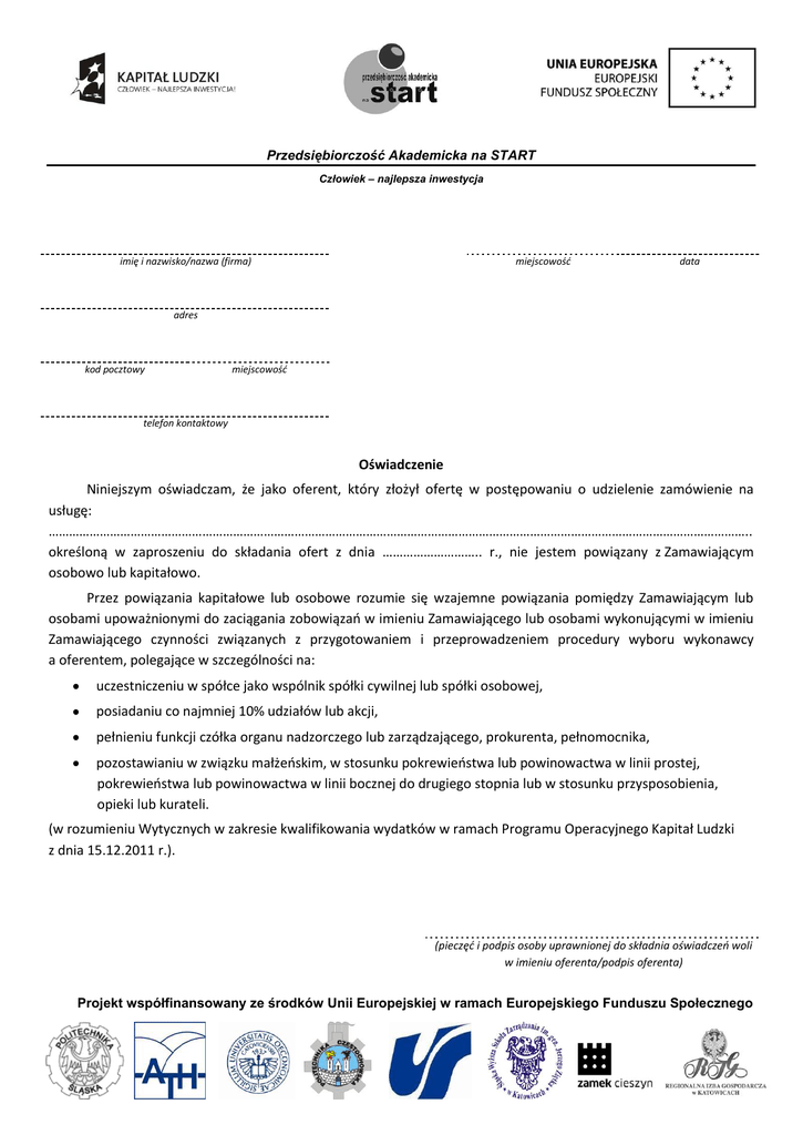 Przedsiębiorczość Akademicka na START Człowiek – najlepsza inwestycja imię i nazwisko/nazwa (firma) miejscowość data adres kod pocztowy miejscowość telefon kontaktowy Oświadczenie Niniejszym oświadczam, że jako oferent, który złożył ofertę w postępowaniu o udzielenie zamówienie na usługę: …………………………………………………………………………………………………………………………………………………………………………………….. określoną w zaproszeniu do składania ofert z dnia ……………………….. r., nie jestem powiązany z Zamawiającym osobowo lub kapitałowo. Przez powiązania kapitałowe lub osobowe rozumie się wzajemne powiązania pomiędzy Zamawiającym lub osobami upoważnionymi do zaciągania zobowiązań w imieniu Zamawiającego lub osobami wykonującymi w imieniu Zamawiającego czynności związanych z przygotowaniem i przeprowadzeniem procedury wyboru wykonawcy a oferentem, polegające w szczególności na: uczestniczeniu w spółce jako wspólnik spółki cywilnej lub spółki osobowej, posiadaniu co najmniej 10% udziałów lub akcji, pełnieniu funkcji czółka organu nadzorczego lub zarządzającego, prokurenta, pełnomocnika, pozostawianiu w związku małżeńskim, w stosunku pokrewieństwa lub powinowactwa w linii prostej, pokrewieństwa lub powinowactwa w linii bocznej do drugiego stopnia lub w stosunku przysposobienia, opieki lub kurateli. (w rozumieniu Wytycznych w zakresie kwalifikowania wydatków w ramach Programu Operacyjnego Kapitał Ludzki z dnia 15.12.2011 r.). (pieczęć i podpis osoby uprawnionej do składnia oświadczeń woli w imieniu oferenta/podpis oferenta) Projekt współfinansowany ze środków Unii Europejskiej w ramach Europejskiego Funduszu Społecznego