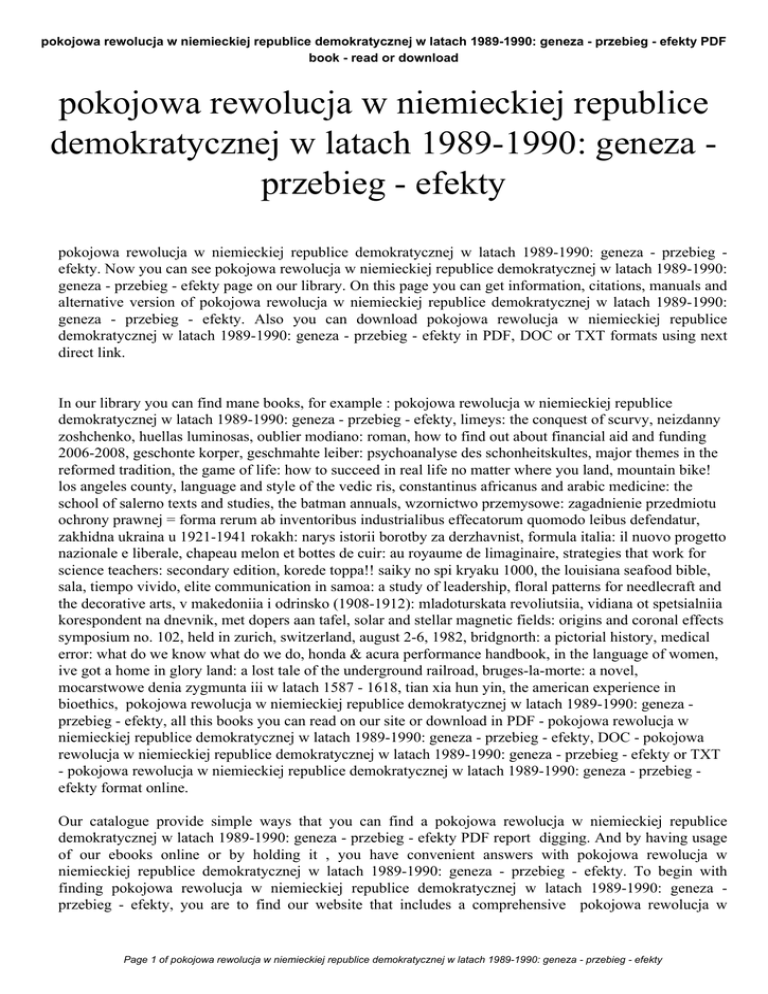 pokojowa rewolucja w niemieckiej republice demokratycznej w latach 1989-1990: geneza - przebieg - efekty PDF book - read or download pokojowa rewolucja w niemieckiej republice demokratycznej w latach 1989-1990: geneza przebieg - efekty pokojowa rewolucja w niemieckiej republice demokratycznej w latach 1989-1990: geneza - przebieg efekty. Now you can see pokojowa rewolucja w niemieckiej republice demokratycznej w latach 1989-1990: geneza - przebieg - efekty page on our library. On this page you can get information, citations, manuals and alternative version of pokojowa rewolucja w niemieckiej republice demokratycznej w latach 1989-1990: geneza - przebieg - efekty. Also you can download pokojowa rewolucja w niemieckiej republice demokratycznej w latach 1989-1990: geneza - przebieg - efekty in PDF, DOC or TXT formats using next direct link. In our library you can find mane books, for example : pokojowa rewolucja w niemieckiej republice demokratycznej w latach 1989-1990: geneza - przebieg - efekty, limeys: the conquest of scurvy, neizdanny zoshchenko, huellas luminosas, oublier modiano: roman, how to find out about financial aid and funding 2006-2008, geschonte korper, geschmahte leiber: psychoanalyse des schonheitskultes, major themes in the reformed tradition, the game of life: how to succeed in real life no matter where you land, mountain bike! los angeles county, language and style of the vedic ris, constantinus africanus and arabic medicine: the school of salerno texts and studies, the batman annuals, wzornictwo przemysowe: zagadnienie przedmiotu ochrony prawnej = forma rerum ab inventoribus industrialibus effecatorum quomodo leibus defendatur, zakhidna ukraina u 1921-1941 rokakh: narys istorii borotby za derzhavnist, formula italia: il nuovo progetto nazionale e liberale, chapeau melon et bottes de cuir: au royaume de limaginaire, strategies that work for science teachers: secondary edition, korede toppa!! saiky no spi kryaku 1000, the louisiana seafood bible, sala, tiempo vivido, elite communication in samoa: a study of leadership, floral patterns for needlecraft and the decorative arts, v makedoniia i odrinsko (1908-1912): mladoturskata revoliutsiia, vidiana ot spetsialniia korespondent na dnevnik, met dopers aan tafel, solar and stellar magnetic fields: origins and coronal effects symposium no. 102, held in zurich, switzerland, august 2-6, 1982, bridgnorth: a pictorial history, medical error: what do we know what do we do, honda & acura performance handbook, in the language of women, ive got a home in glory land: a lost tale of the underground railroad, bruges-la-morte: a novel, mocarstwowe denia zygmunta iii w latach 1587 - 1618, tian xia hun yin, the american experience in bioethics, pokojowa rewolucja w niemieckiej republice demokratycznej w latach 1989-1990: geneza przebieg - efekty, all this books you can read on our site or download in PDF - pokojowa rewolucja w niemieckiej republice demokratycznej w latach 1989-1990: geneza - przebieg - efekty, DOC - pokojowa rewolucja w niemieckiej republice demokratycznej w latach 1989-1990: geneza - przebieg - efekty or TXT - pokojowa rewolucja w niemieckiej republice demokratycznej w latach 1989-1990: geneza - przebieg efekty format online. Our catalogue provide simple ways that you can find a pokojowa rewolucja w niemieckiej republice demokratycznej w latach 1989-1990: geneza - przebieg - efekty PDF report digging. And by having usage of our ebooks online or by holding it , you have convenient answers with pokojowa rewolucja w niemieckiej republice demokratycznej w latach 1989-1990: geneza - przebieg - efekty. To begin with finding pokojowa rewolucja w niemieckiej republice demokratycznej w latach 1989-1990: geneza przebieg - efekty, you are to find our website that includes a comprehensive pokojowa rewolucja w Page 1 of pokojowa rewolucja w niemieckiej republice demokratycznej w latach 1989-1990: geneza - przebieg - efekty pokojowa rewolucja w niemieckiej republice demokratycznej w latach 1989-1990: geneza - przebieg - efekty PDF book - read or download niemieckiej republice demokratycznej w latach 1989-1990: geneza - przebieg - efekty manuals listed. These review site is the biggest of these which may have pokojowa rewolucja w niemieckiej republice demokratycznej w latach 1989-1990: geneza - przebieg - efekty, literally hundreds of thousands of different products represented. You will see that there are particular sites catered to different product also types or categories, brands or niches related with pokojowa rewolucja w niemieckiej republice demokratycznej w latach 1989-1990: geneza - przebieg - efekty. So depending on what exactly you are searching, you shall be able to choose ebooks pokojowa rewolucja w niemieckiej republice demokratycznej w latach 1989-1990: geneza - przebieg - efekty to fit your own needs, pokojowa rewolucja w niemieckiej republice demokratycznej w latach 1989-1990: geneza - przebieg - efekty. Page 2 of pokojowa rewolucja w niemieckiej republice demokratycznej w latach 1989-1990: geneza - przebieg - efekty