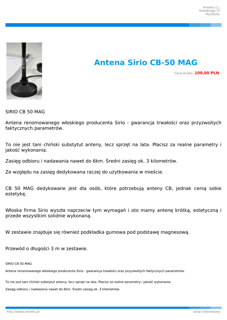 Anneks s.c. Pułaskiego 37 Myszków Antena Sirio CB-50 MAG Cena brutto: 109,00 PLN SIRIO CB 50 MAG Antena renomowanego włoskiego producenta Sirio - gwarancja trwałości oraz przyzwoitych faktycznych parametrów. To nie jest tani chiński substytut anteny, lecz sprzęt na lata. Płacisz za realne parametry i jakość wykonania. Zasięg odbioru i nadawania nawet do 6km. Średni zasięg ok. 3 kilometrów. Ze względu na zasięg dedykowana raczej do użytkowania w mieście. CB 50 MAG dedykowane jest dla osób, które potrzebują anteny CB, jednak cenią sobie estetykę. Włoska firma Sirio wyszła naprzeciw tym wymagań i oto mamy antenę krótką, estetyczną i przede wszystkim solidnie wykonaną. W zestawie znajduje się również podkładka gumowa pod podstawę magnesową. Przewód o długości 3 m w zestawie. SIRIO CB 50 MAG Antena renomowanego włoskiego producenta Sirio - gwarancja trwałości oraz przyzwoitych faktycznych parametrów. To nie jest tani chiński substytut anteny, lecz sprzęt na lata. Płacisz za realne parametry i jakość wykonania. Zasięg odbioru i nadawania nawet do 6km. Średni zasięg ok. 3 kilometrów. http://sklep.anneks.pl sklep internetowy Anneks s.c. Pułaskiego 37 Myszków Ze względu na zasięg dedykowana raczej do użytkowania w mieście. CB 50 MAG dedykowane jest dla osób, które potrzebują anteny CB, jednak cenią sobie estetykę. Włoska firma Sirio wyszła naprzeciw tym wymagań i oto mamy antenę krótką, estetyczną i przede wszystkim solidnie wykonaną. W zestawie znajduje się również podkładka gumowa pod podstawę magnesową. Przewód o długości 3 m w zestawie. Funkcjonalność: Idealne połączenie praktyczności i zadowalającego zasięgu - nawet do 6 kilometrów. Jakość Sirio - produkcja Włochy Bardzo łatwa do wystrojenia Elegancki minimalistyczny design - na aucie z ciemnym lakierem praktycznie niewidzialna Bardzo konkurencyjna na tle innych anten 50cm Specyfikacja Produkcja: Włochy Częstotliwość pracy: 27.000 - 27.400 MHz Długość anteny: 50cm SWR na #20: ok. 1,2 Moc: 30W PEP Impedancja: 50 Ohm Średnica podstawy magnetycznej: 70mm Podkładka gumowa Długość przewodu 3m Przewód zakończony wtykiem UC-1 (pasującym do każdego CB radia) http://sklep.anneks.pl sklep internetowy