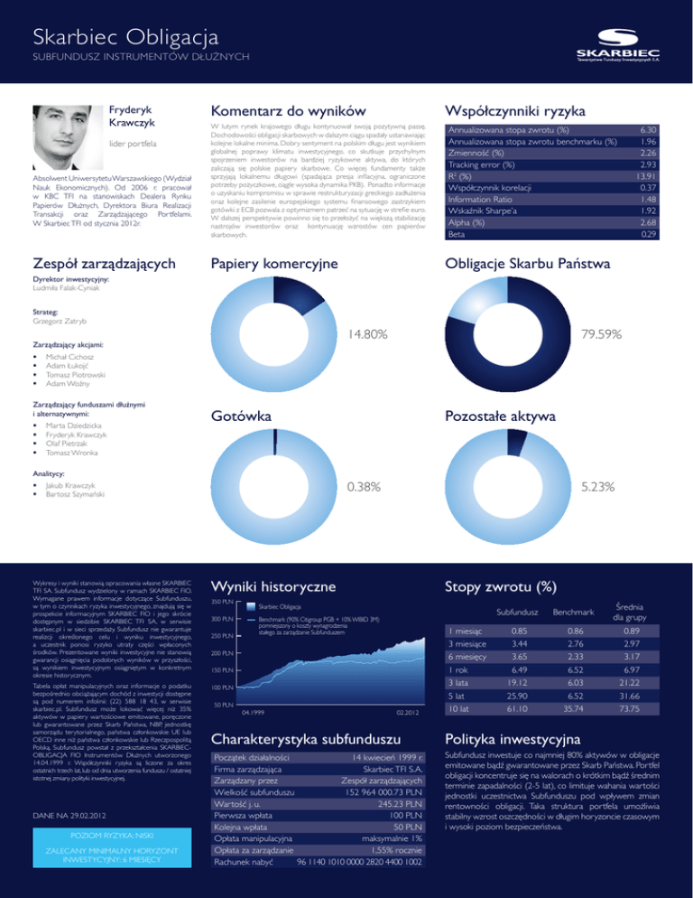 Skarbiec Obligacja SUBFUNDUSZ INSTRUMENTÓW DŁUŻNYCHv Fryderyk Krawczyk lider portfela Absolwent Uniwersytetu Warszawskiego (Wydział Nauk Ekonomicznych). Od 2006 r. pracował w KBC TFI na stanowiskach Dealera Rynku Papierów Dłużnych, Dyrektora Biura Realizacji Transakcji oraz Zarządzającego Portfelami. W Skarbiec TFI od stycznia 2012r. Zespół zarządzających Komentarz do wyników Współczynniki ryzyka W lutym rynek krajowego długu kontynuował swoją pozytywną passę. Dochodowości obligacji skarbowych w dalszym ciągu spadały ustanawiając kolejne lokalne minima. Dobry sentyment na polskim długu jest wynikiem globalnej poprawy klimatu inwestycyjnego, co skutkuje przychylnym spojrzeniem inwestorów na bardziej ryzykowne aktywa, do których zaliczają się polskie papiery skarbowe. Co więcej fundamenty także sprzyjają lokalnemu długowi (spadająca presja inflacyjna, ograniczone potrzeby pożyczkowe, ciągle wysoka dynamika PKB). Ponadto informacje o uzyskaniu kompromisu w sprawie restrukturyzacji greckiego zadłużenia oraz kolejne zasilenie europejskiego systemu finansowego zastrzykiem gotówki z ECB pozwala z optymizmem patrzeć na sytuację w strefie euro. W dalszej perspektywie powinno się to przełożyć na większą stabilizację nastrojów inwestorów oraz kontynuację wzrostów cen papierów skarbowych. Papiery komercyjne Annualizowana stopa zwrotu (%) Annualizowana stopa zwrotu benchmarku (%) Zmienność (%) Tracking error (%) R2 (%) Współczynnik korelacji Information Ratio Wskaźnik Sharpe’a Alpha (%) Beta 6.30 1.96 2.26 2.93 13.91 0.37 1.48 1.92 2.68 0.29 Obligacje Skarbu Państwa Dyrektor inwestycyjny: Ludmiła Falak-Cyniak Strateg: Grzegorz Zatryb 14.80% Zarządzający akcjami: Michał Cichosz Adam Łukojć Tomasz Piotrowski Adam Woźny Zarządzający funduszami dłużnymi i alternatywnymi: 79.59% Marta Dziedzicka Fryderyk Krawczyk Olaf Pietrzak Tomasz Wronka Gotówka Pozostałe aktywa Analitycy: 0.38% Jakub Krawczyk Bartosz Szymański Wykresy i wyniki stanowią opracowania własne SKARBIEC TFI SA. Subfundusz wydzielony w ramach SKARBIEC FIO. Wymagane prawem informacje dotyczące Subfunduszu, w tym o czynnikach ryzyka inwestycyjnego, znajdują się w prospekcie informacyjnym SKARBIEC FIO i jego skrócie dostępnym w siedzibie SKARBIEC TFI SA, w serwisie skarbiec.pl i w sieci sprzedaży. Subfundusz nie gwarantuje realizcji określonego celu i wyniku inwestycyjnego, a uczestnik ponosi ryzyko utraty części wpłaconych środków. Prezentowane wyniki inwestycyjne nie stanowią gwarancji osiągnięcia podobnych wyników w przyszłości, są wynikiem inwestycyjnym osiągniętym w konkretnym okresie historycznym. Wyniki historyczne Tabela opłat manipulacyjnych oraz informacje o podatku bezpośrednio obciążającym dochód z inwestycji dostępne są pod numerem infolinii: (22) 588 18 43, w serwisie skarbiec.pl. Subfundusz może lokować więcej niż 35% aktywów w papiery wartościowe emitowane, poręczone lub gwarantowane przez Skarb Państwa, NBP, jednostkę samorządu terytorialnego, państwa członkowskie UE lub OECD inne niż państwa członkowskie lub Rzeczpospolitą Polską. Subfundusz powstał z przekształcenia SKARBIECOBLIGACJA FIO Instrumentów Dłużnych utworzonego 14.04.1999 r. Współczynniki ryzyka są liczone za okres ostatnich trzech lat, lub od dnia utworzenia funduszu / ostatniej istotnej zmiany polityki inwestycyjnej. 100PLN DANE NA 29.02.2012 POZIOM RYZYKA: NISKI ZALECANY MINIMALNY HORYZONT INWESTYCYJNY: 6 MIESIĘCY 350PLN 5.23% Stopy zwrotu (%) Subfundusz Benchmark Średnia dla grupy 1 miesiąc 0.85 0.86 0.89 3 miesiące 3.44 2.76 2.97 200PLN 6 miesięcy 3.65 2.33 3.17 150PLN 1 rok 6.49 6.52 6.97 3 lata 19.12 6.03 21.22 5 lat 25.90 6.52 31.66 10 lat 61.10 35.74 73.75 300PLN 250PLN SkarbiecObligacja Benchmark(90%CitigroupPGB+10%WIBID3M) pomniejszonyokosztywynagrodzenia stałego za zarządzanie Subfunduszem 50PLN 04.1999 02.2012 Charakterystyka subfunduszu Początek działalności 14 kwiecień 1999 r. Firma zarządzająca Skarbiec TFI S.A. Zarządzany przez Zespół zarządzających Wielkość subfunduszu 152 964 000.73 PLN Wartość j. u. 245.23 PLN Pierwsza wpłata 100 PLN Kolejna wpłata 50 PLN Opłata manipulacyjna maksymalnie 1% Opłata za zarządzanie 1,55% rocznie Rachunek nabyć 96 1140 1010 0000 2820 4400 1002 Polityka inwestycyjna Subfundusz inwestuje co najmniej 80% aktywów w obligacje emitowane bądź gwarantowane przez Skarb Państwa. Portfel obligacji koncentruje się na walorach o krótkim bądź średnim terminie zapadalności (2-5 lat), co limituje wahania wartości jednostki uczestnictwa Subfunduszu pod wpływem zmian rentowności obligacji. Taka struktura portfela umożliwia stabilny wzrost oszczędności w długim horyzoncie czasowym i wysoki poziom bezpieczeństwa.