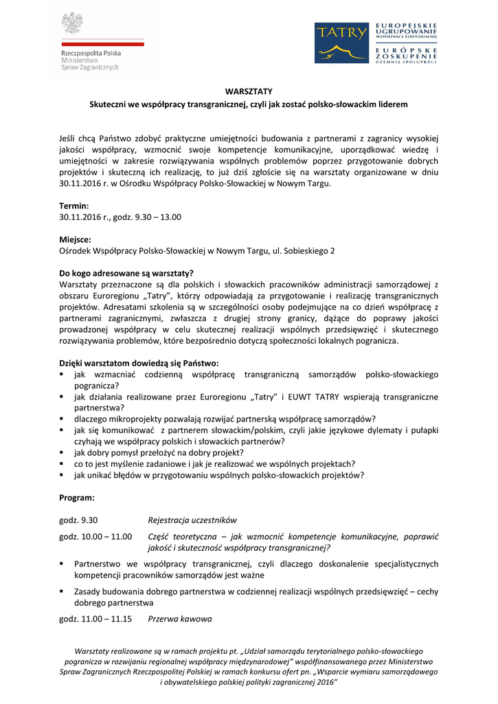 WARSZTATY Skuteczni we współpracy transgranicznej, czyli jak zostać polsko-słowackim liderem Jeśli chcą Państwo zdobyć praktyczne umiejętności budowania z partnerami z zagranicy wysokiej jakości współpracy, wzmocnić swoje kompetencje komunikacyjne, uporządkować wiedzę i umiejętności w zakresie rozwiązywania wspólnych problemów poprzez przygotowanie dobrych projektów i skuteczną ich realizację, to już dziś zgłoście się na warsztaty organizowane w dniu 30.11.2016 r. w Ośrodku Współpracy Polsko-Słowackiej w Nowym Targu. Termin: 30.11.2016 r., godz. 9.30 – 13.00 Miejsce: Ośrodek Współpracy Polsko-Słowackiej w Nowym Targu, ul. Sobieskiego 2 Do kogo adresowane są warsztaty? Warsztaty przeznaczone są dla polskich i słowackich pracowników administracji samorządowej z obszaru Euroregionu „Tatry”, którzy odpowiadają za przygotowanie i realizację transgranicznych projektów. Adresatami szkolenia są w szczególności osoby podejmujące na co dzień współpracę z partnerami zagranicznymi, zwłaszcza z drugiej strony granicy, dążące do poprawy jakości prowadzonej współpracy w celu skutecznej realizacji wspólnych przedsięwzięć i skutecznego rozwiązywania problemów, które bezpośrednio dotyczą społeczności lokalnych pogranicza. Dzięki warsztatom dowiedzą się Państwo: jak wzmacniać codzienną współpracę transgraniczną samorządów polsko-słowackiego pogranicza? jak działania realizowane przez Euroregionu „Tatry” i EUWT TATRY wspierają transgraniczne partnerstwa? dlaczego mikroprojekty pozwalają rozwijać partnerską współpracę samorządów? jak się komunikować z partnerem słowackim/polskim, czyli jakie językowe dylematy i pułapki czyhają we współpracy polskich i słowackich partnerów? jak dobry pomysł przełożyć na dobry projekt? co to jest myślenie zadaniowe i jak je realizować we wspólnych projektach? jak unikać błędów w przygotowaniu wspólnych polsko-słowackich projektów? Program: godz. 9.30 Rejestracja uczestników godz. 10.00 – 11.00 Część teoretyczna – jak wzmocnić kompetencje komunikacyjne, poprawić jakość i skuteczność współpracy transgranicznej? Partnerstwo we współpracy transgranicznej, czyli dlaczego doskonalenie specjalistycznych kompetencji pracowników samorządów jest ważne Zasady budowania dobrego partnerstwa w codziennej realizacji wspólnych przedsięwzięć – cechy dobrego partnerstwa godz. 11.00 – 11.15 Przerwa kawowa Warsztaty realizowane są w ramach projektu pt. „Udział samorządu terytorialnego polsko-słowackiego pogranicza w rozwijaniu regionalnej współpracy międzynarodowej” współfinansowanego przez Ministerstwo Spraw Zagranicznych Rzeczpospolitej Polskiej w ramach konkursu ofert pn. „Wsparcie wymiaru samorządowego i obywatelskiego polskiej polityki zagranicznej 2016” godz. 11.15 – 12.45 samorządów? Część praktyczna – jak być skutecznym we współpracy transgranicznej „Kamyczek do ogródka sąsiada”, czyli o bliskości języków polskiego i słowackiego, która jednocześnie pomaga i przeszkadza, o konieczności tłumaczenia lub jej braku, o rodzajach tłumaczenia i współpracy z tłumaczem Analiza przykładów przygotowania dobrych i złych mikroprojektów w Programie Interreg V-A Polska-Słowacja 2014-2020, najczęściej popełniane błędy podczas pierwszego naboru wniosków, praktyczne wskazówki Myślenie koncepcyjne i zadaniowe – planowanie i realizacja wspólnych projektów – praca w PLSK grupach nad wspólnymi przedsięwzięciami rozwiązującymi problemy pogranicza Dyskusja i ankieta 13.00 Obiad Warunki uczestnictwa w warsztatach: Uczestnictwo w warsztatach jest bezpłatne. O udziale w warsztatach decyduje kolejność zgłoszeń. Warsztaty prowadzone będą w języku polskim. Zapewnione zostanie tłumaczenie symultaniczne na język słowacki. Počas konferencie bude zabezpečené simultánne tlmočenie z/do poľštiny a slovenčiny. Organizator warsztatów zapewnia wyżywienie oraz materiały warsztatowe. Uczestnicy we własnym zakresie ponoszą koszty dojazdu na warsztaty i koszty ewentualnego zakwaterowania. Na zakończenie warsztatów przeprowadzona zostanie wśród uczestników ankieta dotycząca deklarowanego wzrostu umiejętności współpracy z partnerem słowackim/polskim oraz wzmocnienia kompetencji. Zgłoszenia uczestnictwa: Zgłoszenia przyjmowane są poprzez https://goo.gl/forms/sLsflmrLcLT0m5bJ2 formularz rejestracyjny on-line dostępny tutaj Warsztaty realizowane są w ramach projektu pt. „Udział samorządu terytorialnego polsko-słowackiego pogranicza w rozwijaniu regionalnej współpracy międzynarodowej” współfinansowanego przez Ministerstwo Spraw Zagranicznych Rzeczpospolitej Polskiej w ramach konkursu ofert pn. „Wsparcie wymiaru samorządowego i obywatelskiego polskiej polityki zagranicznej 2016”
