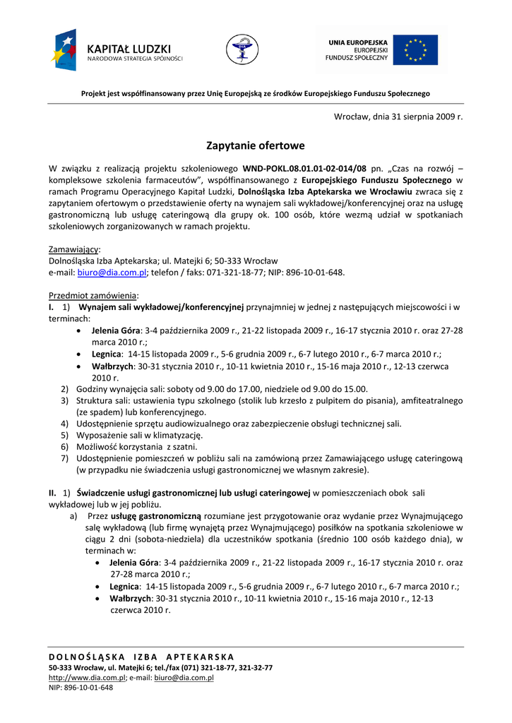 Projekt jest współfinansowany przez Unię Europejską ze środków Europejskiego Funduszu Społecznego Wrocław, dnia 31 sierpnia 2009 r. Zapytanie ofertowe W związku z realizacją projektu szkoleniowego WND-POKL.08.01.01-02-014/08 pn. „Czas na rozwój – kompleksowe szkolenia farmaceutów”, współfinansowanego z Europejskiego Funduszu Społecznego w ramach Programu Operacyjnego Kapitał Ludzki, Dolnośląska Izba Aptekarska we Wrocławiu zwraca się z zapytaniem ofertowym o przedstawienie oferty na wynajem sali wykładowej/konferencyjnej oraz na usługę gastronomiczną lub usługę cateringową dla grupy ok. 100 osób, które wezmą udział w spotkaniach szkoleniowych zorganizowanych w ramach projektu. Zamawiający: Dolnośląska Izba Aptekarska; ul. Matejki 6; 50-333 Wrocław e-mail: [email protected]; telefon / faks: 071-321-18-77; NIP: 896-10-01-648. Przedmiot zamówienia: I. 1) Wynajem sali wykładowej/konferencyjnej przynajmniej w jednej z następujących miejscowości i w terminach: Jelenia Góra: 3-4 października 2009 r., 21-22 listopada 2009 r., 16-17 stycznia 2010 r. oraz 27-28 marca 2010 r.; Legnica: 14-15 listopada 2009 r., 5-6 grudnia 2009 r., 6-7 lutego 2010 r., 6-7 marca 2010 r.; Wałbrzych: 30-31 stycznia 2010 r., 10-11 kwietnia 2010 r., 15-16 maja 2010 r., 12-13 czerwca 2010 r. 2) Godziny wynajęcia sali: soboty od 9.00 do 17.00, niedziele od 9.00 do 15.00. 3) Struktura sali: ustawienia typu szkolnego (stolik lub krzesło z pulpitem do pisania), amfiteatralnego (ze spadem) lub konferencyjnego. 4) Udostępnienie sprzętu audiowizualnego oraz zabezpieczenie obsługi technicznej sali. 5) Wyposażenie sali w klimatyzację. 6) Możliwośd korzystania z szatni. 7) Udostępnienie pomieszczeo w pobliżu sali na zamówioną przez Zamawiającego usługę cateringową (w przypadku nie świadczenia usługi gastronomicznej we własnym zakresie). II. 1) Świadczenie usługi gastronomicznej lub usługi cateringowej w pomieszczeniach obok sali wykładowej lub w jej pobliżu. a) Przez usługę gastronomiczną rozumiane jest przygotowanie oraz wydanie przez Wynajmującego salę wykładową (lub firmę wynajętą przez Wynajmującego) posiłków na spotkania szkoleniowe w ciągu 2 dni (sobota-niedziela) dla uczestników spotkania (średnio 100 osób każdego dnia), w terminach w: Jelenia Góra: 3-4 października 2009 r., 21-22 listopada 2009 r., 16-17 stycznia 2010 r. oraz 27-28 marca 2010 r.; Legnica: 14-15 listopada 2009 r., 5-6 grudnia 2009 r., 6-7 lutego 2010 r., 6-7 marca 2010 r.; Wałbrzych: 30-31 stycznia 2010 r., 10-11 kwietnia 2010 r., 15-16 maja 2010 r., 12-13 czerwca 2010 r. DOLNOŚLĄSKA IZBA APTEKARSKA 50-333 Wrocław, ul. Matejki 6; tel./fax (071) 321-18-77, 321-32-77 http://www.dia.com.pl; e-mail: [email protected] NIP: 896-10-01-648 Projekt jest współfinansowany przez Unię Europejską ze środków Europejskiego Funduszu Społecznego b) Przez usługę cateringową rozumiane jest: przygotowanie posiłków na organizowane spotkania szkoleniowe w ciągu 2 dni (sobota-niedziela) dla uczestników spotkania (średnio 100 osób każdego dnia), w terminach w: Jelenia Góra: 3-4 października 2009 r., 21-22 listopada 2009 r., 16-17 stycznia 2010 r. oraz 27-28 marca 2010 r.; Legnica: 14-15 listopada 2009 r., 5-6 grudnia 2009 r., 6-7 lutego 2010 r., 6-7 marca 2010 r.; Wałbrzych: 30-31 stycznia 2010 r., 10-11 kwietnia 2010 r., 15-16 maja 2010 r., 12-13 czerwca 2010 r. wraz z dostarczeniem ich na wskazane przez Zamawiającego miejsce szkolenia na terenie miasta (Jelenia Góra lub Legnica lub Wałbrzych), rozłożenie na własnych naczyniach stołowych oraz uprzątnięcie lokalu po spożyciu posiłków. 2) Szczegóły zamówienia: w soboty (ok. godz. 11.30) przewidziany jest jeden poczęstunek typu: kanapki, słodkie bułki, deser, soki, woda, herbata i kawa oraz drugi poczęstunek (ok. godz.14.30) zawierający danie ciepłe, przystawki (np. sałatki), soki, wodę, herbatę i kawę; w niedziele (ok. godz. 12.20) przewidziany jest poczęstunek typu: kanapki, słodkie bułki, deser, soki, woda, herbata i kawa. 3) Ostateczna liczba uczestników spotkania zostanie podana na 2 dni przed planowanymi terminami szkoleo. 4) Przewidziany koszt usługi gastronomicznej/cateringowej na 1 osobę za dwudniowe spotkanie szkoleniowe wynosi 59,00 zł brutto. Średnia cena usługi gastronomicznej/cateringowej dla grupy 100 osobowej za dwudniowe spotkanie szkoleniowe wynosi zatem 5 900,00 zł brutto (tj. 59,00 zł x 100 osób = 5 900,00 zł). Całkowita wartośd brutto zamówienia w przypadku usługi gastronomicznej/ cateringowej nie może przekroczyd kwoty będącej wynikiem mnożenia liczby dwudniowych spotkao oraz ceny usługi za spotkanie na poziomie 5 900,00 zł. Zamawiający zastrzega, a oferent dopuszcza możliwośd rezygnacji lub zmiany terminu realizacji zamówienia na 2 tygodnie przez planowanym terminem szkolenia, bez żadnych skutków finansowych. Zamawiający dopuszcza możliwośd składania ofert częściowych. Miejsce i termin złożenia oferty: Siedziba Dolnośląskiej Izby Aptekarskiej: Wrocław ul. Matejki 6 lub przesład faksem na nr telefonu: (071) 321-18-77 lub e-mailowo: [email protected] do 08 września 2009 r. do godz. 14.00. Kryteria oceny ofert: Kryterium oceny składanej oferty będzie cena brutto za wynajem sali wykładowej/konferencyjnej posiadającej klimatyzację wraz z dodatkowymi usługami tj. możliwością korzystania z szatni, udostępnieniem sprzętu audiowizualnego, obsługą techniczną sali i udostępnionego sprzętu oraz wykonaniem usługi gastronomicznej lub możliwością wprowadzenia własnego cateringu za 4 spotkania szkoleniowe w ciągu 2 dni (sobota-niedziela) odbywające się w jednej miejscowości; Kryterium oceny składanej oferty na usługę gastronomiczną/cateringową będzie zawartośd (różnorodnośd) menu oferty w stosunku do ceny za całą ofertę. Formularz oferty: Formularz oferty stanowi załącznik nr 1. DOLNOŚLĄSKA IZBA APTEKARSK