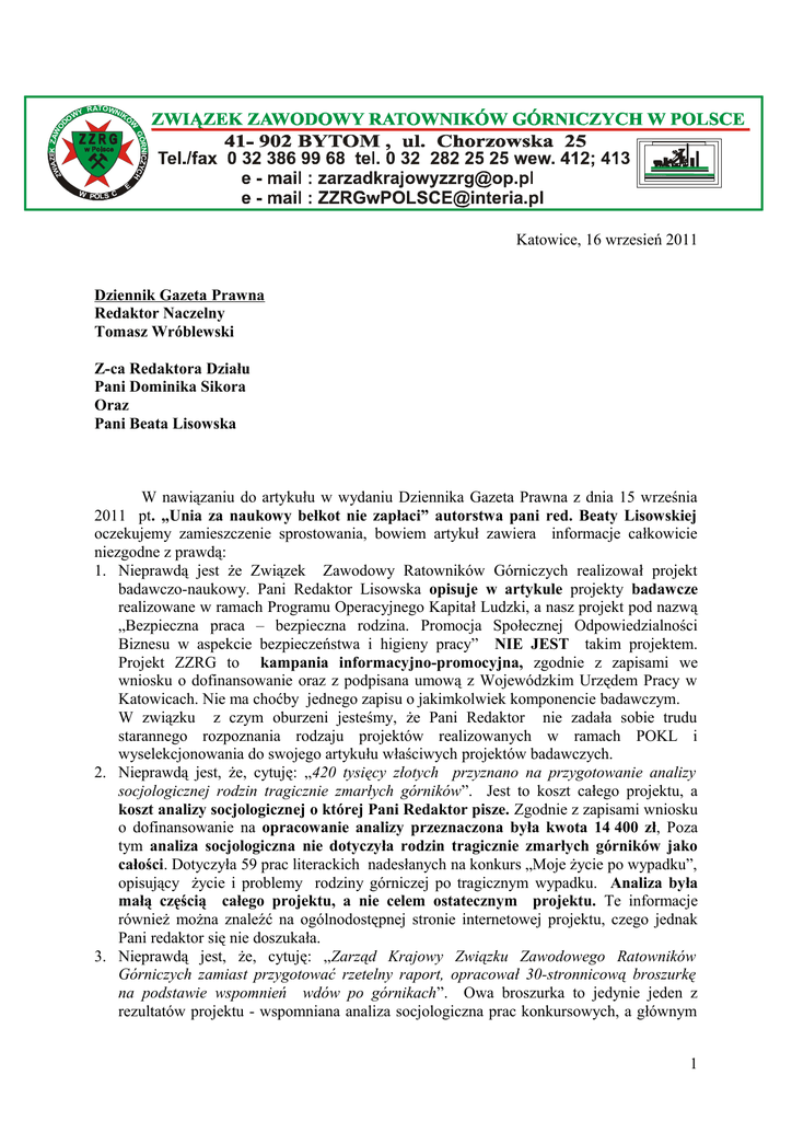 W D RATOWN IK WY Ó RNICZYC GÓ H IĄZEK ZAW O ZW O W POLS C E Katowice, 16 wrzesień 2011 Dziennik Gazeta Prawna Redaktor Naczelny Tomasz Wróblewski Z-ca Redaktora Działu Pani Dominika Sikora Oraz Pani Beata Lisowska W nawiązaniu do artykułu w wydaniu Dziennika Gazeta Prawna z dnia 15 września 2011 pt. „Unia za naukowy bełkot nie zapłaci” autorstwa pani red. Beaty Lisowskiej oczekujemy zamieszczenie sprostowania, bowiem artykuł zawiera informacje całkowicie niezgodne z prawdą: 1. Nieprawdą jest że Związek Zawodowy Ratowników Górniczych realizował projekt badawczo-naukowy. Pani Redaktor Lisowska opisuje w artykule projekty badawcze realizowane w ramach Programu Operacyjnego Kapitał Ludzki, a nasz projekt pod nazwą „Bezpieczna praca – bezpieczna rodzina. Promocja Społecznej Odpowiedzialności Biznesu w aspekcie bezpieczeństwa i higieny pracy” NIE JEST takim projektem. Projekt ZZRG to kampania informacyjno-promocyjna, zgodnie z zapisami we wniosku o dofinansowanie oraz z podpisana umową z Wojewódzkim Urzędem Pracy w Katowicach. Nie ma choćby jednego zapisu o jakimkolwiek komponencie badawczym. W związku z czym oburzeni jesteśmy, że Pani Redaktor nie zadała sobie trudu starannego rozpoznania rodzaju projektów realizowanych w ramach POKL i wyselekcjonowania do swojego artykułu właściwych projektów badawczych. 2. Nieprawdą jest, że, cytuję: „420 tysięcy złotych przyznano na przygotowanie analizy socjologicznej rodzin tragicznie zmarłych górników”. Jest to koszt całego projektu, a koszt analizy socjologicznej o której Pani Redaktor pisze. Zgodnie z zapisami wniosku o dofinansowanie na opracowanie analizy przeznaczona była kwota 14 400 zł, Poza tym analiza socjologiczna nie dotyczyła rodzin tragicznie zmarłych górników jako całości. Dotyczyła 59 prac literackich nadesłanych na konkurs „Moje życie po wypadku”, opisujący życie i problemy rodziny górniczej po tragicznym wypadku. Analiza była małą częścią całego projektu, a nie celem ostatecznym projektu. Te informacje również można znaleźć na ogólnodostępnej stronie internetowej projektu, czego jednak Pani redaktor się nie doszukała. 3. Nieprawdą jest, że, cytuję: „Zarząd Krajowy Związku Zawodowego Ratowników Górniczych zamiast przygotować rzetelny raport, opracował 30-stronnicową broszurkę na podstawie wspomnień wdów po górnikach”. Owa broszurka to jedynie jeden z rezultatów projektu - wspomniana analiza socjologiczna prac konkursowych, a głównym 1 4. − − − − − − 5. 6. rezultatem jest 1000 egzemplarzy książki liczącej 420 stron ze wszystkimi 59 pracami konkursowymi oraz artykułami merytorycznymi dotyczącymi idei i funkcjonowania Społecznej Odpowiedzialności Biznesu (CSR) w branży górniczej. Nieprawdą jest, że cytuję: „Kobiety dostały po 5 tysięcy, resztę wziął zarząd”. 50 tysięcy złotych było w projekcie przeznaczone na nagrody dla laureatów najlepszych prac konkursowych, a za resztę pieniędzy w projekcie, między innymi: Zorganizowano 10 warsztatów na temat CSR dla przedsiębiorców górniczych, organizacji związkowych, pozarządowych (wynajęcie sali, wykładowców, przygotowanie i przekazanie uczestnikom materiałów merytorycznych, zapewnienie cateringu), Wydano w/w 1020 egzemplarzy książki przekazanej również do bibliotek narodowych w Polsce, Zorganizowano kampanię promocyjną w mediach, obejmującą: 42 reklamy prasowe, 2 spoty radiowe, 1 spot telewizyjny oraz wiele materiałów redakcyjnych będących efektem działań informacyjnych osób odpowiedzialnych za realizacje projektu, Wydano 500 plakatów i 2000 ulotek informacyjnych dla potencjalnych uczestników konkursu na pamiętniki w ramach kampanii informacyjnej, Zorganizowano konferencję omawiającą efekty projektu w dniu 7 września 2011 w Katowicach dla ponad 110 osób, Przygotowano opracowanie z wnioskami i wytycznymi w zakresie CSR dla przedsiębiorstw górniczych oraz wspomnianą powyżej analizę socjologiczną. Wszystkie cele projektu oraz zakładane na etapie wniosku produkty i rezultaty twarde oraz miękkie projektu zostały osiągnięte a w wielu przypadkach przekroczone, a sposób realizacji projektu w trakcie szczegółowej kontroli Instytucji Pośredniczącej został oceniony pozytywnie. W projekcie nie było żadnych pieniędzy przeznaczonych na utrzymanie biur. Są to tzw. koszty pośrednie, z których w ogóle w naszym projekcie zrezygnowano, w celu optymalnego wykorzystania środków na kampanię promocyjną. Również koszty zarządzanie projektem i obsługi finansowej przez 13 miesięcy jego realizacji mieściły się w określonym limicie środków, które można było na to przeznaczyć tworząc wniosek o dofinansowanie, a więc nie większym niż 25 % kosztów całkowitych projektu. Zdajemy sobie sprawę, że założeniem autorki artykułu było pokazanie nieprawidłowości w systemie finansowania projektów w ramach POKL. Jednak rzetelność dziennikarska wymaga dokładnego sprawdzenia źródła i potwierdzenia stawianych w artykule tez konkretnymi faktami. Pani redaktor tego nie zrobiła, a w ten sposób pomówiła instytucje i osoby zaangażowane w realizację projektu. Co więcej podważyła sens podejmowanych działań na rzecz poprawy funkcjonowania idei CSR w branży górniczej, która wciąż jest najbardziej katastrofogenna w Polsce. Z przykrością stwierdzamy, że nierzetelny i nieprawdziwy w znacznej części artykuł Pani Lisowskiej podważył sens podejmowanych działań na rzecz rodzin górniczych i zaangażowania ludzi, którzy mimo całego swojego bólu postanowili swoimi tragicznymi i bardzo intymnymi wspomnienia podzielić się z innymi pisząc prace konkursowe. Szkoda, że Pani redaktor nie zadała sobie choć przejrzenia książki o której powiedział, podczas konferencji Ksiądz Arcybiskup Damian Zimoń: „Cieszę się z tej książki, która powinna dotrzeć do szerokich rzesz. Gosp