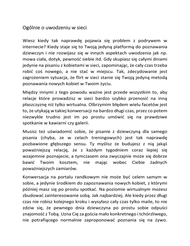 Ogólnie o uwodzeniu w sieci Wiesz kiedy tak naprawdę pojawia się problem z podrywem w internecie? Kiedy staje się to Twoją jedyną platformą do poznawania dziewczyn i nie rozwijasz się w innych aspektach uwodzenia jak np. mowa ciała, dotyk, pewność siebie itd. Gdy skupiasz się całymi dniami jedynie na pisaniu z kobietami w sieci, zapominając, że cały czas trzeba robić coś nowego, a nie stać w miejscu. Tak, zdecydowanie jest zagrożeniem sytuacja, że flirt w sieci stanie się Twoją jedyną metodą poznawania nowych kobiet w Twoim życiu. Między innymi z tego powodu ważne jest przede wszystkim to, aby relacje które prowadzisz w sieci bardzo szybko przenosić na inną płaszczyznę niż tylko wirtualna. Olbrzymim błędem wielu facetów jest to, że utykają w takiej konwersacji na bardzo długi czas, przez co potem niezwykle trudno jest im po prostu umówić się na prawdziwe spotkanie w kawiarni czy galerii. Musisz też uświadomić sobie, że pisanie z dziewczyną dla samego pisania (chyba, ze w celach treningowych) jest tak naprawdę pozbawione głębszego sensu. Ty myślisz że budujesz z nią jakąś poważniejszą relację, że z każdym tygodniem coraz lepiej się wzajemnie poznajecie, a tymczasem ona zwyczajnie może się dobrze bawić Twoim kosztem, nie mając wobec Ciebie żadnych poważniejszych zamiarów. Konwersacja na portalu randkowym nie może być celem samym w sobie, a jedynie środkiem do zapoznawania nowych kobiet, z którymi później masz się po prostu spotkać. Na poziomie wirtualnym możesz zbudować zainteresowanie sobą. Jak najbardziej. Ale kiedy przez długi czas nie robisz kolejnego kroku i wysyłasz cały czas tylko maile, to nie zdziw się, że pewnego dnia dziewczyna po prostu sobie odpuści znajomość z Tobą. Uzna Cię za gościa mało konkretnego i tchórzliwego, nie potrafiącego normalnie zaproponować poznania się na żywo. Będziesz dla niej tylko kolejnym „czającym” się na nią w internecie chłopczykiem. Umówienie się na wymianę numerów telefonów czy ustawienie wspólnego spotkania w przypadku wymiany maili raz czy dwa razy dziennie, powinno nastąpić nie dłużej niż po tygodniu. Z drugiej strony nie powinno to być zbyt wczesne, ponieważ najpierw musisz zbudować jakiekolwiek zainteresowanie sobą w dziewczynie. Zbyt wczesna próba zdobycia kontaktu skończy się jedynie kolejną Twoją frustracją i odmową z jej strony. Jeżeli chodzi natomiast o szybkie rozmówki na czacie np. na Badoo czy innym komunikatorze to z reguły wystarczy Ci godzina lub dwie na zapoznanie dziewczyny i zaproponowanie zrobienia czegoś razem.