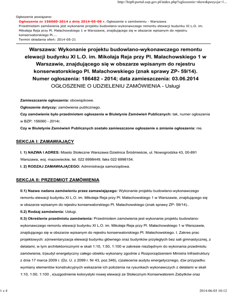 http://bzp0.portal.uzp.gov.pl/index.php?ogloszenie=show&pozycja=1... Ogłoszenie powiązane: Ogłoszenie nr 156060-2014 z dnia 2014-05-09 r. Ogłoszenie o zamówieniu - Warszawa Przedmiotem zamówienia jest wykonanie projektu budowlano-wykonawczego remontu elewacji budynku XI L.O. im. Mikołaja Reja przy Pl. Małachowskiego 1 w Warszawie, znajdującego się w obszarze wpisanym do rejestru konserwatorskiego Pl.... Termin składania ofert: 2014-05-21 Warszawa: Wykonanie projektu budowlano-wykonawczego remontu elewacji budynku XI L.O. im. Mikołaja Reja przy Pl. Małachowskiego 1 w Warszawie, znajdującego się w obszarze wpisanym do rejestru konserwatorskiego Pl. Małachowskiego (znak sprawy ZP- 59/14). Numer ogłoszenia: 186482 - 2014; data zamieszczenia: 03.06.2014 OGŁOSZENIE O UDZIELENIU ZAMÓWIENIA - Usługi Zamieszczanie ogłoszenia: obowiązkowe. Ogłoszenie dotyczy: zamówienia publicznego. Czy zamówienie było przedmiotem ogłoszenia w Biuletynie Zamówień Publicznych: tak, numer ogłoszenia w BZP: 156060 - 2014r. Czy w Biuletynie Zamówień Publicznych zostało zamieszczone ogłoszenie o zmianie ogłoszenia: nie. SEKCJA I: ZAMAWIAJĄCY I. 1) NAZWA I ADRES: Miasto Stołeczne Warszawa Dzielnica Śródmieście, ul. Nowogrodzka 43, 00-691 Warszawa, woj. mazowieckie, tel. 022 6998449, faks 022 6998154. I. 2) RODZAJ ZAMAWIAJĄCEGO: Administracja samorządowa. SEKCJA II: PRZEDMIOT ZAMÓWIENIA II.1) Nazwa nadana zamówieniu przez zamawiającego: Wykonanie projektu budowlano-wykonawczego remontu elewacji budynku XI L.O. im. Mikołaja Reja przy Pl. Małachowskiego 1 w Warszawie, znajdującego się w obszarze wpisanym do rejestru konserwatorskiego Pl. Małachowskiego (znak sprawy ZP- 59/14).. II.2) Rodzaj zamówienia: Usługi. II.3) Określenie przedmiotu zamówienia: Przedmiotem zamówienia jest wykonanie projektu budowlanowykonawczego remontu elewacji budynku XI L.O. im. Mikołaja Reja przy Pl. Małachowskiego 1 w Warszawie, znajdującego się w obszarze wpisanym do rejestru konserwatorskiego Pl. Małachowskiego. I. Zakres prac projektowych: a)inwentaryzacja elewacji budynku głównego oraz budynków przyległych bez sali gimnastycznej, z detalami, w tym architektonicznymi w skali 1:10, 1:50, 1:100 w zakresie niezbędnym do wykonania przedmiotu zamówienia, b)audyt energetyczny całego obiektu wykonany zgodnie z Rozporządzeniem Ministra Infrastruktury z dnia 17 marca 2009 r. (Dz. U. z 2099 r. Nr 43, poz.346), c)zalecenia audytu energetycznego, d)w przypadku wymiany elementów konstrukcyjnych wskazanie ich położenia na rysunkach wykonawczych z detalami w skali 1:10, 1:50, 1:100 , e)uzgodnienie kolorystyki nowej elewacji ze Stołecznym Konserwatorem Zabytków oraz 1z4 2014-06-03 10:12 http://bzp0.portal.uzp.gov.pl/index.php?ogloszenie=show&pozycja=1... inwestorem i użytkownikiem obiektu, f)remont dachu w zakresie niezbędnym dla wykonania przedmiotu zamówienia, g)wymianę instalacji kanalizacji deszczowej, odgromowej, elektrycznej i teletechnicznych znajdujących się na elewacji budynków, h)sporządzenie i uzgodnienie Programu Konserwatorskiego u Stołecznego Konserwatora Zabytków. Opracowanie powinno obejmować w szczególności: 1)audyt energetyczny budynku opracowany zgodnie z rozporządzeniem Ministra Infrastruktury z dnia z dnia 17 marca 2009 r. w sprawie szczegółowego zakresu i form audytu energetycznego oraz części audytu remontowego, wzorów kart audytów, a także algorytmu oceny opłacalności przedsięwzięcia termomodernizacyjnego, na podstawie art. 18 ust. 1 ustawy z dnia 21 listopada 2008 r. o wspieraniu termomodernizacji i remontów (Dz. U. z 2009 Nr 43, poz. 346); 2)dokumentację projektową, opracowaną zgodnie z rozporządzeniem Ministra Infrastruktury z dnia 2 września 2004 r. w sprawie szczegółowego zakresu i formy dokumentacji projektowej, specyfikacji technicznych wykonania i odbioru robót budowlanych oraz programu funkcjonalno-użytkowego (Dz. U. Nr 202, poz. 2072 ze zm.), stanowiącą podstawę do wydania decyzji pozwolenia na budowę bądź zgłoszenia właściwemu organowi wykonania robót budowlanych wraz z wszelkimi wymaganymi uzgodnieniami i ekspertyzami w tym w szczególności SKZ, uwzględniającą: a)inwentaryzację architektoniczno - budowlaną budynku w zakresie objętym opracowaniem, b)mapę do celów projektowych, c)program prac konserwatorskich d)projekt budowlanowykonawczy remontu elewacji z przekrojami i ze wszystkimi charakterystycznymi elementami obejmujący inwentaryzację wszystkich detali architektonicznych i instalacji znajdujących się na elewacji budynku oraz demontaż elementów zbędnych z podaniem wszystkich wymiarów i domiarów z uwzględnieniem etapów wykonania remontu, e)projekt budowlano - wykonawczy wymiany instalacji kanalizacji deszczowej, odgromowej, elektrycznej i teletechnicznych znajdujących się na elewacji budynków, f)przedmiary robót obejmujące przedmiot zamówienia i uwzględniające wszystkie niezbędne czynności wynikające z konieczności zabezpieczenia prac oraz innych czynności nie wynikających bezpośrednio z dokumentacji technicznej w wyżej wymienionym zakresie, wykonane odrębnie dla każdego etapu remontu elewacji, g)informację dotyczącą bezpieczeństwa i ochrony zdrowia, w przypadkach gdy jej opracowanie jest wymagane na podstawie odrębnych przepisów. 3)specyfikacje techniczne ogólne i szczegółowe wykonania i odbioru robót budowlanych objętych przedmiotem zamówienia, opracowane zgodnie z rozporządzeniem Ministra Infrastruktury z dnia 2 września 2004 r. w sprawie szczegółowego zakresu i formy dokumentacji projektowej, specyfikacji technicznych wykonania i odbioru robót budowlanych oraz programu funkcjonalno-użytkowego (Dz. U. Nr 202, poz. 2072 ze zm.), uwzględniającej nazwy i kody: grup, klas oraz kategorii robót określonych w rozporządzeniu (WE) nr 213/2008 z dnia 28 listopada 2007 r. w sprawie Wspólnego Słownika Zamówień; 4)kosztorysy inwestorskie, sporządzone 