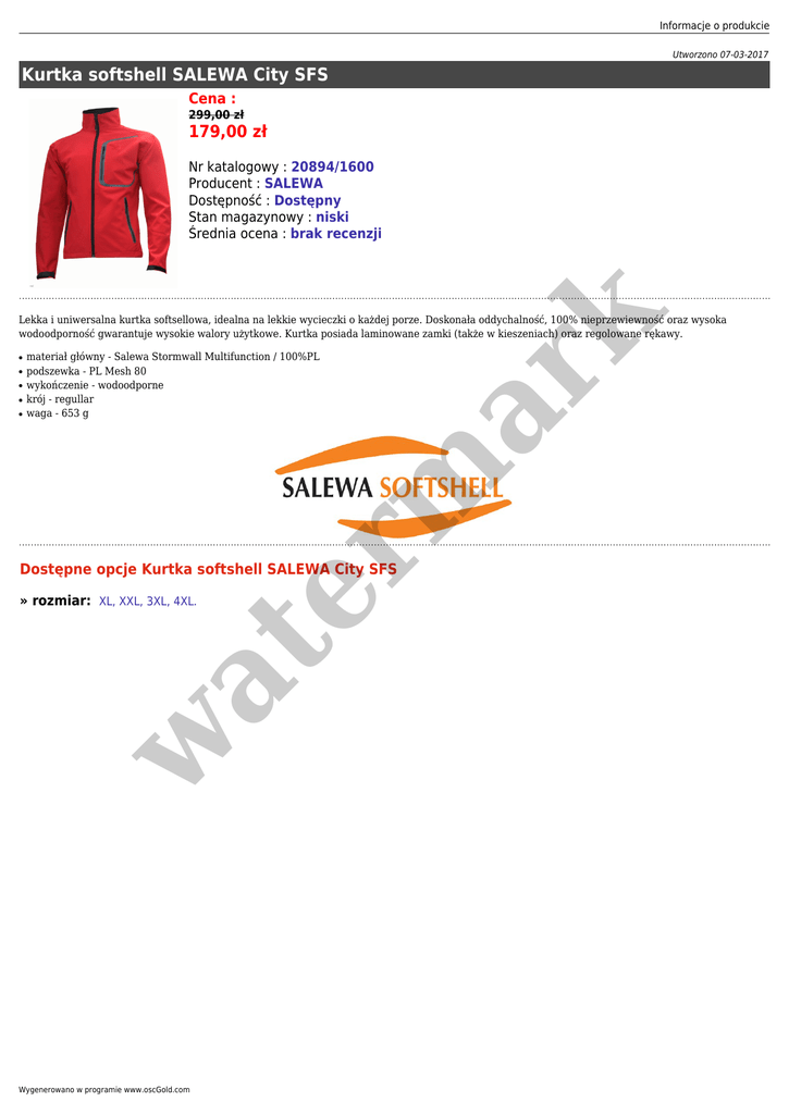 Informacje o produkcie Utworzono 07-03-2017 Kurtka softshell SALEWA City SFS Cena : 299,00 zł 179,00 zł er m ar k Nr katalogowy : 20894/1600 Producent : SALEWA Dostępność : Dostępny Stan magazynowy : niski Średnia ocena : brak recenzji Lekka i uniwersalna kurtka softsellowa, idealna na lekkie wycieczki o każdej porze. Doskonała oddychalność, 100% nieprzewiewność oraz wysoka wodoodporność gwarantuje wysokie walory użytkowe. Kurtka posiada laminowane zamki (także w kieszeniach) oraz regolowane rękawy. ● ● ● ● ● materiał główny - Salewa Stormwall Multifunction / 100%PL podszewka - PL Mesh 80 wykończenie - wodoodporne krój - regullar waga - 653 g Dostępne opcje Kurtka softshell SALEWA City SFS w at » rozmiar: XL, XXL, 3XL, 4XL. Wygenerowano w programie www.oscGold.com