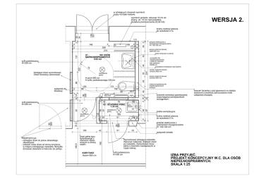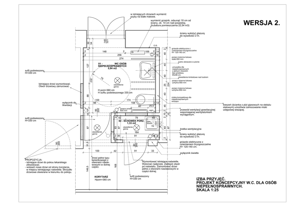 w istniejących drzwiach wymienić szyby na białe matowe. wymienić grzejnik, odsunąć 10 cm od ściany, ok. 14 cm nad posadzką. (kubatura pomieszczenia 22,54 m3) WERSJA 2. 32 34 140 321 ściany wyłożyć glazurą do wysokości 2 m. c.o. 106 G 256 274 2 2 14 16 40 40 40 wgm 164 91 KORYTARZ Hpom=360 cm ściany wyłożyć glazurą do wysokości 2 m. gniazdo elektryczne z uziemieniem bryzgoszczelne H= 120-140 cm. 80 200 drzwi pełne typu łazienkowego z otworami nawiewowymi w dolnej części. 42 kieszeń (ścianka z plyt gipsowych na stelażu stalowym) umożliwia zamocowanie miski ustępowej wiszącej. kratka wentylacyjna 39 2 10 2 2 30 wg oświetlenie górne 2 83 87 43 79 42 02 - SCHOWEK PORZ. zlew 1,33 m2 50x50 przewód wentylacji grawitacyjnej wspomaganej wentylatorkiem wyciągowym. 10 poręcz prosta 600 mm 10 168 146,5 100 PROPOZYCJA: - istniejące drzwi do pokou lekarskiego zlikwidować. - wstawić nowe drzwi od strony korytarza, w miejscu istniejącego naświetla. Skrzydło drzwiowe otwierane w kierunku do pokoju. 2 14 25,5 60 45 158 2 2 10 90 200 10 17 31,5 90 200 oświetlenie górne miska kompaktowa dla niepełnosprawnych wisząca 174 87 sufit podwieszony H=330 cm poręcz ścienna łukowa uchylna 850 mm poręcz ścienna łukowa uchylna 850 mm 88 100 98 2 umywalka dla niepełnosprawnych z jednym otworem bez przelewu 65x56 cm. oświetlenie kinkietowe nad lustrem 25 234 oświetlenie górne 2 10 2 232 75 H pom=360 cm H sufitu podwieszonego 330 cm wyłącznik do likwidacji poręcz ścienna łukowa stała 850 mm lustro obracane w pionie 83 87 127 01 WC OSÓB NIEPEŁNOSPRAWNYCH 5,94 m2 sufit podwieszony H=330 cm Istniejące drzwi wymontować. Otwór drzwiowy zamurować. gniazdo elektryczne z uziemieniem bryzgoszczelne H= 120-140 cm. 2 2 148 40 2 2 33 91 wyłącznik światła Wymontować istniejące naświetle. Wykonać nadproże. Zaślepić otwór po naświetlu. Zamontować drzwi pełne z otworami nawiewowymi w części dolnej. sufit podwieszony H=330 cm IZBA PRZYJĘĆ. PROJEKT KONCEPCYJNY W.C. DLA OSÓB NIEPEŁNOSPRAWNYCH. SKALA 1:25