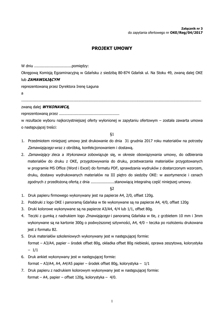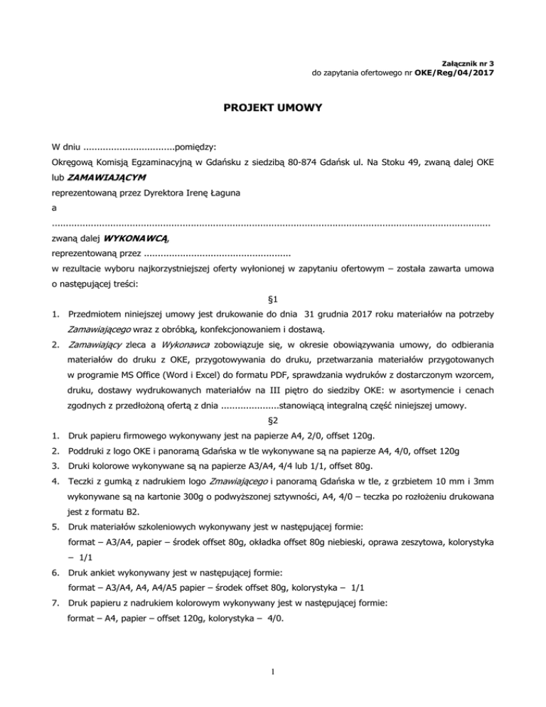 Załącznik nr 3 do zapytania ofertowego nr OKE/Reg/04/2017 PROJEKT UMOWY W dniu .................................pomiędzy: Okręgową Komisją Egzaminacyjną w Gdańsku z siedzibą 80-874 Gdańsk ul. Na Stoku 49, zwaną dalej OKE lub ZAMAWIAJĄCYM reprezentowaną przez Dyrektora Irenę Łaguna a .............................................................................................................................................................. zwaną dalej WYKONAWCĄ, reprezentowaną przez ..................................................... w rezultacie wyboru najkorzystniejszej oferty wyłonionej w zapytaniu ofertowym – została zawarta umowa o następującej treści: §1 1. Przedmiotem niniejszej umowy jest drukowanie do dnia 31 grudnia 2017 roku materiałów na potrzeby Zamawiającego wraz z obróbką, konfekcjonowaniem i dostawą. 2. Zamawiający zleca a Wykonawca zobowiązuje się, w okresie obowiązywania umowy, do odbierania materiałów do druku z OKE, przygotowywania do druku, przetwarzania materiałów przygotowanych w programie MS Office (Word i Excel) do formatu PDF, sprawdzania wydruków z dostarczonym wzorcem, druku, dostawy wydrukowanych materiałów na III piętro do siedziby OKE: w asortymencie i cenach zgodnych z przedłoŜoną ofertą z dnia .....................stanowiącą integralną część niniejszej umowy. §2 1. Druk papieru firmowego wykonywany jest na papierze A4, 2/0, offset 120g. 2. Poddruki z logo OKE i panoramą Gdańska w tle wykonywane są na papierze A4, 4/0, offset 120g 3. Druki kolorowe wykonywane są na papierze A3/A4, 4/4 lub 1/1, offset 80g. 4. Teczki z gumką z nadrukiem logo Zmawiającego i panoramą Gdańska w tle, z grzbietem 10 mm i 3mm wykonywane są na kartonie 300g o podwyŜszonej sztywności, A4, 4/0 – teczka po rozłoŜeniu drukowana jest z formatu B2. 5. Druk materiałów szkoleniowych wykonywany jest w następującej formie: format – A3/A4, papier – środek offset 80g, okładka offset 80g niebieski, oprawa zeszytowa, kolorystyka – 1/1 6. Druk ankiet wykonywany jest w następującej formie: format – A3/A4, A4, A4/A5 papier – środek offset 80g, kolorystyka – 1/1 7. Druk papieru z nadrukiem kolorowym wykonywany jest w następującej formie: format – A4, papier – offset 120g, kolorystyka – 4/0. 1 §3 1. Wzorce będą sporządzane w programie MS Office 2000 (Word i Excel) i przekazywane na płycie CD + sformatowany wydruk. 2. Wykonawca zobowiązany jest do: a. osobistego odbioru wzorców materiałów kaŜdorazowo przy realizacji pojedynczego zamówienia b. graficznej obróbki dostarczonych mu przez Zamawiającego materiałów c. przetworzenia materiałów przygotowanych w programie MS Office (Word i Excel) do formatu PDF d. sprawdzenia przygotowanego materiału do druku z wydrukiem papierowym dostarczonym przez Zamawiającego. e. dostarczenia Zamawiającemu, na nośniku CD, wszystkie wzorce materiałów, przetworzone z programu MS Office do formatu PDF. 3. Zamawiający nie akceptuje przygotowanego przez Wykonawcę druku plików w formacie PDF. Sprawdzenie leŜy po stronie Wykonawcy. §4 Nakład materiałów drukowanych w indywidualnych zamówieniach będzie określany kaŜdorazowo w zamówieniu przesłanym faxem lub e-mailem przez Zamawiającego. §5 1. Wykonawca zobowiązuje się do wykonania usługi określonej w § 2 w czasie nie dłuŜszym niŜ 5 dni (w tym takŜe w soboty) od dnia złoŜenia zamówienia przez Zamawiającego. 2. Wykonawca zobowiązuje się do wykonania części zamówienia określonego poniŜej z dnia na dzień tzn. materiały odebrane o godz. 10:00 z OKE dostarczone muszą być następnego dnia do godz. 12:00 do OKE w tym takŜe w soboty. Wykonawca konfekcjonuje materiały w sposób określony w zamówieniu Materiały szkoleniowe drukowane z dnia na dzień − − − − 300 330 450 650 egzemplarzy egzemplarzy egzemplarzy egzemplarzy po: po: po: po: 2x4, 2x8, 2x20, 24, 2x32 stron kaŜdy 4, 8, 20, 24, 32, 40 stron kaŜdy 2x4, 8, 2x28, 2x32,36 stron kaŜdy 4, 8, 12, 28, 40,60 stron kaŜdy format A3/A4, papier – środek offset 80g, okładka – bez okładki, oprawa zeszytowa, kolorystyka 1/1 §6 Umowa obowiązuje od dnia podpisania umowy do dnia 31 grudnia 2017 roku. §7 1. Ceny za dostarczone materiały ustala się na poziomie cen określonych w formularzu ofertowym i cenowym stanowiącym załącznik do niniejszej umowy. W przypadku zmian ilości stron i wielkości nakładu przedmiotu zamówienia, cena będzie ustalana proporcjonalnie do cen określonych w ofercie. 2. Ogólna kwota brutto za wykonanie usługi drukowania materiałów do 31 grudnia 2017 r. wraz z dostawa nie moŜe być wyŜsza niŜ kwota określona w ofercie ......................(słownie.......................................................) 2 z dnia.......................... tzn. brutto 3. Zapłata za kaŜdorazowo wykonane indywidualne zamówienie następować będzie na konto Wykonawcy w terminie 21 dni od dnia otrzymania przez Zamawiającego faktury VAT. 4. W przypadku przekroczenia przez Zamawiającego terminu płatności, o którym mowa w ust. 2 Wykonawca będzie miał prawo naliczenia odsetek ustawowych za kaŜdy dzień opóźnienia w wykonaniu płatności. §8 1. Wydrukowane materiały dostarczane będą do siedziby Zamawiającego na koszt Wykonawcy. 2. Dostawa obejmuje wniesienie wydrukowanych materiałów do siedziby Zamawiającego – III piętro (bez windy). 3. Wraz z wydrukowanymi materiałami Wykonawca dostarczy Zamawiającemu, na nośniku CD, wszystkie wzorce materiałów przetworzone z programu MS Office do formatu PDF §9 1. Wykonawca zobowiązuje się do dotrzymania terminów oraz dopełnienia staranności wykonania usługi określonej w niniejszej umowie. 2. Zamawiający dopuszcza do ok. 30% zmniejszenie zamówienia określonego w zapytaniu ofertowym. §10 W razie nie wykonania lub nienaleŜytego wykonania umowy przez Wykonawcę: 1. Wykonawca zobowiązuje się zapłacić Zamawiającemu kary umowne 