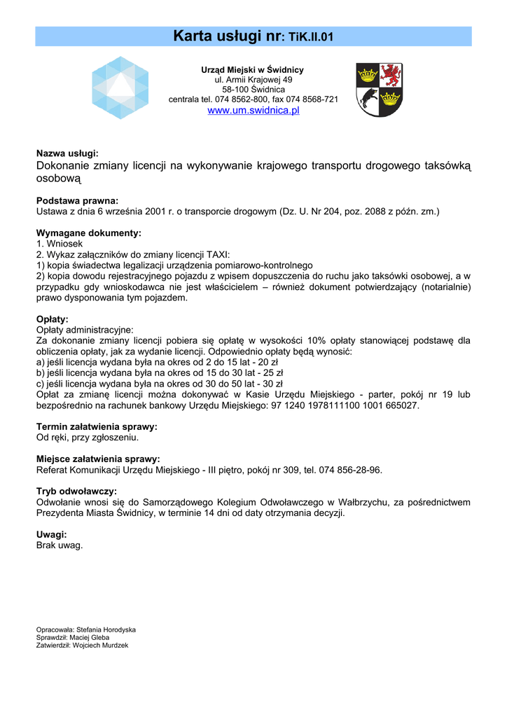 Karta usługi nr: TiK.II.01 Urząd Miejski w Świdnicy ul. Armii Krajowej 49 58-100 Świdnica centrala tel. 074 8562-800, fax 074 8568-721 www.um.swidnica.pl Nazwa usługi: Dokonanie zmiany licencji na wykonywanie krajowego transportu drogowego taksówką osobową Podstawa prawna: Ustawa z dnia 6 września 2001 r. o transporcie drogowym (Dz. U. Nr 204, poz. 2088 z późn. zm.) Wymagane dokumenty: 1. Wniosek 2. Wykaz załączników do zmiany licencji TAXI: 1) kopia świadectwa legalizacji urządzenia pomiarowo-kontrolnego 2) kopia dowodu rejestracyjnego pojazdu z wpisem dopuszczenia do ruchu jako taksówki osobowej, a w przypadku gdy wnioskodawca nie jest właścicielem – również dokument potwierdzający (notarialnie) prawo dysponowania tym pojazdem. Opłaty: Opłaty administracyjne: Za dokonanie zmiany licencji pobiera się opłatę w wysokości 10% opłaty stanowiącej podstawę dla obliczenia opłaty, jak za wydanie licencji. Odpowiednio opłaty będą wynosić: a) jeśli licencja wydana była na okres od 2 do 15 lat - 20 zł b) jeśli licencja wydana była na okres od 15 do 30 lat - 25 zł c) jeśli licencja wydana była na okres od 30 do 50 lat - 30 zł Opłat za zmianę licencji można dokonywać w Kasie Urzędu Miejskiego - parter, pokój nr 19 lub bezpośrednio na rachunek bankowy Urzędu Miejskiego: 97 1240 1978111100 1001 665027. Termin załatwienia sprawy: Od ręki, przy zgłoszeniu. Miejsce załatwienia sprawy: Referat Komunikacji Urzędu Miejskiego - III piętro, pokój nr 309, tel. 074 856-28-96. Tryb odwoławczy: Odwołanie wnosi się do Samorządowego Kolegium Odwoławczego w Wałbrzychu, za pośrednictwem Prezydenta Miasta Świdnicy, w terminie 14 dni od daty otrzymania decyzji. Uwagi: Brak uwag. Opracowała: Stefania Horodyska Sprawdził: Maciej Gleba Zatwierdził: Wojciech Murdzek