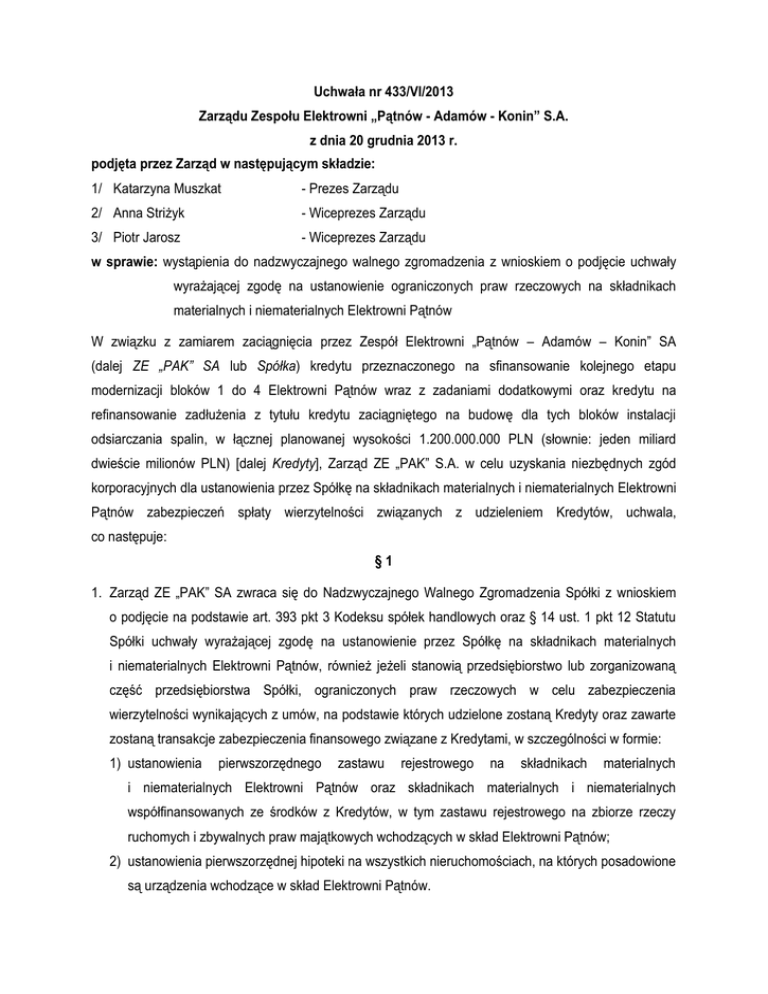 Uchwała nr 433/VI/2013 Zarządu Zespołu Elektrowni „Pątnów - Adamów - Konin” S.A. z dnia 20 grudnia 2013 r. podjęta przez Zarząd w następującym składzie: 1/ Katarzyna Muszkat - Prezes Zarządu 2/ Anna Striżyk - Wiceprezes Zarządu 3/ Piotr Jarosz - Wiceprezes Zarządu w sprawie: wystąpienia do nadzwyczajnego walnego zgromadzenia z wnioskiem o podjęcie uchwały wyrażającej zgodę na ustanowienie ograniczonych praw rzeczowych na składnikach materialnych i niematerialnych Elektrowni Pątnów W związku z zamiarem zaciągnięcia przez Zespół Elektrowni „Pątnów – Adamów – Konin” SA (dalej ZE „PAK” SA lub Spółka) kredytu przeznaczonego na sfinansowanie kolejnego etapu modernizacji bloków 1 do 4 Elektrowni Pątnów wraz z zadaniami dodatkowymi oraz kredytu na refinansowanie zadłużenia z tytułu kredytu zaciągniętego na budowę dla tych bloków instalacji odsiarczania spalin, w łącznej planowanej wysokości 1.200.000.000 PLN (słownie: jeden miliard dwieście milionów PLN) [dalej Kredyty], Zarząd ZE „PAK” S.A. w celu uzyskania niezbędnych zgód korporacyjnych dla ustanowienia przez Spółkę na składnikach materialnych i niematerialnych Elektrowni Pątnów zabezpieczeń spłaty wierzytelności związanych z udzieleniem Kredytów, uchwala, co następuje: §1 1. Zarząd ZE „PAK” SA zwraca się do Nadzwyczajnego Walnego Zgromadzenia Spółki z wnioskiem o podjęcie na podstawie art. 393 pkt 3 Kodeksu spółek handlowych oraz § 14 ust. 1 pkt 12 Statutu Spółki uchwały wyrażającej zgodę na ustanowienie przez Spółkę na składnikach materialnych i niematerialnych Elektrowni Pątnów, również jeżeli stanowią przedsiębiorstwo lub zorganizowaną część przedsiębiorstwa Spółki, ograniczonych praw rzeczowych w celu zabezpieczenia wierzytelności wynikających z umów, na podstawie których udzielone zostaną Kredyty oraz zawarte zostaną transakcje zabezpieczenia finansowego związane z Kredytami, w szczególności w formie: 1) ustanowienia pierwszorzędnego zastawu rejestrowego na składnikach materialnych i niematerialnych Elektrowni Pątnów oraz składnikach materialnych i niematerialnych współfinansowanych ze środków z Kredytów, w tym zastawu rejestrowego na zbiorze rzeczy ruchomych i zbywalnych praw majątkowych wchodzących w skład Elektrowni Pątnów; 2) ustanowienia pierwszorzędnej hipoteki na wszystkich nieruchomościach, na których posadowione są urządzenia wchodzące w skład Elektrowni Pątnów. Uchwała Zarządu ZE „PAK” S.A. nr 433/VI/2013 z dnia 20.12.2013 r. 2. Zarząd ZE „PAK” SA zwraca się do Nadzwyczajnego Walnego Zgromadzenia Spółki z wnioskiem o wyrażenie zgody na dochodzenie zaspokojenia wierzytelności z przedmiotu zastawu rejestrowego z wykorzystaniem sposobów zaspokojenia zastawnika przewidzianych w ustawie z 6.12.1996 r. o zastawie rejestrowym i rejestrze zastawów (t.j. Dz.U. z 2009 r., Nr 67, poz. 569 ze zmianami). §2 Na dzień podjęcia niniejszej Uchwały zadłużenie Spółki z tytułu kwoty głównej kredytu zaciągniętego na budowę instalacji odsiarczania spalin dla bloków Elektrowni Pątnów wynosi 90.000.000 PLN (słownie: dziewięćdziesiąt milionów PLN). §3 Załączniki do niniejszej Uchwały stanowią: 1) wyciąg z Uchwały Rady Nadzorczej Spółki Nr 635/2013/VI z dnia 5 grudnia 2013 r. w sprawie wyrażenia zgody na zaciągniecie przez Spółkę zobowiązań związanych z udzieleniem Spółce kredytu przeznaczonego na sfinansowanie kolejnego etapu procesu modernizacji Elektrowni Pątnów (Załącznik nr 1); 2) projekt uchwały Nadzwyczajnego Walnego Zgromadzenia Spółki w sprawie wyrażenia zgody na ustanowienie ograniczonych praw rzeczowych na składnikach materialnych i niematerialnych Elektrowni Pątnów w celu zabezpieczenia spłaty wierzytelności związanych z udzieleniem Kredytów (Załącznik nr 2). §4 Niniejsza Uchwała wchodzi w życie z dniem podjęcia. Podpisy Członków Zarządu: 1/ Katarzyna Muszkat ............................................... 2/ Piotr Jarosz ............................................. 3/ Anna Striżyk …………………………………