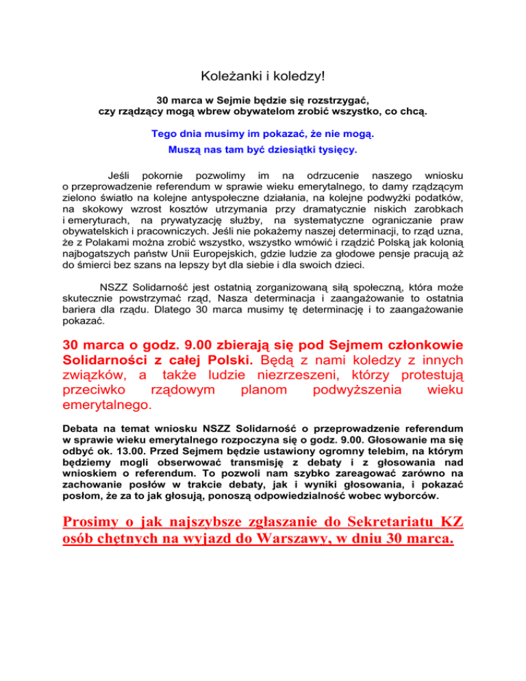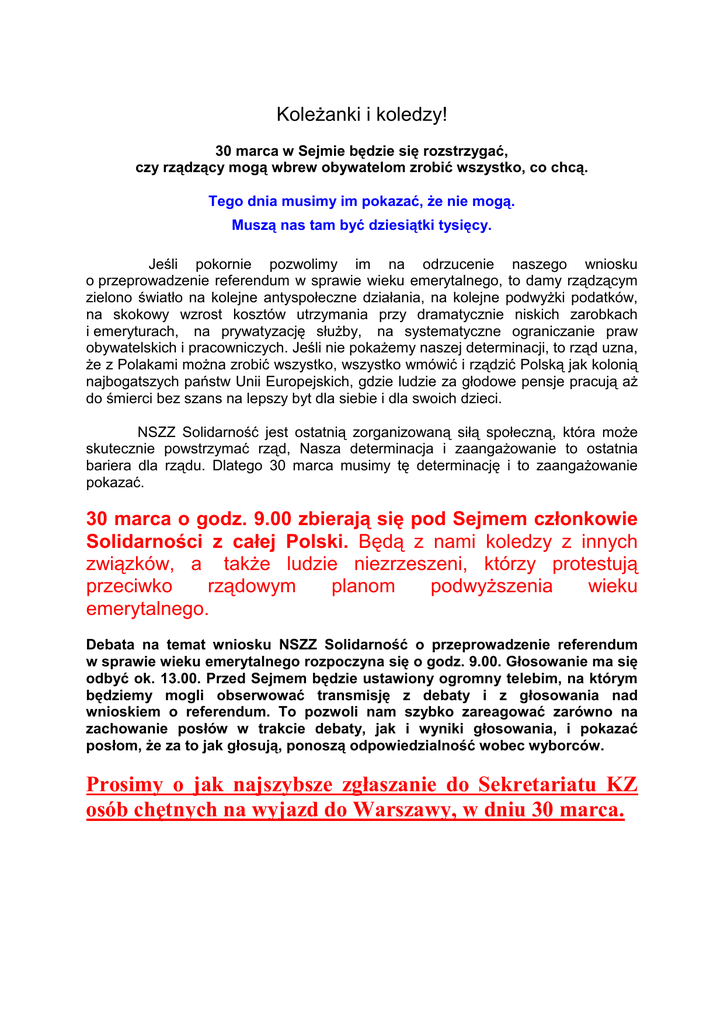 Koleżanki i koledzy! 30 marca w Sejmie będzie się rozstrzygać, czy rządzący mogą wbrew obywatelom zrobić wszystko, co chcą. Tego dnia musimy im pokazać, że nie mogą. Muszą nas tam być dziesiątki tysięcy. Jeśli pokornie pozwolimy im na odrzucenie naszego wniosku o przeprowadzenie referendum w sprawie wieku emerytalnego, to damy rządzącym zielono światło na kolejne antyspołeczne działania, na kolejne podwyżki podatków, na skokowy wzrost kosztów utrzymania przy dramatycznie niskich zarobkach i emeryturach, na prywatyzację służby, na systematyczne ograniczanie praw obywatelskich i pracowniczych. Jeśli nie pokażemy naszej determinacji, to rząd uzna, że z Polakami można zrobić wszystko, wszystko wmówić i rządzić Polską jak kolonią najbogatszych państw Unii Europejskich, gdzie ludzie za głodowe pensje pracują aż do śmierci bez szans na lepszy byt dla siebie i dla swoich dzieci. NSZZ Solidarność jest ostatnią zorganizowaną siłą społeczną, która może skutecznie powstrzymać rząd, Nasza determinacja i zaangażowanie to ostatnia bariera dla rządu. Dlatego 30 marca musimy tę determinację i to zaangażowanie pokazać. 30 marca o godz. 9.00 zbierają się pod Sejmem członkowie Solidarności z całej Polski. Będą z nami koledzy z innych związków, a także ludzie niezrzeszeni, którzy protestują przeciwko rządowym planom podwyższenia wieku emerytalnego. Debata na temat wniosku NSZZ Solidarność o przeprowadzenie referendum w sprawie wieku emerytalnego rozpoczyna się o godz. 9.00. Głosowanie ma się odbyć ok. 13.00. Przed Sejmem będzie ustawiony ogromny telebim, na którym będziemy mogli obserwować transmisję z debaty i z głosowania nad wnioskiem o referendum. To pozwoli nam szybko zareagować zarówno na zachowanie posłów w trakcie debaty, jak i wyniki głosowania, i pokazać posłom, że za to jak głosują, ponoszą odpowiedzialność wobec wyborców. Prosimy o jak najszybsze zgłaszanie do Sekretariatu KZ osób chętnych na wyjazd do Warszawy, w dniu 30 marca.