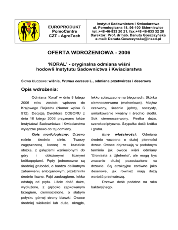 EUROPRODUKT PomoCentre CZT - AgroTech Instytut Sadownictwa i Kwiaciarstwa ul. Pomologiczna 18, 96-100 Skierniewice tel.:+48-46-833 20 21, fax:+48-46-833 32 28 Dyrektor: Prof. dr hab. Danuta Goszczyńska e-mail: [email protected] OFERTA WDROśENIOWA - 2006 ‘KORAL’ - oryginalna odmiana wiśni hodowli Instytutu Sadownictwa i Kwiaciarstwa Słowa kluczowe: wiśnia, Prunus cerasus L., odmiana przetwórcza i deserowa Opis wdroŜenia: Odmiana ‘Koral’ w dniu 8 lutego 2006 roku została wpisana do lekko spłaszczone na biegunach. Skórka ciemnoczerwona (mahoniowa). MiąŜsz Krajowego Rejestru (Numer wpisu S czerwony, 512). Decyzją Dyrektora COBORU z umiarkowanie kwaśny i średnio słodki. dnia 16 lutego 2006 przyznano takŜe Sok Instytutowi Sadownictwa i Kwiaciarstwa szerokoeliptyczna. Szypułka dość krótka wyłączne prawo do tej odmiany. i gruba. Opis rośnie morfologiczny: Drzewo średnio zagęszczoną silnie. koronę w jędrny, średnio ciemnoczerwony. Inne soczysty, Pestka właściwości: duŜa, Odmiana Tworzy średnio wczesna o duŜej plenności kształcie drzew. Owoce dojrzewają w podobnym stoŜka, z gałęziami wzniesionymi do terminie góry 'Groniasta z Ujfehertoi’, ale mogą być i obłoŜonymi licznymi jak owoce odmiany krótkopędami. Pędy jednoroczne są znacznie średniej grubości, o bardzo delikatnym drzewie. Są atrakcyjne zarówno jako zabarwieniu antocjanowym; przetchlinki deserowe, średnio liczne. Pąki zaokrąglone, lekko wartość przetwórczą. odstają od pędu. Liście dość duŜe, wydłuŜone, z głęboko ząbkowanym brzegiem, ciemnozielone, o słabym połysku górnej strony blaszki. Owoce średniej wielkości lub duŜe, okrągłe, dłuŜej wiśni jak pozostawione równieŜ mają na duŜą Drzewo dość podatne na raka bakteryjnego. Wiśnia – ‘KORAL’ (Klon o numerze hodowlanym W-1) Rodowód: Siewka z wolnego zapylenia odmiany ‘Nefris’ Innowacyjność wdroŜeniowa – efekty gospodarcze i społeczne ‘Koral’ jest nową atrakcyjną odmianą o duŜej plenności drzew i szerokiej przydatności owoców: zarówno do spoŜycia w stanie świeŜym, jak równieŜ na wszelkiego rodzaju przetwory. MoŜe być polecana do uprawy towarowej (tradycyjnej i integrowanej), a takŜe do nasadzeń amatorskich. Podmioty, do których skierowana jest oferta wdroŜeniowa Gospodarstwa sadownicze, Szkółki drzewek owocowych, Ośrodki Doradztwa Rolniczego Twórcy oferty wdroŜeniowej: Zakład Odmianoznawstwa, Zasobów Genowych i Szkółkarstwa Zakład Planowania Naukowego Autorzy odmiany: dr ElŜbieta Rozpara tel. (046) 834 54 37 e-mail: [email protected] Współautor: Jan Kępka, Gołosze 6