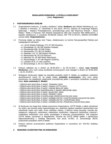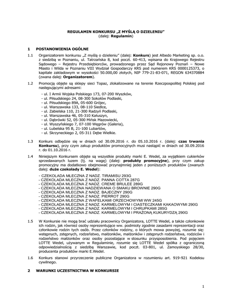REGULAMIN KONKURSU „Z MYŚLĄ O DZIELENIU” (dalej: Regulamin) 1 POSTANOWIENIA OGÓLNE 1.1 Organizatorem konkursu „Z myślą o dzieleniu” (dalej: Konkurs) jest Albedo Marketing sp. o.o. z siedzibą w Poznaniu, ul. Tatrzańska 8, kod poczt. 60-413, wpisana do Krajowego Rejestru Sądowego – Rejestru Przedsiębiorców, prowadzonego przez Sąd Rejonowy Poznań – Nowe Miasto i Wilda w Poznaniu VIII Wydział Gospodarczy KRS pod numerem KRS 0000125373, o kapitale zakładowym w wysokości 50.000,00 złotych, NIP 779-21-83-071, REGON 634370884 (zwana dalej: Organizatorem). 1.2 Promocją objęte są sklepy sieci Topaz, zlokalizowane na terenie Rzeczpospolitej Polskiej pod następującymi adresami: - ul. ul. ul. ul. ul. ul. ul. ul. ul. ul. I Armii Wojska Polskiego 173, 07-200 Wyszków, Piłsudskiego 24, 08-300 Sokołów Podlaski, Piłsudskiego 89A, 05-600 Grójec, Warszawska 133, 08-110 Siedlce, Zabielska 110, 21-300 Radzyń Podlaski, Warszawska 46, 05-310 Kałuszyn, Dąbrówki 52, 05-300 Mińsk Mazowiecki, Wyszyńskiego 7, 07-100 Węgrów (Galeria), Lubelska 95 B, 21-100 Lubartów, Skrzyneckiego 2, 05-311 Dębe Wielkie. 1.3 Konkurs odbędzie się w dniach od 30.09.2016 r. do 05.10.2016 r. (dalej: czas trwania Konkursu), przy czym zakup produktów promocyjnych musi nastąpić w dniach od 30.09.2016 r. do 01.10.2016 r. 1.4 Niniejszym Konkursem objęte są wszystkie produkty marki E. Wedel, za wyjątkiem cukierków sprzedawanych luzem (tj. na wagę) (dalej: produkty promocyjne), przy czym zakup promocyjny ma dodatkowo obejmować przynajmniej jeden z poniższych produktów (zwanych dalej: duże czekolady E. Wedel): - CZEKOLADA MLECZNA Z NADZ. TIRAMISU 293G - CZEKOLADA MLECZNA Z NADZ. PANNA COTTA 287G - CZEKOLADA MLECZNA Z NADZ. CREME BRULEE 289G - CZEKOLADA MLECZNA NADZIEWANA O SMAKU BROWNIE 290G - CZEKOLADA MLECZNA Z NADZ. BAJECZNY 290G - CZEKOLADA MLECZNA Z NADZ. PIERROT 290G - CZEKOLADA MLECZNA Z WAFELKAMI ORZECHOWYMI WW 245G - CZEKOLADA MLECZNA Z NADZ. KARMELOWYM I CIASTECZKAMI KAKAOWYMI 290G - CZEKOLADA MLECZNA Z NADZ. KARMELOWYM I CHRUPKAMI 285G - CZEKOLADA MLECZNA Z NADZ. KARMELOWYM I PRAŻONĄ KUKURYDZĄ 290G 1.5 W Konkursie nie mogą brać udziału pracownicy Organizatora, LOTTE Wedel, a także członkowie ich rodzin, jak również osoby reprezentujące ww. podmioty zgodnie zasadami reprezentacji oraz członkowie rodzin tych osób. Przez członków rodziny, o których mowa powyżej, rozumie się: wstępnych, zstępnych, rodzeństwo, małżonków, małżonków i zstępnych rodzeństwa, rodziców i rodzeństwo małżonków oraz osoby pozostające w stosunku przysposobienia. Pod pojęciem LOTTE Wedel, używanym w Regulaminie, rozumie się LOTTE Wedel spółka z ograniczoną odpowiedzialnością z siedzibą Warszawie, kod poczt. 03-801, ul. Zamoyskiego 28/30, producenta produktów marki E.Wedel. 1.6 Konkurs stanowi przyrzeczenie publiczne Organizatora w rozumieniu art. 919-921 Kodeksu cywilnego. 2 WARUNKI UCZESTNICTWA W KONKURSIE 1 2.1 Uczestnikiem Konkursu może być każda pełnoletnia osoba fizyczna, posiadająca pełną zdolność do czynności prawnych, zamieszkała na terytorium Rzeczypospolitej Polskiej, która dokona na terenie Rzeczypospolitej Polskiej w jednym ze sklepów sieci Topaz, wskazanych w pkt 1.2., zakupu produktów promocyjnych zgodnie z pkt 2.3.1 poniżej w czasie trwania Konkursu, dla celów niezwiązanych z prowadzoną działalnością gospodarczą lub zawodową (tj. jako konsument w rozumieniu art. 221 Kodeksu cywilnego) (dalej: Uczestnik). 2.2 Konkurs polega na wymyśleniu najciekawszej pod względem kreatywności odpowiedzi na pytanie konkursowe „Którą czekoladą E. Wedel lubisz dzielić się najbardziej i dlaczego?” (dalej „Zadanie konkursowe”). 2.3 Warunkiem uczestnictwa w Konkursie jest: 2.3.1 dokonanie w dniach od 30.09.2016 r. do 01.10.2016 r. w jednym ze wskazanych w pkt 1.2. sklepie sieci Topaz zakupu produktów marki E.Wedel o wartości jednorazowo minimum 15 zł brutto, w tym co najmniej jednej dużej czekolady E.Wedel, przy czym zakup wszystkich produktów promocyjnych musi zostać udokumentowany jednym dowodem zakupu; 2.3.2 wypełnienie internetowego formularza konkursowego dostępnego na stronie www.zmyslaodzieleniu.pl w którym Uczestnik poda swoje dane osobowe (imię, nazwisko, adres zamieszkania, numer telefonu, adres e-mail) i numer dowodu zakupu dokumentującego dokonanie zakupu zgodnie z pkt 2.3.1., wskaże w którym sklepie dokonał zakupu produktów promocyjnych oraz zamieści wymyśloną przez Uczestnika odpowiedź na pytanie konkursowe, a następnie przesłanie formularza konkursowego do Organizatora drogą elektroniczną zgodnie z instrukcjami znajdującymi się na ww. stronie; 2.3.3 zachowanie oryginalnego dowodu promocyjnych zgodnie z pkt 2.3.1. zakupu potwierdzającego zakup produktów 2.4 Jeden Uczestnik może przesłać więcej niż jeden formularz konkursowy pod warunkiem każdorazowego spełnienia wszystkich warunków uczestnictwa, o których mowa w Regulaminie, w tym w szczególności w punkcie 2.3. Ta sama odpowiedź na pytanie konkursowe może zostać przesłana w sposób wskazany w pkt 2.3.2 tylko raz. 2.5 Wykonanie Zadania Konkursowego, o którym mowa w pkt 2.2 Regulaminu: 2.5.1 powinno być wynikiem osobistej, samodzielnej twórczości Uczestnika, 2.5.2 nie może zawierać wulgaryzmów, treści obraźliwych lub treści sprzecznych z prawem, 2.5.3 nie może zawierać treści reklamowych dotyczących jakichkolwiek podmiotów, z wyłączeniem treści reklamowych dotyczących produktów LOTTE Wedel, 2.5.4 nie może naruszać praw osób trzecich, w tym w szczególności: dóbr osobistych i praw autorskich. 2.6 Data i godzina zakupu widniejąca na dowodzie zakupu z produktami promocyjnymi musi być wcześniejsza niż data i godzina przesłania formularza zgłoszeniowego z Zadaniem konkursowym w sposób wskazany w pkt 2.3.2. 2.7 Zastrzega się, że Uczestnik, który przesłał więcej niż jeden formularz konkursowy, moż