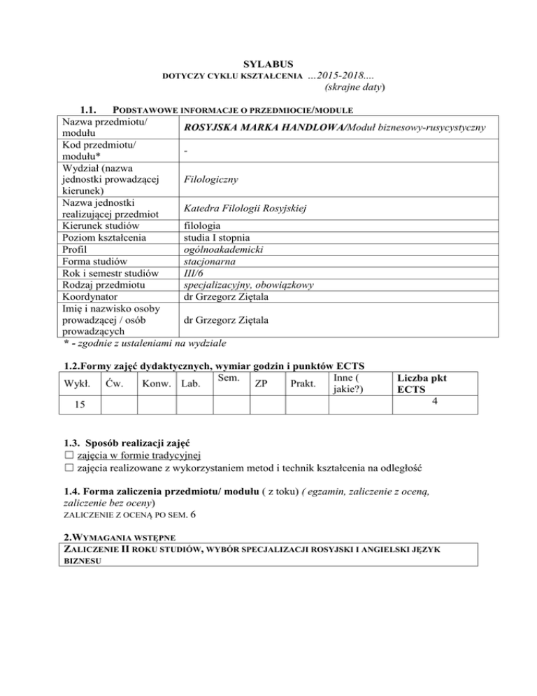 SYLABUS DOTYCZY CYKLU KSZTAŁCENIA …2015-2018.... (skrajne daty) 1.1. PODSTAWOWE INFORMACJE O PRZEDMIOCIE/MODULE Nazwa przedmiotu/ ROSYJSKA MARKA HANDLOWA/Moduł biznesowy-rusycystyczny modułu Kod przedmiotu/ modułu* Wydział (nazwa jednostki prowadzącej Filologiczny kierunek) Nazwa jednostki Katedra Filologii Rosyjskiej realizującej przedmiot Kierunek studiów filologia Poziom kształcenia studia I stopnia Profil ogólnoakademicki Forma studiów stacjonarna Rok i semestr studiów III/6 Rodzaj przedmiotu specjalizacyjny, obowiązkowy Koordynator dr Grzegorz Ziętala Imię i nazwisko osoby prowadzącej / osób dr Grzegorz Ziętala prowadzących * - zgodnie z ustaleniami na wydziale 1.2.Formy zajęć dydaktycznych, wymiar godzin i punktów ECTS Sem. Inne ( Wykł. Ćw. Konw. Lab. ZP Prakt. jakie?) 15 Liczba pkt ECTS 4 1.3. Sposób realizacji zajęć ☐ zajęcia w formie tradycyjnej ☐ zajęcia realizowane z wykorzystaniem metod i technik kształcenia na odległość 1.4. Forma zaliczenia przedmiotu/ modułu ( z toku) ( egzamin, zaliczenie z oceną, zaliczenie bez oceny) ZALICZENIE Z OCENĄ PO SEM. 6 2.WYMAGANIA WSTĘPNE ZALICZENIE II ROKU STUDIÓW, WYBÓR SPECJALIZACJI ROSYJSKI I ANGIELSKI JĘZYK BIZNESU 3. CELE, EFEKTY KSZTAŁCENIA , TREŚCI PROGRAMOWE I STOSOWANE METODY DYDAKTYCZNE 3.1. Cele przedmiotu/modułu zapoznanie studentów z najważniejszymi markami radzieckimi i rosyjskimi, z rodzajami produkowanych wyrobów, nazwami i charakterystyką producentów marek zapoznanie studentów z leksyką specjalistyczną z zakresu terminologii gospodarczej w języku rosyjskim C1 C2 3.2 EFEKTY KSZTAŁCENIA DLA PRZEDMIOTU/ MODUŁU EK ( efekt kształcenia) Treść efektu kształcenia zdefiniowanego dla przedmiotu (modułu) EK_01 ZNA I ROZUMIE PODSTAWOWE MECHANIZMY FUNKCJONOWANIA JĘZYKA W SZCZEGÓŁOWYM ODNIESIENIU DO JĘZYKA STUDIOWANEJ SPECJALNOŚCI I PORÓWNAWCZYM ODNIESIENIU DO INNYCH JĘZYKÓW EK_02 ROZUMIE POTRZEBĘ DBANIA O PRECYZYJNE, POPRAWNE LOGICZNIE I JĘZYKOWO WYRAŻANIE WŁASNYCH MYŚLI I POGLĄDÓW K_W17 EK_03 POTRAFI WYSZUKIWAĆ, ANALIZOWAĆ, OCENIAĆ, SELEKCJONOWAĆ I UŻYTKOWAĆ INFORMACJE ZWIĄZANE Z DZIEDZINAMI NAUKOWYMI W OBRĘBIE WŁAŚCIWEJ SPECJALNOŚCI K_U02 3.3 Odniesienie do efektów kierunkowych (KEK) K_W12 TREŚCI PROGRAMOWE A. Problematyka wykładu Treści merytoryczne Podstawowe pojęcia: trademark - „торговая марка”, „торговый знак”; „товарный знак”, „фирменный знак”, „бренд”, „логотип”, „слоган”, „брендинг”, „атрибуты бренда” („brand attributes”), „суть бренда” („brand essence”), „индивидуальность бренда” („brand identity”), „имидж бренда” („brand image”), „сила бренда” („brand power”), „соответственность бренда” („brand relevance”), „подъёмная сила бренда” („brand leverage”), „приверженность к бренду” („brand loyalty”), „известность бренда” („brand awareness”). Marki radzieckie: „Беломорканал”, „Прима”, „Советское шампанское”, „Красная шапочка”, „Аленка”, „Жигулевское”, „Ленвест”, „Московская правда”, „Победа”, „Запорожец”, „Москвич”, „Столичная”, „Московская правда”, „Берёзка”, „Весна”, „ФЭД”, „Смена”, „Зенит”, „Верховина”, „Электрон”, „ЗИЛ-Москва”, „Красная Москва”, „Шипр”, „Тройной одеколон”, „Вихрь”, „Вятка”, „Ту-134”. Marki rosyjskie: 3.1. wódka („Гжелка”, „Глагман”, „Русский стандарт”, „Зелёная марка”, „Путинка”, „Русский размер”, „Парламент”, „Пять Озёр”, „Славянская”, „Довгань”, „Беленькая”, „Мягков”, „Ять”) 3.2. piwo („Балтика”, „Клинское”, „Толстяк”, „Сибирская корона”, „Охота”, „Старый мельник”, „Золотая бочка”, „Арсенальное”, „Бочкарёв”, „Очаково”, „Ярпиво”) 3.3. samochody („Lada”, „УАЗ”, „ГАЗ”, „Газель”) 3.4. soki („Добрый”, „Ясли-Сад”, „Я”, „Тонус”, „Фруктовый сад”, „Привет”, „Любимый сад”, „J7”, „Да”, „Моя семья” ) 3.5. wyroby cukiernicze („Алёнка”, „Золотой ярлык”, „Мишка косолапый”, „Осенний вальс”, „Рот Фронт”, „Неженка”, „Вдохновение”, „Белочка”, „Санже”, „Чудо-ягода”, „Паутинка”, „Ясная Поляна”, „Юбилейное”, „Причуда”, „Россия – щедрая душа”, „Хрустики”, „Татьяна”, „Неженка”, „Мишка на севере”, „Шах”, „Вернисаж”, „Сладковъ”, „Ореховый стиль”, „Свежесть”, „Счастливый день”, „Виват, Россия!”, „Ладога”, „Ладожская изюминка”, „Мария”, „Солнечная долька”) 3.6. kosmetyki ( „Чёрный жемчуг”, „Чистая линия”, „32”, „Бархатные ручки”, „Маленькая фея”, „Роса”, „Солнышко”, „Гармония”, „Ушастый нянь”, „Тип-топ”, „Новый жемчуг”, „Ми