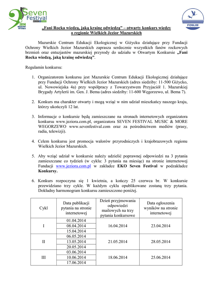 „Fani Rocka wiedzą, jaką krainę odwiedzą” – otwarty konkurs wiedzy o regionie Wielkich Jezior Mazurskich Mazurskie Centrum Edukacji Ekologicznej w Giżycku działające przy Fundacji Ochrony Wielkich Jezior Mazurskich zaprasza serdecznie wszystkich fanów rockowych brzmień oraz entuzjastów mazurskiej przyrody do udziału w Otwartym Konkursie „Fani Rocka wiedzą, jaką krainę odwiedzą”. Regulamin konkursu: 1. Organizatorem konkursu jest Mazurskie Centrum Edukacji Ekologicznej działające przy Fundacji Ochrony Wielkich Jezior Mazurskich (adres siedziby: 11-500 Giżycko, ul. Nowowiejska 4a) przy współpracy z Towarzystwem Przyjaciół 1. Mazurskiej Brygady Artylerii im. Gen. J. Bema (adres siedziby: 11-600 Węgorzewo, ul. Bema 7). 2. Konkurs ma charakter otwarty i mogą wziąć w nim udział mieszkańcy naszego kraju, którzy ukończyli 12 lat. 3. Informacje o konkursie będą zamieszczane na stronach internetowych organizatora konkursu www.jeziora.com.pl, organizatora SEVEN FESTIVAL MUSIC & MORE WEGORZEWO www.sevenfestival.com oraz za pośrednictwem mediów (prasy, radia, telewizji). 4. Celem konkursu jest promocja walorów przyrodniczych i krajobrazowych regionu Wielkich Jezior Mazurskich. 5. Aby wziąć udział w konkursie należy udzielić poprawnej odpowiedzi na 3 pytania zamieszczane co tydzień (w cyklu: 3 pytania na miesiąc) na stronie internetowej Fundacji www.jeziora.com.pl w zakładce EKO Seven Festival w podzakładce Konkursy. 6. Konkurs rozpoczyna się 1 kwietnia, a kończy 25 czerwca br. W konkursie przewidziano trzy cykle. W każdym cyklu opublikowane zostaną trzy pytania. Dokładny harmonogram konkursu zamieszczono poniżej. Cykl I II III Data publikacji pytania na stronie internetowej 01.04.2014 08.04.2014 15.04.2014 06.05.2014 13.05.2014 20.05.2014 03.06.2014 10.06.2014 17.06.2014 Dzień przyjmowania odpowiedzi mailowych na trzy pytania konkursowe Data ogłoszenia wyników na stronie internetowej 16.04.2014 23.04.2014 21.05.2014 28.05.2014 18.06.2014 25.06.2014 7. Odpowiedzi na pytania należy przesyłać wyłącznie drogą mailową na adres: [email protected] z dopiskiem w temacie „Fani Rocka wiedzą, jaką krainę odwiedzą”. Inna forma przekazania odpowiedzi nie będzie brana pod uwagę. 8. Każdy cykl pytań będzie zawierał po jednym pytaniu z trzech kategorii: woda, ziemia, powietrze, które oznaczone będą ikonkami: - pytania z kategorii ZIEMIA - pytania z kategorii WODA - pytania z kategorii POWIETRZE 9. Termin przyjmowania odpowiedzi (jeden określony dzień) oraz termin publikacji wyników konkursu został określony w harmonogramie konkursu w pkt 5. 10. Uczestnicy konkursu oprócz poprawnych odpowiedzi na pytania zobowiązani są podać następujące dane: imię i nazwisko, dokładny adres zamieszkania oraz nr tel. kontaktowego. 11. W każdym cyklu trzy osoby, które jako pierwsze udzielą poprawnych odpowiedzi na trzy pytania otrzymają nagrody w postaci karnetów na SEVEN FESTIVAL MUSIC & MORE WEGORZEWO 2014 (1 nagrodzony uczestnik – 1 karnet). W każdym cyklu zostaną nagrodzone trzy osoby, łącznie w konkursie - dziewięć. 12. Karnety zostaną przekazane osobom nagrodzonym listownie przez organizatora SEVEN FESTIVAL MUSIC & MORE WEGORZEWO 2014 - Towarzystwo Przyjaciół 1. Mazurskiej Brygady Artylerii im. Gen. J. Bema w Węgorzewie. 13. Uwaga! Osoby raz nagrodzone nie mogą brać udziału w kolejnych cyklach konkursu. 14. Organizatorzy nie ponoszą odpowiedzialności za niemożność przekazania nagrody z uwagi na brak kontaktu z Uczestnikiem lub z innych powodów niezależnych od Organizatorów. 15. Udział w konkursie jest równoznaczny z wyrażeniem przez osoby w nim uczestniczące zgody na przetwarzanie przez organizatorów konkursu ich danych osobowych na potrzeby konkursu oraz w celach marketingowych (ustawa o ochronie danych osobowych z dn. 29.08.1997 r. Dz.U. Nr 133, poz. 833 z póz. zm., tekst jednolity Dz. U. z 2002, Nr 101, poz. 926 z póz. zm.). 16. UWAGA! Osoby niepełnoletnie mogą brać udział w konkursie wyłącznie za zgodą swoich rodziców lub opiekunów prawnych. Zgoda rodziców i opiekunów prawnych osób niepełnoletnich uczestniczących w konkursie obejmuje również zgodę na przetwarzanie danych osobowych. Uczestnik jest zobowiązany do przesłania takiej zgody na piśmie (w postaci skanu z podpisem – mailem na adres [email protected], bądź na piśmie - pocztą tradycyjną na adres Fundacja Ochrony Wielkich Jezior Mazurskich 11-500 Giżycko, ul. Nowowiejska 4a). Wzór zgody zawarto w załączniku do regulaminu. Brak zgody dyskwalifikuje uczestnika z udziału w konkursie.