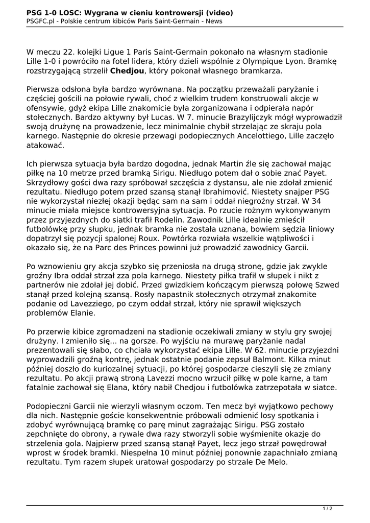 PSG 1-0 LOSC: Wygrana w cieniu kontrowersji (video) PSGFC.pl - Polskie centrum kibiców Paris Saint-Germain - News W meczu 22. kolejki Ligue 1 Paris Saint-Germain pokonało na własnym stadionie Lille 1-0 i powróciło na fotel lidera, który dzieli wspólnie z Olympique Lyon. Bramkę rozstrzygającą strzelił Chedjou, który pokonał własnego bramkarza. Pierwsza odsłona była bardzo wyrównana. Na początku przeważali paryżanie i częściej gościli na połowie rywali, choć z wielkim trudem konstruowali akcje w ofensywie, gdyż ekipa Lille znakomicie była zorganizowana i odpierała napór stołecznych. Bardzo aktywny był Lucas. W 7. minucie Brazylijczyk mógł wyprowadził swoją drużynę na prowadzenie, lecz minimalnie chybił strzelając ze skraju pola karnego. Następnie do okresie przewagi podopiecznych Ancelottiego, Lille zaczęło atakować. Ich pierwsza sytuacja była bardzo dogodna, jednak Martin źle się zachował mając piłkę na 10 metrze przed bramką Sirigu. Niedługo potem dał o sobie znać Payet. Skrzydłowy gości dwa razy spróbował szczęścia z dystansu, ale nie zdołał zmienić rezultatu. Niedługo potem przed szansą stanął Ibrahimović. Niestety snajper PSG nie wykorzystał niezłej okazji będąc sam na sam i oddał niegroźny strzał. W 34 minucie miała miejsce kontrowersyjna sytuacja. Po rzucie rożnym wykonywanym przez przyjezdnych do siatki trafił Rodelin. Zawodnik Lille idealnie zmieścił futbolówkę przy słupku, jednak bramka nie została uznana, bowiem sędzia liniowy dopatrzył się pozycji spalonej Roux. Powtórka rozwiała wszelkie wątpliwości i okazało się, że na Parc des Princes powinni już prowadzić zawodnicy Garcii. Po wznowieniu gry akcja szybko się przeniosła na drugą stronę, gdzie jak zwykle groźny Ibra oddał strzał zza pola karnego. Niestety piłka trafił w słupek i nikt z partnerów nie zdołał jej dobić. Przed gwizdkiem kończącym pierwszą połowę Szwed stanął przed kolejną szansą. Rosły napastnik stołecznych otrzymał znakomite podanie od Lavezziego, po czym oddał strzał, który nie sprawił większych problemów Elanie. Po przerwie kibice zgromadzeni na stadionie oczekiwali zmiany w stylu gry swojej drużyny. I zmieniło się... na gorsze. Po wyjściu na murawę paryżanie nadal prezentowali się słabo, co chciała wykorzystać ekipa Lille. W 62. minucie przyjezdni wyprowadzili groźną kontrę, jednak ostatnie podanie zepsuł Balmont. Kilka minut później doszło do kuriozalnej sytuacji, po której gospodarze cieszyli się ze zmiany rezultatu. Po akcji prawą stroną Lavezzi mocno wrzucił piłkę w pole karne, a tam fatalnie zachował się Elana, który nabił Chedjou i futbolówka zatrzepotała w siatce. Podopieczni Garcii nie wierzyli własnym oczom. Ten mecz był wyjątkowo pechowy dla nich. Następnie goście konsekwentnie próbowali odmienić losy spotkania i zdobyć wyrównującą bramkę co parę minut zagrażając Sirigu. PSG zostało zepchnięte do obrony, a rywale dwa razy stworzyli sobie wyśmienite okazje do strzelenia gola. Najpierw przed szansą stanął Payet, lecz jego strzał powędrował wprost w środek bramki. Niespełna 10 minut później ponownie zapachniało zmianą rezultatu. Tym razem słupek uratował gospodarzy po strzale De Melo. 1/2 PSG 1-0 LOSC: Wygrana w cieniu kontrowersji (video) PSGFC.pl - Polskie centrum kibiców Paris Saint-Germain - News Z każdą minutą napór przeciwnika wzrastał, a paryżanie co rusz szczęśliwie wychodzili z opresji. Jeszcze przed końcem meczu szczęścia próbował strzelec nieuznanej bramki, Rodelin, jednak tym razem pomylił się i jego uderzenie z dystansu powędrowało obok słupka, po czym sędzia zakończył zawody. O tym spotkaniu wszyscy w Paryżu będą chcieli szybko zapomnieć. Drużyna gwiazd ze stolicy Francji w niczym nie przypomniała tej, która bez problemu ograła przed kilkoma dniami Toulouse, kiedy to ręce same składały się do oklasków obserwując zagrania z najwyższej półki. Dziś było kompletnie inaczej i bezsprzecznym jest, że gospodarze nie zasłużyli na zwycięstwo, a być może nawet remis. PSG 1-0 LOSC 68' Chedjou (sam.) Bramkę z meczu możesz zobaczyć TUTAJ. Autor: Don Matteo 2/2 Powered by TCPDF (www.tcpdf.org)