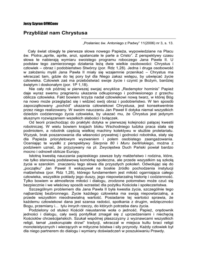 Jerzy Szyran OFMConv Przybliżał nam Chrystusa „Posłaniec św. Antoniego z Padwy” 11(2006) nr 3, s. 13. Cały świat obiegły te pierwsze słowa nowego Papieża, wypowiedziane na Placu św. Piotra:„aprite, aprite, anzi, spalancate le parte a Cristo”. Z perspektywy czasu słowa te nabierają wymiaru swoistego programu roboczego Jana Pawła II. U podstaw tego zamierzonego działania leżą dwie wielkie osobowości: Chrystus i człowiek – obraz i podobieństwo Stwórcy (por. Rdz 1,28). Jedna i druga osobowość w założeniu myśli Jana Pawła II miały się wzajemnie przenikać – Chrystus ma wkraczać tam, gdzie do tej pory był dla Niego zakaz wstępu, by uświęcać życie człowieka. Człowiek zaś ma przebóstwiać swoje życie i czynić je Bożym, bardziej świętym i doskonałym (por. 1P 1,18). Nie cały rok później w pierwszej swojej encyklice „Redemptor hominis” Papież daje wyraz swemu pragnieniu ukazania odkupionego i podniesionego z grzechu oblicza człowieka. Fakt bowiem krzyża nadał człowiekowi nową twarz, w której Bóg na nowo może przeglądać się i widzieć swój obraz i podobieństwo. W ten sposób zapoczątkowany „pochód” ukazania człowiekowi Chrystusa, jest konsekwentnie przez niego realizowany. W swoim nauczaniu Jan Paweł II dotyka niemal wszystkich dziedzin codziennego życia człowieka, by ukazać mu, że Chrystus jest jedynym słusznym rozwiązaniem wszelkich słabości i bolączek. Od teorii przechodząc do praktyki dotyka w pierwszej kolejności palącej kwestii robotniczej. W wielu bowiem krajach bloku Wschodniego ludzka praca stała się podmiotem, a robotnik częścią wielkiej machiny kolektywu w służbie proletariatu. Wyzysk, brak poszanowania dla własności prywatnej i godności robotnika, stały się dla Papieża priorytetowym wyzwaniem i polem osobistego zaangażowania. Oceniając te wysiłki z perspektywy Sierpnia 80 i Muru berlińskiego, można z podziwem uznać, że przyzywany na pl. Zwycięstwa Duch Pański powiał bardzo mocno i odnowił oblicze Europy. Istotną kwestią nauczania papieskiego zawsze były małżeństwo i rodzina, które, nie tylko stanowią podstawową komórkę społeczna, ale przede wszystkim są szkołą życia w szerokim znaczeniu tego słowa dla przyszłych pokoleń. Odwołując się do „początku” Jan Paweł II wskazywał na boskie źródło pochodzenia instytucji małżeństwa (por. Rdz 1,28), którego fundamentem jest miłość ogarniająca całego człowieka, wszystkie pokłady jego duszy, jego niepowtarzalną historię i codzienność. Tylko bowiem w atmosferze miłości i dialogu, zrodzone potomstwo może czuć się bezpiecznie i we właściwy sposób wzrastać dla pożytku Kościoła i społeczeństwa. Szczególnym problemem dla Jana Pawła II była kwestia życia, szczególnie tego najbardziej bezbronnego. Życie każdego człowieka ma swoją niepowtarzalną, a przede wszystkim nieodnawialną wartość. Posiadanie tej wartości sprawia, że każdemu człowiekowi dana jest szansa radości, spotkania z drugim, wdzięczności Bogu, przemiany i... tylu innych rzeczy, do których potrzeba daru życia. Podzielony od stuleci Kościół nieustannie woła o jedność. Papież, orędownik jedności i dialogu, cały swój pontyfikat zmagał się z uprzedzeniami i niechęcią Kościołów chrześcijańskich. Szukał wspólnej płaszczyzny z wyznawcami wszystkich religii, łamał „zaskorupiałe drzwi” tradycji, wkraczał w miejsca kultu braci religii monoteistycznych i wierzących w mityczne bóstwa i siły przyrody. Każdy człowiek był dla niego partnerem do dialogu i wymiany doświadczeń w poszukiwaniu Prawdy. W końcu ważne miejsce w jego życiu zajmowała poezja. Strofy liryzmu i dramatu płynęły z najczulszych pokładów jego ducha, wrażliwego na piękno otaczającego świata, ale również na historię człowieka uwikłanego w zmagania z samym sobą i niepojętą rzeczywistością Boskiego Bytu. Poezja tłumaczyła mu prostym, nieskomplikowanym językiem zawiłości stworzenia. Choć dla innych była trudna i pełna metafor, dla niego stanowiła przejrzystą kartę, na której pisał sercem. W ten właśnie sposób Jan Paweł II otwierał drzwi różnych pokładów ludzkiego życia dla Chrystusa. Żadna grupa społeczna, żadna sprawa czy miejsce na ziemi nie mogły być pozbawione miłosnego spojrzenia Jezusa. Papież podejmując pielgrzymkowy szlak do wielu miejsc na ziemi, spotykając się z milionami wiernych, wyznawcami innych religii i ateistów, za każdym razem otwierał „tamtejsze drzwi” Chrystusowi. Widział bowiem, że tylko On może dokonać radykalnych przemian społecznych, politycznych czy gospodarczych, a przede wszystkim przemiany serca każdego człowieka. I nie pomylił się! Zbyt konserwatywny dla liberałów, za liberalny dla konserwatystów, utrapienie ochrony i mistrzów ceremonii. Tytan słowa, nieposkromiony w mówieniu prawdy w służbie wolności. Jednocześnie człowiek przenikającego na wskroś spojrzenia pełnego pokoju i zadumy. Swoja moc twórczą Jan Paweł II czerpał z nieustannej kontemplacji Boga. Modlitwa bowiem była dla niego środkiem prowadzącym do zjednoczenia z Chrystusem. Wielokrotnie było nam dane widzieć Papieża zatopionego w modlitwie wobec niezmierzonych tłumów, niejednokrotnie głów państw, a przede wszystkim wścibskich obiektywów kamer. On w jakiejś mistycznej ekstazie, jakby na chwilę zostawiał ciało, otaczające go zgromadzenie i „wychodził” na długą rozmowę z Panem. Nie wiemy, kiedy nastąpi jego kanonizacja. Choć w dniu pogrzebu tłumy skandowały Santo subito, dla nas on już jest Santo adesso (święty teraz).