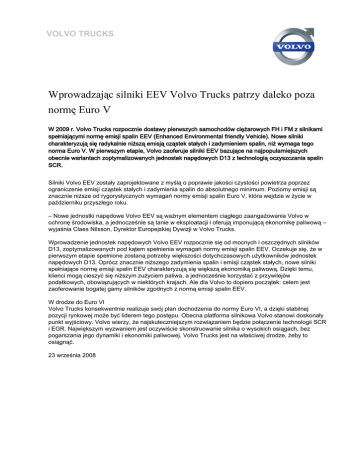 VOLVO TRUCKS Wprowadzając silniki EEV Volvo Trucks patrzy daleko poza normę Euro V W 2009 r. Volvo Trucks rozpocznie dostawy pierwszych samochodów ciężarowych FH i FM z silnikami spełniającymi normę emisji spalin EEV (Enhanced Environmental friendly Vehicle). Nowe silniki charakteryzują się radykalnie niższą emisją cząstek stałych i zadymieniem spalin, niż wymaga tego norma Euro V. W pierwszym etapie, Volvo zaoferuje silniki EEV bazujące na najpopularniejszych obecnie wariantach zoptymalizowanych jednostek napędowych D13 z technologią oczyszczania spalin SCR. Silniki Volvo EEV zostały zaprojektowane z myślą o poprawie jakości czystości powietrza poprzez ograniczenie emisji cząstek stałych i zadymienia spalin do absolutnego minimum. Poziomy emisji są znacznie niższe od rygorystycznych wymagań normy emisji spalin Euro V, która wejdzie w życie w październiku przyszłego roku. – Nowe jednostki napędowe Volvo EEV są ważnym elementem ciągłego zaangażowania Volvo w ochronę środowiska, a jednocześnie są tanie w eksploatacji i oferują imponującą ekonomikę paliwową – wyjaśnia Claes Nilsson, Dyrektor Europejskiej Dywizji w Volvo Trucks. Wprowadzenie jednostek napędowych Volvo EEV rozpocznie się od mocnych i oszczędnych silników D13, zoptymalizowanych pod kątem spełnienia wymagań normy emisji spalin EEV. Oczekuje się, że w pierwszym etapie spełnione zostaną potrzeby większości dotychczasowych użytkowników jednostek napędowych D13. Oprócz znacznie niższego zadymienia spalin i emisji cząstek stałych, nowe silniki spełniające normę emisji spalin EEV charakteryzują się większą ekonomiką paliwową. Dzięki temu, klienci mogą cieszyć się niższym zużyciem paliwa, a jednocześnie korzystać z przywilejów podatkowych, obowiązujących w niektórych krajach. Ale dla Volvo to dopiero początek: celem jest zaoferowanie bogatej gamy silników zgodnych z normą emisji spalin EEV. W drodze do Euro VI Volvo Trucks konsekwentnie realizuje swój plan dochodzenia do normy Euro VI, a dzięki stabilnej pozycji rynkowej może być liderem tego postępu. Obecna platforma silnikowa Volvo stanowi doskonały punkt wyjściowy. Volvo wierzy, że najskuteczniejszym rozwiązaniem będzie połączenie technologii SCR i EGR. Największym wyzwaniem jest oczywiście skonstruowanie silnika o wysokich osiągach, bez pogarszania jego dynamiki i ekonomiki paliwowej. Volvo Trucks jest na właściwej drodze, żeby to osiągnąć. 23 września 2008 VOLVO TRUCKS 9/23/2008 Aby uzyskać więcej informacji, skontaktuj się z: Per Nilsson, phone: +46 31 323 33 49, e-mail: [email protected] Renata Stefańska, tel.: +48 601 33 44 38, e-mail: [email protected]