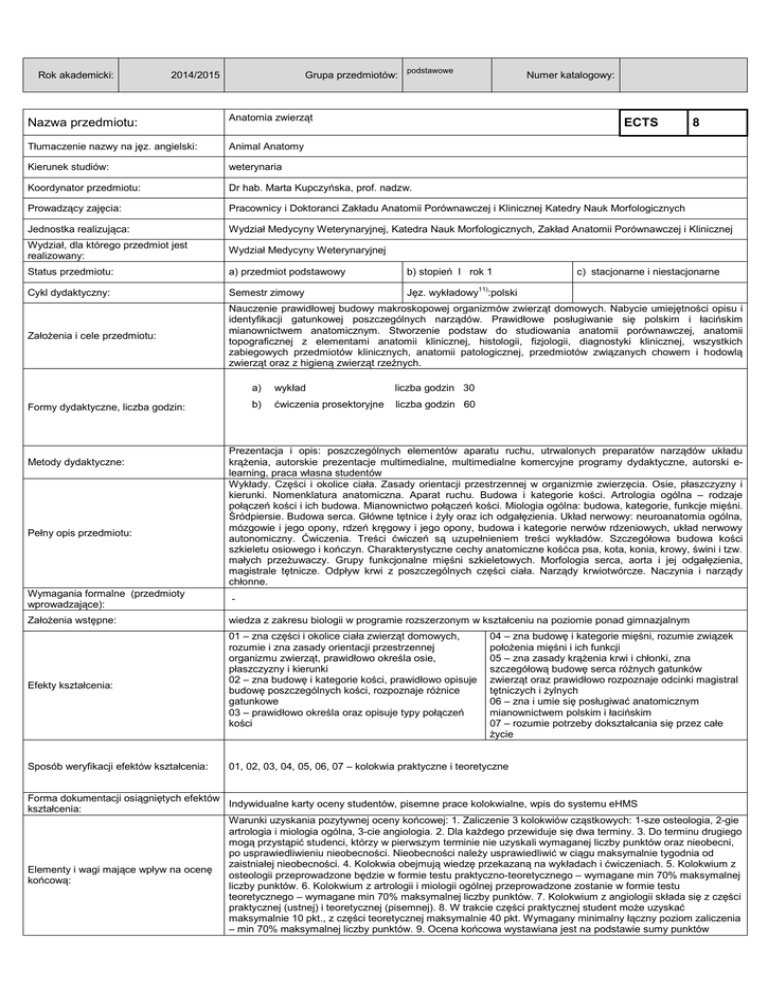 Rok akademicki: Grupa przedmiotów: 2014/2015 Nazwa przedmiotu: podstawowe Numer katalogowy: Anatomia zwierząt ECTS 8 Tłumaczenie nazwy na jęz. angielski: Animal Anatomy Kierunek studiów: weterynaria Koordynator przedmiotu: Dr hab. Marta Kupczyńska, prof. nadzw. Prowadzący zajęcia: Pracownicy i Doktoranci Zakładu Anatomii Porównawczej i Klinicznej Katedry Nauk Morfologicznych Jednostka realizująca: Wydział Medycyny Weterynaryjnej, Katedra Nauk Morfologicznych, Zakład Anatomii Porównawczej i Klinicznej Wydział, dla którego przedmiot jest realizowany: Wydział Medycyny Weterynaryjnej Status przedmiotu: a) przedmiot podstawowy b) stopień I rok 1 c) stacjonarne i niestacjonarne 11) Jęz. wykładowy :polski Cykl dydaktyczny: Semestr zimowy Założenia i cele przedmiotu: Nauczenie prawidłowej budowy makroskopowej organizmów zwierząt domowych. Nabycie umiejętności opisu i identyfikacji gatunkowej poszczególnych narządów. Prawidłowe posługiwanie się polskim i łacińskim mianownictwem anatomicznym. Stworzenie podstaw do studiowania anatomii porównawczej, anatomii topograficznej z elementami anatomii klinicznej, histologii, fizjologii, diagnostyki klinicznej, wszystkich zabiegowych przedmiotów klinicznych, anatomii patologicznej, przedmiotów związanych chowem i hodowlą zwierząt oraz z higieną zwierząt rzeźnych. Formy dydaktyczne, liczba godzin: Metody dydaktyczne: Pełny opis przedmiotu: a) wykład liczba godzin 30 b) ćwiczenia prosektoryjne liczba godzin 60 Prezentacja i opis: poszczególnych elementów aparatu ruchu, utrwalonych preparatów narządów układu krążenia, autorskie prezentacje multimedialne, multimedialne komercyjne programy dydaktyczne, autorski elearning, praca własna studentów Wykłady. Części i okolice ciała. Zasady orientacji przestrzennej w organizmie zwierzęcia. Osie, płaszczyzny i kierunki. Nomenklatura anatomiczna. Aparat ruchu. Budowa i kategorie kości. Artrologia ogólna – rodzaje połączeń kości i ich budowa. Mianownictwo połączeń kości. Miologia ogólna: budowa, kategorie, funkcje mięśni. Śródpiersie. Budowa serca. Główne tętnice i żyły oraz ich odgałęzienia. Układ nerwowy: neuroanatomia ogólna, mózgowie i jego opony, rdzeń kręgowy i jego opony, budowa i kategorie nerwów rdzeniowych, układ nerwowy autonomiczny. Ćwiczenia. Treści ćwiczeń są uzupełnieniem treści wykładów. Szczegółowa budowa kości szkieletu osiowego i kończyn. Charakterystyczne cechy anatomiczne kośćca psa, kota, konia, krowy, świni i tzw. małych przeżuwaczy. Grupy funkcjonalne mięśni szkieletowych. Morfologia serca, aorta i jej odgałęzienia, magistrale tętnicze. Odpływ krwi z poszczególnych części ciała. Narządy krwiotwórcze. Naczynia i narządy chłonne. Wymagania formalne (przedmioty wprowadzające): - Założenia wstępne: wiedza z zakresu biologii w programie rozszerzonym w kształceniu na poziomie ponad gimnazjalnym Efekty kształcenia: Sposób weryfikacji efektów kształcenia: 01 – zna części i okolice ciała zwierząt domowych, rozumie i zna zasady orientacji przestrzennej organizmu zwierząt, prawidłowo określa osie, płaszczyzny i kierunki 02 – zna budowę i kategorie kości, prawidłowo opisuje budowę poszczególnych kości, rozpoznaje różnice gatunkowe 03 – prawidłowo określa oraz opisuje typy połączeń kości 04 – zna budowę i kategorie mięśni, rozumie związek położenia mięśni i ich funkcji 05 – zna zasady krążenia krwi i chłonki, zna szczegółową budowę serca różnych gatunków zwierząt oraz prawidłowo rozpoznaje odcinki magistral tętniczych i żylnych 06 – zna i umie się posługiwać anatomicznym mianownictwem polskim i łacińskim 07 – rozumie potrzeby dokształcania się przez całe życie 01, 02, 03, 04, 05, 06, 07 – kolokwia praktyczne i teoretyczne Forma dokumentacji osiągniętych efektów Indywidualne karty oceny studentów, pisemne prace kolokwialne, wpis do systemu eHMS kształcenia: Warunki uzyskania pozytywnej oceny końcowej: 1. Zaliczenie 3 kolokwiów cząstkowych: 1-sze osteologia, 2-gie artrologia i miologia ogólna, 3-cie angiologia. 2. Dla każdego przewiduje się dwa terminy. 3. Do terminu drugiego mogą przystąpić studenci, którzy w pierwszym terminie nie uzyskali wymaganej liczby punktów oraz nieobecni, po usprawiedliwieniu nieobecności. Nieobecności należy usprawiedliwić w ciągu maksymalnie tygodnia od zaistniałej nieobecności. 4. Kolokwia obejmują wiedzę przekazaną na wykładach i ćwiczeniach. 5. Kolokwium z Elementy i wagi mające wpływ na ocenę osteologii przeprowadzone będzie w formie testu praktyczno-teoretycznego – wymagane min 70% maksymalnej końcową: liczby punktów. 6. Kolokwium z artrologii i miologii ogólnej przeprowadzone zostanie w formie testu teoretycznego – wymagane min 70% maksymalnej liczby punktów. 7. Kolokwium z angiologii składa się z części praktycznej (ustnej) i teoretycznej (pisemnej). 8. W trakcie części praktycznej student może uzyskać maksymalnie 10 pkt., z części teoretycznej maksymalnie 40 pkt. Wymagany minimalny łączny poziom zaliczenia – min 70% maksymalnej liczby punktów. 9. Ocena końcowa wystawiana jest na podstawie sumy punktów uzyskanych ze wszystkich zaliczeń cząstkowych. Uwzględniana jest liczba punktów z terminu, w którym student uzyskał wymaganą minimalną liczbę punktów. Waga oceny końcowej: 0% - 69,5% maksymalnej liczby punktów – niedostateczny 70% - 75,5% maksymalnej liczby punktów – dostateczny 76% - 81,5% maksymalnej liczby punktów – dostateczny plus 82% - 87,5% maksymalnej liczby punktów – dobry 88% - 93,5% maksymalnej liczby punktów – dobry plus 94% - 100% maksymalnej liczby punktów – bardzo dobry Miejsce realizacji zajęć: Sala wykładowa i prosektoria Literatura podstawowa i uzupełniająca23): 1. Krysiak K,.Kobryń H.,.Kobryńczuk F. Anatomia zwierząt t I. PWN, Warszawa 2013 (copyright 2005). 3. Krysi