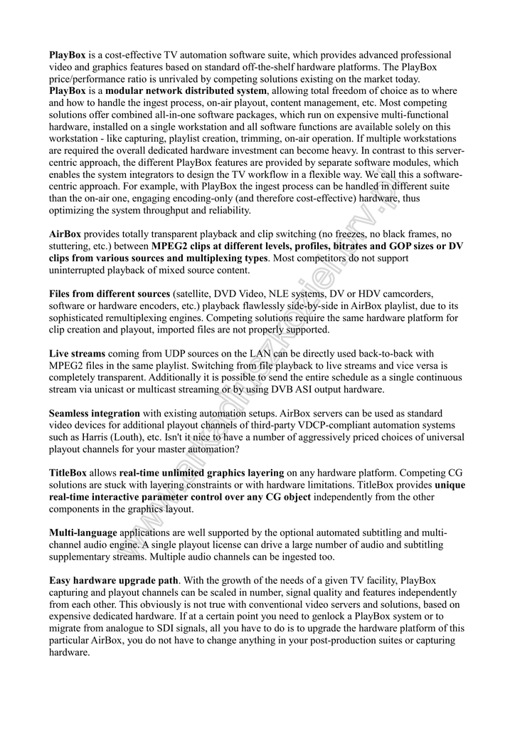 PlayBox is a cost-effective TV automation software suite, which provides advanced professional video and graphics features based on standard off-the-shelf hardware platforms. The PlayBox price/performance ratio is unrivaled by competing solutions existing on the market today. PlayBox is a modular network distributed system, allowing total freedom of choice as to where and how to handle the ingest process, on-air playout, content management, etc. Most competing solutions offer combined all-in-one software packages, which run on expensive multi-functional hardware, installed on a single workstation and all software functions are available solely on this workstation - like capturing, playlist creation, trimming, on-air operation. If multiple workstations are required the overall dedicated hardware investment can become heavy. In contrast to this servercentric approach, the different PlayBox features are provided by separate software modules, which enables the system integrators to design the TV workflow in a flexible way. We call this a softwarecentric approach. For example, with PlayBox the ingest process can be handled in different suite than the on-air one, engaging encoding-only (and therefore cost-effective) hardware, thus optimizing the system throughput and reliability. AirBox provides totally transparent playback and clip switching (no freezes, no black frames, no stuttering, etc.) between MPEG2 clips at different levels, profiles, bitrates and GOP sizes or DV clips from various sources and multiplexing types. Most competitors do not support uninterrupted playback of mixed source content. Files from different sources (satellite, DVD Video, NLE systems, DV or HDV camcorders, software or hardware encoders, etc.) playback flawlessly side-by-side in AirBox playlist, due to its sophisticated remultiplexing engines. Competing solutions require the same hardware platform for clip creation and playout, imported files are not properly supported. Live streams coming from UDP sources on the LAN can be directly used back-to-back with MPEG2 files in the same playlist. Switching from file playback to live streams and vice versa is completely transparent. Additionally it is possible to send the entire schedule as a single continuous stream via unicast or multicast streaming or by using DVB ASI output hardware. Seamless integration with existing automation setups. AirBox servers can be used as standard video devices for additional playout channels of third-party VDCP-compliant automation systems such as Harris (Louth), etc. Isn't it nice to have a number of aggressively priced choices of universal playout channels for your master automation? TitleBox allows real-time unlimited graphics layering on any hardware platform. Competing CG solutions are stuck with layering constraints or with hardware limitations. TitleBox provides unique real-time interactive parameter control over any CG object independently from the other components in the graphics layout. Multi-language applications are well supported by the optional automated subtitling and multichannel audio engine. A single playout license can drive a large number of audio and subtitling supplementary streams. Multiple audio channels can be ingested too. Easy hardware upgrade path. With the growth of the needs of a given TV facility, PlayBox capturing and playout channels can be scaled in number, signal quality and features independently from each other. This obviously is not true with conventional video servers and solutions, based on expensive dedicated hardware. If at a certain point you need to genlock a PlayBox system or to migrate from analogue to SDI signals, all you have to do is to upgrade the hardware platform of this particular AirBox, you do not have to change anything in your post-production suites or capturing hardware. Easy software upgrade path. Following facility growth, additional PlayBox software can be added without any shipping. Existing PlayBox USB dongles can be remotely programmed to license new modules with a simple e-mail upgrade. Schedule creation does not waste valuable hardware for clip preview and trimming, like most competitors do. Instead our schedule creation employs software decoding for trimming, with advanced trimming features like multi-zone selection and division of different zones into separate playlist entries. This enables the local add-insertion by easily removing the original commercials from a recorded feed. Cost-effective. PlayBox is an optimized investment for a number of reasons. Each module costs a fraction of the cheapest competing solutions we know. The ability to use separate servers for capturing and for playout is also a great money saving factor. Due to the PlayBox modular approach, on a certain server you can invest only in the functionality you need and in the hardware it requires. Most supplementary software such as ListBox, DataBox, SafeBox and Multi-AirBox can be added at a later stage, plus they do not require any hardware at all. ---------------------------------------PL---------------------------------PlayBox jest tanim oprogramowaniem automatyzacji emisji, które daje możliwość emitowania wysokiej jakości obrazu wideo i grafiki w oparciu o łatwo dostępne na rynku platformy sprzętowe. Stosunek ceny do jakości i możliwości jest znacznie bardziej korzystny w porównaniu do istniejących obecnie rozwiązań na rynku światowym. PlayBox jest modułowym, dystrybuowanym sieciowo systemem automatyzacji emisji, daje totalną swobodę wyboru kiedy i jak dokonujemy przechwytu obrazu, odtwarzania materiału, zarządzania materiałem, itp. Konkurencyjne rozwiązania oferują kombinacje oprogramowania „wszystko w jednym”, która pracuje na wielofunkcyjnym, drogim sprzęcie, to wszystko umieszczone jest w jednej stacji roboczej, wszystkie funkcje są dostępne jednocześnie – Przechwytywanie, tworzenie playlisty, przycinanie materiału, operacje na żywo. Jeśli wymagane jest zastosowa