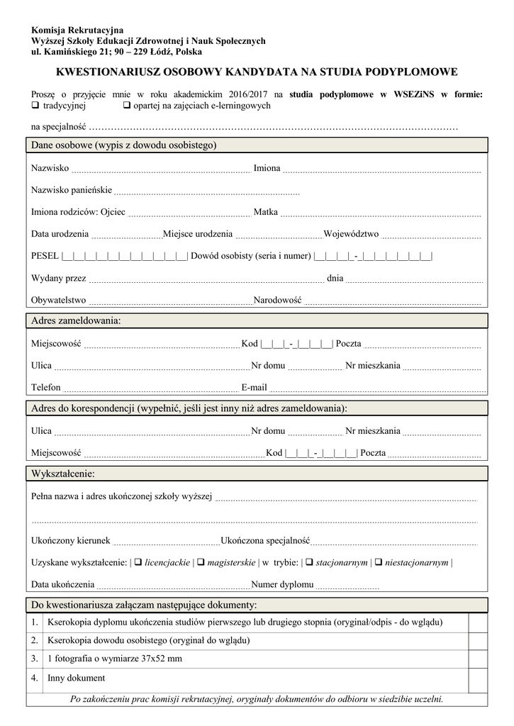 Komisja Rekrutacyjna Wyższej Szkoły Edukacji Zdrowotnej i Nauk Społecznych ul. Kamińskiego 21; 90 – 229 Łódź, Polska KWESTIONARIUSZ OSOBOWY KANDYDATA NA STUDIA PODYPLOMOWE Proszę o przyjęcie mnie w roku akademickim 2016/2017 na studia podyplomowe w WSEZiNS w formie: tradycyjnej opartej na zajęciach e-lerningowych na specjalność ……………………………………………………………………………………………………… Dane osobowe (wypis z dowodu osobistego) Nazwisko Imiona Nazwisko panieńskie Imiona rodziców: Ojciec Data urodzenia Matka Województwo Miejsce urodzenia PESEL |__|__|__|__|__|__|__|__|__|__|__| Dowód osobisty (seria i numer) |__|__|__|_-_|__|__|__|__|__|__| Wydany przez dnia Narodowość Obywatelstwo Adres zameldowania: Miejscowość Kod |__|__|_-_|__|__|__| Poczta Ulica Nr domu Telefon Nr mieszkania E-mail Adres do korespondencji (wypełnić, jeśli jest inny niż adres zameldowania): Ulica Nr domu Miejscowość Nr mieszkania Kod |__|__|_-_|__|__|__| Poczta Wykształcenie: Pełna nazwa i adres ukończonej szkoły wyższej Ukończony kierunek Ukończona specjalność Uzyskane wykształcenie: | licencjackie | magisterskie | w trybie: | stacjonarnym | niestacjonarnym | Data ukończenia Numer dyplomu Do kwestionariusza załączam następujące dokumenty: 1. Kserokopia dyplomu ukończenia studiów pierwszego lub drugiego stopnia (oryginał/odpis - do wglądu) 2. Kserokopia dowodu osobistego (oryginał do wglądu) 3. 1 fotografia o wymiarze 37x52 mm 4. Inny dokument Po zakończeniu prac komisji rekrutacyjnej, oryginały dokumentów do odbioru w siedzibie uczelni. OŚWIADCZENIE Oświadczam, iż wyrażam zgodę na odbywanie studiów z wykorzystaniem metod i technik kształcenia na odległość – w szczególności zgodnie z warunkami określonymi przepisami Rozporządzenia Ministra Nauki i Szkolnictwa Wyższego z dnia 02 listopada 2011 roku zmieniającego rozporządzenie w sprawie warunków, jakie muszą być spełnione, aby zajęcia dydaktyczne na studiach mogły być prowadzone z wykorzystaniem metod i technik kształcenia na odległość. Data i podpis Kandydata OŚWIADCZENIE – WYBÓR OFERTY PARTNERÓW Deklaruję wolę skorzystania z pomocy w zakresie zapewnienia właściwego komfortu studiowania i dodatkowej oferty usług przedstawionej przez wskazanego poniżej partnera WSEZiNS: Kolegium Pracowników Służb Społecznych w Biłgoraju - BIŁGORAJ Beskidzkie Szkoły Sztuki Użytkowej KRAKÓW SZCZECIN GDAŃSK FALKOS Usługi Szkoleniowo – Informatyczne - GRUDZIĄDZ Dolnośląskie Centrum Kształcenia Dorosłych - LEGNICA Ośrodek Kopalnia Kadr - RZESZÓW INTERCCOM - TYCHY Wielicki Partner WSEZiNS - WIELICZKA Firma Szkoleniowo - Konsultingowa NOWE PERSPEKTYWY - ZABRZE Akademia Nauki - Centrum Nauki i Muzyki - BIELSKO-BIAŁA Logos - CZĘSTOCHOWA Akademia Nauki - OSTROWIEC ŚWIĘTOKRZYSKI Akademia Nauki - OTWOCK Akademia Nauki – ŚREM Nauczycielskie Kolegium Języków Obcych - SANOK Inny…………………………………………………………… Rezygnuję z oferty partnerów WSEZiNS Data i podpis Kandydata Sposób uzyskania informacji o WSEZiNS: opinia znajomych opinia rodziny prezentacja Uczelni w szkole targi edukacyjne Internet informatory ogólnopolskie ulotka plakat radio prasa inne OŚWIADCZENIE Prawdziwość danych zawartych w kwestionariuszu osobowym potwierdzam własnoręcznym podpisem. Wyrażam zgodę na przetwarzanie moich danych osobowych dla potrzeb Wyższej Szkoły Edukacji Zdrowotnej i Nauk Społecznych (zgodnie z ustawą z dnia 29.09.1997 r. o ochronie danych osobowych (Dz.U. nr 133 poz. 883 z późn. zm.) na czas trwania studiów i w okresie 5 lat po ich zakończeniu zgodnie z ustawą Prawo o szkolnictwie wyższym. Data i podpis Kandydata INFORMACJA UCZELNI Dane są zebrane dla potrzeb Wyższej Szkoły Edukacji Zdrowotnej i Nauk Społecznych. Osobie, której dane dotyczą, przysługuje prawo wglądu w dane oraz prawo ich poprawienia. Data i podpis przyjmującego kwestionariusz i dokumenty