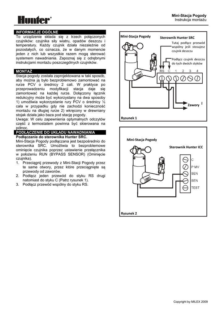 Mini-Stacja Pogody Instrukcja montażu INFORMACJE OGÓLNE To urządzenie składa się z trzech połączonych czujników: czujnika siły wiatru, opadów deszczu i temperatury. Każdy czujnik działa niezależnie od pozostałych, co oznacza, że w danym momencie jeden z nich lub wszystkie razem mogą sterować systemem nawadniania. Zapoznaj się z odrębnymi instrukcjami montażu poszczególnych czujników. MONTAŻ Stacja pogody została zaprojektowana w taki sposób, aby można ją było bezproblemowo zamontować na rurze PCV o średnicy 2 cali. W praktyce po przeprowadzeniu modyfikacji stacja daje się zamontować na każdej rurze. Dołączony łącznik redukcyjny może być wykorzystany na dwa sposoby 1) umożliwia wykorzystanie rury PCV o średnicy ½ cala w przypadku gdy nie zachodzi konieczność montażu na długiej rurze 2) wkręcony w drewniany stojak działa jako baza pod stację pogody. Uwaga: W celu zapewnienia optymalnych odczytów część z termostatem powinna być skierowana na północ. PODŁĄCZENIE DO UKŁADU NAWADNIANIA Podłączanie do sterownika Hunter SRC. Mini-Stacja Pogody podłączana jest bezpośrednio do sterownika SRC. Umożliwia to bezproblemowe ominięcie czujnika poprzez ustawienie przełącznika w położeniu RUN (BYPASS SENSOR) (Ominięcie czujnika). 1. Przeciągnij przewody z Mini-Stacji Pogody przez te same otwory, przez które przeciągnięte są przewody od zaworów. 2. Podłącz jeden przewód do styku RS drugi natomiast do styku C (Patrz rysunek 1). 3. Podłącz przewód wspólny do styku RS. Mini‐Stacja Pogody Sterownik Hunter SRC Tutaj podłącz przewód wspólny jeśli stosujesz czujnik deszczu Podłącz czujnik deszczu do tych dwóch styków Zawory Rysunek 1 Mini‐Stacja Pogody Sterownik Hunter ICC Rysunek 2 Copyright by MILEX 2009 Mini-Stacja Pogody Instrukcja montażu Podłączanie do sterownika Hunter ICC Mini-Stacja Pogody podłączana jest bezpośrednio do sterownika ICC. Umożliwia to bezproblemowe ominięcie czujnika poprzez przestawienie przełącznika na panelu sterownika. 1. Wyjmij łącznik z styków SEN. 2. Przeciągnij przewody od czujnika deszczu przez te same otwory, przez które przeciągnięte są przewody od zaworów. 3. Podłącz jeden przewód do styku SEN drugi natomiast do innego styku SEN (Patrz rys. 2). Podłączanie do innych sterowników 24V Wszystkie trzy czujniki zostały połączone szeregowo, także do podłączenia sterownika wymagane są tylko dwa przewody. Użyj zielonego i srebrnego (zdejmij izolację) do podłączenia urządzenia (Patrz rys. 3). Następnie postępuj zgodnie z instrukcjami dla poszczególnych czujników lub podłącz dwa przewody do zacisku sterownika, jeśli jest dostępny (patrz rys. 4) W przypadku sterowników z zestykami zwiernymi (większość modeli Toro) skontaktuj się z lokalnym przedstawicielem. W przypadku przedłużania przewodu należy użyć przynajmniej przewodu 18AWG. Mini‐Stacja Pogody Sterownik 24V Zielony Srebrny (zdejmij izolację) Biały Zawory Rysunek 3 Wspólny przewód Mini‐Stacja Pogody Sterownik Zielony Niebieski lub Czerwony : Sprawdź specyfikacje Rysunek 4 Oficjalny Importer i Dystrybutor w Polsce: MILEX systemy nawadniania Ul. Obrońców Dobrzykowa 3 09-522 Dobrzyków www.milex.pl; [email protected] Tel. 024 277 52 22 fax. 024 277 54 27 Copyright by MILEX 2009