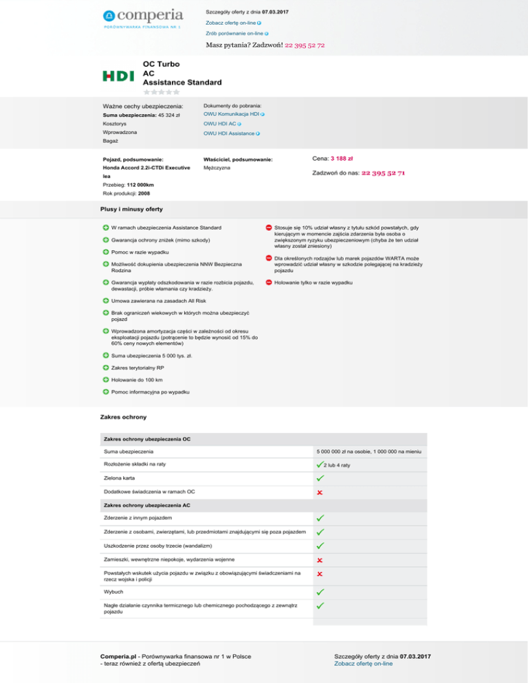 Szczegóły oferty z dnia 07.03.2017 Zobacz ofertę on-line Zrób porównanie on-line Masz pytania? Zadzwoń! 22 395 52 72 OC Turbo AC Assistance Standard Ważne cechy ubezpieczenia: Dokumenty do pobrania: Suma ubezpieczenia: 45 324 zł OWU Komunikacja HDI Kosztorys OWU HDI AC Wprowadzona OWU HDI Assistance Bagaż Pojazd, podsumowanie: Właściciel, podsumowanie: Honda Accord 2.2i-CTDi Executive Mężczyzna Cena: 3 188 zł Zadzwoń do nas: 22 395 52 71 lea Przebieg: 112 000km Rok produkcji: 2008 Plusy i minusy oferty W ramach ubezpieczenia Assistance Standard Gwarancja ochrony zniżek (mimo szkody) Stosuje się 10% udział własny z tytułu szkód powstałych, gdy kierującym w momencie zajścia zdarzenia była osoba o zwiększonym ryzyku ubezpieczeniowym (chyba że ten udział własny został zniesiony) Pomoc w razie wypadku Możliwość dokupienia ubezpieczenia NNW Bezpieczna Rodzina Gwarancja wypłaty odszkodowania w razie rozbicia pojazdu, dewastacji, próbie włamania czy kradzieży. Dla określonych rodzajów lub marek pojazdów WARTA może wprowadzić udział własny w szkodzie polegającej na kradzieży pojazdu Holowanie tylko w razie wypadku Umowa zawierana na zasadach All Risk Brak ograniczeń wiekowych w których można ubezpieczyć pojazd Wprowadzona amortyzacja części w zależności od okresu eksploatacji pojazdu (potrącenie to będzie wynosić od 15% do 60% ceny nowych elementów) Suma ubezpieczenia 5 000 tys. zł. Zakres terytorialny RP Holowanie do 100 km Pomoc informacyjna po wypadku Zakres ochrony Zakres ochrony ubezpieczenia OC Suma ubezpieczenia Rozłożenie składki na raty 5 000 000 zł na osobie, 1 000 000 na mieniu 2 lub 4 raty Zielona karta Dodatkowe świadczenia w ramach OC Zakres ochrony ubezpieczenia AC Zderzenie z innym pojazdem Zderzenie z osobami, zwierzętami, lub przedmiotami znajdującymi się poza pojazdem Uszkodzenie przez osoby trzecie (wandalizm) Zamieszki, wewnętrzne niepokoje, wydarzenia wojenne Powstałych wskutek użycia pojazdu w związku z obowiązującymi świadczeniami na rzecz wojska i policji Wybuch Nagłe działanie czynnika termicznego lub chemicznego pochodzącego z zewnątrz pojazdu Comperia.pl - Porównywarka finansowa nr 1 w Polsce - teraz również z ofertą ubezpieczeń Szczegóły oferty z dnia 07.03.2017 Zobacz ofertę on-line Szczegóły oferty z dnia 07.03.2017 Zobacz ofertę on-line Zrób porównanie on-line Masz pytania? Zadzwoń! 22 395 52 72 Powódź Lawina Osunięcie i zapadanie się ziemi Grad Uderzenie pioruna Huragan Trzęsienie ziemi Kradzież pojazdu z wyłączeniem przywłaszczenia Rabunek/Rozbój Upadek statku powietrznego Pożar Zakres ochrony Assistance Suma ubezpieczenia Zakres terytorialny Wiek pojazdu do którego można wykupić ubezpieczenie Rodzaj pojazdu na który można wykupić ubezpieczenie Ograniczenia ze względu na sposób użytkowania pojazdu (np. taxi, nauka jazdy, rent a car) Opcje zawarcia Usprawnienie pojazdu na miejscu zdarzenia Pomoc w razie awarii Pomoc w razie wypadku Limit odległości od miejsca zamieszkania Miejsce holowania Samochód zastępczy Złomowanie pojazdu Parkowanie pojazdu Transport zastępczy/przewóz osób Nocleg/zakwaterowanie Dodatkowe informacje Terytorium ochrony Terytorium ochrony ubezpieczenia AC Kraje Unii Europejskiej Algeria Albania Libia Maroko Mołdawia Białoruś Rosja (część europejska) Czarnogóra Serbia Comperia.pl - Porównywarka finansowa nr 1 w Polsce - teraz również z ofertą ubezpieczeń Szczegóły oferty z dnia 07.03.2017 Zobacz ofertę on-line Szczegóły oferty z dnia 07.03.2017 Zobacz ofertę on-line Zrób porównanie on-line Masz pytania? Zadzwoń! 22 395 52 72 Bośnia i Hercegowina Tunezja Iran Turcja tylko w części europejskiej Izrael Ukraina Wyłączenia Wyłączenia ubezpieczenia AC Udział własny w szkodzie Określenie wysokości udziału własnego lub jego zniesienie następuje przy zawarciu umowy. Amortyzacja za części Wprowadzona (możliwość zniesienia). Dla pojazdów w wieku do 5 lat amortyzacja nie jest potrącana. Rodzaj stacji naprawczej (ze względu na metodę naprawy) Faktura - serwis / Wariant kosztorys dowolność, wypłacane jest 50 proc. wartości stawki roboczogodziny stacji autoryzowanej zlokalizowanej w miejscu zamieszkania ubezpieczonego. Rodzaj używanych części do naprawy Faktura - części nowe oryginalne / Kosztorys - od części nowych oryginalnych odlicza się wskaźnik zużycia eksploatacyjnego części z uwzględnieniem amortyzacji za części. Okres eksploatacji pojazdu w jakim można wykupić polisę AutoCasco Do 12 lat (w przypadku bezszkodowej kontynuacji - do 15 lat) Minimalna szkoda (franszyza integralna) 500 zł (nie dotyczy wymiany kluczyków, zamków, lusterek zewnętrznych i fotelików dla dzieci) Szkoda została spowodowana wskutek rażącego niedbalstwa Kierowanie pojazdem w stanie nietrzeźwości, po zażyciu alkoholu, środków odurzających, substancji psychotropowych, lub jego pochodnych Kierujący pojazdem nie posiadał uprawnień do prowadzenia pojazdu Sprawca zbiegł lub oddalił się z miejsca zdarzenia Pojazd nie miał ważnego przeglądu technicznego lub nie jest dopuszczony do ruchu Nie wypłaci jeśli miało to wpływ na zaistnienie szkody Przywłaszczenie pojazdu Nie wypłaci Kradzież wyposażenia dodatkowego Jest w standardzie do 3000 zł. Możliwość doubezpieczenia na większą sumę. Uszkodzenie wyposażenia dodatkowego pojazdu Wyposażenie dodatkowe do 3000 zł jest ubezpieczone w standardzie. Możliwość doubezpieczenia na większą sumę. Wada fabryczna pojazdu, jego naprawa, użytkowanie w sposób niezgodny z jego przeznaczeniem Uszkodzenie lub zniszczenie ogumienia Nie wypłaci, chyba że zostały uszkodzone również inne części. Konsumpcja sumy ubezpieczenia Wprowadzona (możliwość zniesienia) Szyby Wypłaci (możliwość dokupienia pakietu szybowego, który chroni zniżki z Auto Casco w HDI) Wartość pojazdu Dla auta fabrycznie nowego przez okres 6 miesięcy war