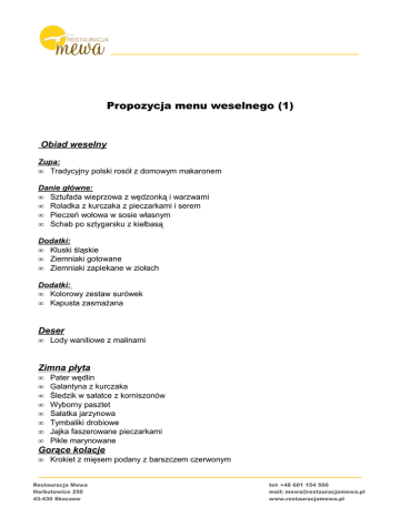 Propozycja menu weselnego (1) Obiad weselny Zupa: • Tradycyjny polski rosół z domowym makaronem Danie główne: • Sztufada wieprzowa z wędzonką i warzwami • Roladka z kurczaka z pieczarkami i serem • Pieczeń wołowa w sosie własnym • Schab po sztygarsku z kiełbasą Dodatki: • Kluski śląskie • Ziemniaki gotowane • Ziemniaki zapiekane w ziołach Dodatki: • Kolorowy zestaw surówek • Kapusta zasmażana Deser • Lody waniliowe z malinami Zimna płyta • • • • • • • • Pater wędlin Galantyna z kurczaka Śledzik w sałatce z korniszonów Wyborny pasztet Sałatka jarzynowa Tymbaliki drobiowe Jajka faszerowane pieczarkami Pikle marynowane • Krokiet z mięsem podany z barszczem czerwonym Gorące kolacje Restauracja Mewa Harbutowice 250 43-430 Skoczow tel: +48 601 154 506 mail: [email protected] www.restauracjamewa.pl • Bogracz wołowy Napoje • Kawa, herbata – bez ograniczeń Atrakcje • • Powitanie Pary Młodej chlebem i solą Szampan na powitanie gości weselnych KOSZT: 140 zł/osobę Restauracja Mewa Harbutowice 250 43-430 Skoczow tel: +48 601 154 506 mail: [email protected] www.restauracjamewa.pl