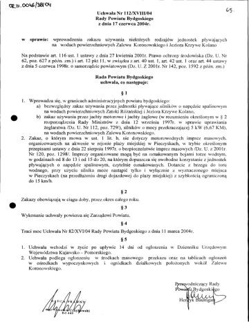 °ZM. 004£. /381 ał G5 Uchwała Nr 112/XVIII/04 Rady Powiatu Bydgoskiego z dnia 17 czerwca 2004r. w sprawie: wprowadzenia zakazu u żywania niektórych rodzajów jednostek p ływaj ących na wodach powierzchniowych Zalewu Koronowskiego i Jeziora Krzywe Kolano Na podstawie art. 116 ust. 1 ustawy z dnia 27 kwietnia 2001r. Prawo ochrony środowiska (Dz. U. Nr 62, poz. 627 z pó źn. zm.) i art. 12 pkt 11, w zwi ązku z art. 40 ust. 1, art. 42 ust. 1 oraz art. 44 ustawy z dnia 5 czerwca 1998r. o samorz ądzie powiatowym (Dz. U. Z 2001r. Nr 142, poz. 1592 z pó źn. zm .) Rada Powiatu Bydgoskiego uchwala, co następuje: §1 • 1. Wprowadza się, w granicach administracyjnych powiatu bydgoskiego: a) bezwzględny zakaz używania przez jednostki p ływaj ące silników o napędzie spalinowym na wodach powierzchniowych Zatoki Ró żańskiej i Jeziora Krzywe Kolano, b) zakaz używania przez jachty motorowe i jachty żaglowe (w rozumieniu okre ślonym w § 2 rozporządzenia Rady Ministrów z dnia 12 wrze śnia 1997r. w sprawie uprawiania żeglarstwa /Dz. U. Nr 112, poz. 729/), silników o mocy przekraczaj ącej 5 kW (6,67 KM), na wodach powierzchniowych Zalewu Koronowskiego. 2. Zakaz, o którym mowa w ust. 1 lit. b, nie dotyczy motorowodnych imprez masowych, organizowanych na akwenie w rejonie plaży miejskiej w Pieczyskach, w trybie okre ślonym przepisami ustawy z dnia 22 sierpnia 1997r. o bezpiecze ństwie imprez masowych /Dz. U. z 2001r. Nr 120, poz. 1298/. Imprezy organizowane mog ą być na oznakowanym bojami torze wodnym, w godzinach od 8 do 13 i od 15 do 20, na którym dopuszcza si ę swobodne korzystanie z jednostek pływaj ących o nap ędzie spalinowym, czytelnie oznakowanych. Dotarcie z brzegu do toru wodnego, przy u życiu silnika może nastąpić tylko i wyłącznie z wyznaczonego miejsca w Pieczyskach (na przed łużeniu drogi dojazdowej do pla ży miejskiej) z szybko ścią ograniczon ą do 15 km/h. §2 • Zakazy obowi ązuj ą w ciągu doby, przez okres całego roku. §3 Wykonanie uchwały powierza si ę Zarządowi Powiatu. §4 Traci moc Uchwała Nr 82/XVI/04 Rady Powiatu Bydgoskiego z dnia 11 marca 2004r. §5 1. Uchwała wchodzi w życie po upływie 14 dni od ogłoszenia w Dzienniku Urz ędowym Województwa Kujawsko — Pomorskiego. 2. Uchwała podlega ogłoszeniu w środkach masowego przekazu oraz na tablicach og łosze ń w ośrodkach wypoczynkowych i ogródkach dzia łkowych położonych wokół Zalewu Koronowskiego. wodniczący Rady ydgoski go Herif yk Baumga Uzasadnienie Na skutek wniosków i apeli opinii publicznej wyraż onych m.in. przez przedstawicieli Okr ęgu Polskiego Zwi ązku Wę dkarskiego w Bydgoszczy oraz reprezentantów sportów motorowodnych Rada Powiatu Bydgoskiego podj ęła niniejszą uchwałę, skutkuj ącą wycofaniem z obrotu prawnego Uchwa ły Nr 82/XVI/04 Rady Powiatu Bydgoskiego z dnia 11 marca 2004r. w sprawie wprowadzenia zakazu używania niektórych rodzajów jednostek p ływaj ących na wodach powierzchniowych Zalewu Koronowskiego i Jeziora Krzywe Kolano. Zasadno ść podj ęcia przedmiotowej uchwa ły omówiona została na Komisjach Rady. Z mocy art. 116 ust. 4 ustawy z dnia 27 kwietnia 2001r. Prawo ochrony środowiska (Dz. U. Nr 62, poz. 627 z pó źn. zm .) ograniczenia nie dotycz ą jednostek pływaj ących, których u życie jest konieczne do celów bezpiecze ń stwa publicznego lub do utrzymania cieków i zbiorników wodnych, a w szczególno ści Policji, Państwowej i Społecznej Straży Rybackiej, Wodnego Ochotniczego Pogotowia Ratunkowego, czy te ż innych jednostek, które wykonuj ą zadania zwi ązane z prowadzeniem racjonalnej gospodarki rybackiej, ratownictwem b ądź zabezpieczaniem bezpieczeństwa wypoczynku zorganizowanego. Zakazy zawarte w § 1 przedmiotowej uchwa ły, powołuj ą się na definicje dotycz ące jachtów żaglowych i jachtów motorowych okre ślone w § 2 rozporządzenia Rady Ministrów z dnia 12 wrze śnia 1997r. w sprawie uprawiania żeglarstwa /Dz. U. Nr 112, poz. 729/: „Jacht żaglowy oznacza statek o nap ędzie żaglowym przeznaczony do uprawiania sportu i rekreacji; jacht żaglowy może być wyposażony w pomocniczy nap ęd mechaniczny", „Jacht motorowy oznacza statek o nap ędzie mechanicznym przeznaczony do uprawiania sportu i rekreacji; za jacht motorowy uwa ża się również skuter wodny, łódź pneumatyczną i poduszkowiec". W związku z powyższym, zakazy nie obejmuj ą jednostek wpisanych do Krajowego Rejestru Statków, prowadzących na akwenie Zalewu Koronowskiego dzia łalno ść gospodarczą. Akweny okre ślone w § 1 lit. „a" uchwały, zostaną oznakowane tablicami informuj ącymi o zakazie używania przez jednostki p ływaj ące, silników o nap ędzie spalinowym.