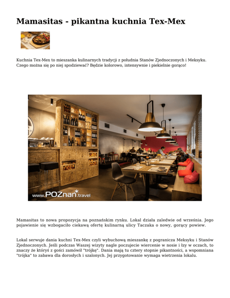 Mamasitas - pikantna kuchnia Tex-Mex Kuchnia Tex-Mex to mieszanka kulinarnych tradycji z południa Stanów Zjednoczonych i Meksyku. Czego można się po niej spodziewać? Będzie kolorowo, intensywnie i piekielnie gorąco! Mamasitas to nowa propozycja na poznańskim rynku. Lokal działa zaledwie od września. Jego pojawienie się wzbogaciło ciekawą ofertę kulinarną ulicy Taczaka o nowy, gorący powiew. Lokal serwuje dania kuchni Tex-Mex czyli wybuchową mieszankę z pogranicza Meksyku i Stanów Zjednoczonych. Jeśli podczas Waszej wizyty nagle poczujecie wiercenie w nosie i łzy w oczach, to znaczy że któryś z gości zamówił "trójkę". Dania mają tu cztery stopnie pikantności, a wspomniana "trójka" to zabawa dla dorosłych i szalonych. Jej przygotowanie wymaga wietrzenia lokalu. Otwarta kuchnia pozwala podglądać kucharzy przy pracy. Warto zwrócić uwagę na piec przeznaczony do wypiekania kukurydzianych placków, dzięki któremu flagowe tortille i buritos są zawsze świeże i wypieczone zgodnie z oryginalną recepturą. Dwa charakterystyczne smaki, z którymi zetkniecie się w Mamasitas to świeża kolendra i kurczak wędzony w prawdziwym dymie, na specjalnej mieszance drewnianych wiórów. Oba intensywne, ciekawe i warte wycieczki do poznańskiej ambasady kuchni Tex-Mex. W obszernej karcie znajdziemy wiele ciekawostek, które warto zjeść i o których warto posłuchać. Sympatyczna obsługa chętnie podpowie od czego zacząć kulinarne eksperymenty w Mamasitas. Nie dziwcie się rozleglej wiedzy o tradycjach kulinarnych tego odległego zakątka ziemi. Właściciel lokalu to Amerykanin, wychowany w tych właśnie rejonach. To co dla nas jest egzotyczna wyprawą, dla gospodarza stanowi domowa kuchnię. Zobacz pełne menu: ● ● menu polskie menu angielskie Mamasitas ul. Taczaka 24, 61-819 Poznań www.facebook.com/mamasitasrestauracja | tel.: +48 61 225 77 55 Zobacz także poprzednie wpisy publikowane w dziale: AKTUALNOŚCI GASTRONOMICZNE Tekst: www.poznan.travel | Foto: www.poznan.travel