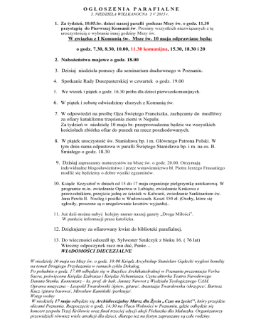 OGŁOSZENIA PARAFIALNE 5. NIEDZIELA WIELKANOCNA 3 V 2015 r. 1. Za tydzień, 10.05.br. dzieci naszej parafii podczas Mszy św. o godz. 11.30 przystąpią do Pierwszej Komunii św. Prosimy wszystkich niezwiązanych z tą uroczystością o wybranie innej godziny Mszy św. W związku z I Komunią św. Msze św. 10 maja odprawiane będą: o godz. 7.30, 8.30, 10.00, 11.30 komunijna, 15.30, 18.30 i 20 2. Nabożeństwa majowe o godz. 18.00 3. Dzisiaj niedziela pomocy dla seminarium duchownego w Poznaniu. 4. Spotkanie Rady Duszpasterskiej w czwartek o godz. 19.00 5. We wtorek i piątek o godz. 16.30 próba dla dzieci pierwszokomunijnych. 6. W piątek i sobotę odwiedzimy chorych z Komunią św. 7. W odpowiedzi na prośbę Ojca Świętego Franciszka, zachęcamy do modlitwy za ofiary kataklizmu trzęsienia ziemi w Nepalu. Za tydzień w niedzielę 10 maja br. przeprowadzona będzie we wszystkich kościołach zbiórka ofiar do puszek na rzecz poszkodowanych. 8. W piątek uroczystość św. Stanisława bp. i m. Głównego Patrona Polski. W tym dniu suma odpustowa w parafii Świętego Stanisława bp. i m. na os. B. Śmiałego o godz. 18.30 9. Dzisiaj zapraszamy maturzystów na Mszę św. o godz. 20.00. Otrzymają indywidualne błogosławieństwo i przez wstawiennictwo bł. Piotra Jerzego Frassatiego modlić się będziemy o dobre wyniki egzaminów. 10. Ksiądz Krzysztof w dniach od 15 do 17 maja organizuje pielgrzymkę autokarową. W programie m.in. zwiedzanie Opactwa w Lubiążu, zwiedzanie Krakowa z przewodnikiem, przejście jedną ze ścieżek w Kalwarii, zwiedzanie Sanktuarium św. Jana Pawła II. Nocleg i posiłki w Wadowicach. Koszt 350 zł. (Osoby, które się zgłosiły, proszone są o uregulowanie kosztów wyjazdu).. 11. Już dziś można nabyć kolejny numer naszej gazety „Droga Miłości”. W punkcie informacji prasa katolicka. 12. Dziękujemy za ofiarowany kwiat do biblioteki parafialnej. 13. Do wieczności odszedł śp. Sylwester Szulczyk z bloku 16. ( 76 lat) Wieczny odpoczynek racz mu dać, Panie… WIADOMOŚCI DIECEZJALNE W niedzielę 10 maja na Mszy św. o godz. 10:00 Ksiądz Arcybiskup Stanisław Gądecki wygłosi homilię na temat Drugiego Przykazania w ramach cyklu Dekalog. Po południu o godz. 17:00 odbędzie się w Bazylice Archikatedralnej w Poznaniu prezentacja Verba Sacra, poświęcona Księdze Ezdrasza i Księdze Nehemiasza. Czyta aktorka Teatru Narodowego Danuta Stenka. Komentarz – ks. prof. dr hab. Janusz Nawrot z Wydziału Teologicznego UAM. Oprawa muzyczna – Leopold Twardowski /śpiew, gitara/, Anastazja Twardowska /skrzypce/, Bartosz Kucz /gitara basowa/, Mirosław Kamiński /perkusja/. Wstęp wolny W niedzielę 17 maja odbędzie się Archidiecezjalny Marsz dla Życia „Czas na życie!”, który przejdzie ulicami Poznania. Rozpoczęcie o godz. 14:30 na Placu Wolności w Poznaniu, gdzie odbędzie się koncert zespołu Trzej Królowie oraz finał trzeciej edycji akcji Pieluszka dla Maluszka. Organizatorzy przewidzieli również wiele atrakcji dla dzieci, dlatego też na festyn zapraszane są całe rodziny.