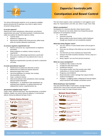 Zaparcia i kontrola jelit Constipation and Bowel Control Ten arkusz informacyjny wyjaśnia, co to są zaparcia i poddaje pewne pomysły dla ich poprawy, oraz mówi ci, gdzie można otrzymać wiecęj pomocy. Co to jest zaparcie? Zaparcie jest często spotykanym zaburzeniem, przy którym wypróżnianie się („kupa” lub kał) przychodzi z trudnością i/lub udaje się rzadziej. Do objawów zaparcia należą: Twarde stolce Nadmierne natężanie się Niemożność oddania kału i/lub poczucie, jakby twoje jelita nie zostały całkowicie opróżnione Co oznacza regularne wypróżnianie się? Możesz wstrzymać się z wypróżnieniem aż dojdziesz do toalety Kiedy usiądziesz na sedesie, możesz zacząć się wypróżniać Masz poczucie całkowitego opróżnienia swoich jelit Korzystasz z toalety od 3 razy dziennie do 3 razy na tydzień Regularne wypróżnianie się może się różnić w zależności od osoby Co może spowodować zaparcie? Niedostateczne pobieranie błonnika w diecie Niedostateczne pobieranie płynów dziennie Niewystarczająca ilość ruchu Leki przeciwbólowe na receptę i bez recepty, lub przewlekłe choroby Ciąża i urodzenie dziecka Zaburzenia jelitowe i/lub uszkodzenie, które wymaga dalszych badań lekarskich Wypadnięcie – tj. opadnięcie i/lub zapadnięcie się wewnętrznych organów, co zakłóca kontrolę nad oddawaniem moczu i wypróżnianiem się Jak powinna wyglądać twoja “kupa”? Twoja „kupa” powinna być jasno- lub ciemnobrązowa, w kształcie kiełbasy, miękka, ale zwarta, łatwa do oddania i o minimalnym odorze. Staraj się oddawać kał typu 3 lub 4. NationalContinence ContinenceHelpline: Helpline:1800 180033 3300 0066 66 National This fact sheet explains what constipation is and suggests some ideas for improvement and tells you where to get more help. What is constipation? Constipation is a common disorder where bowel actions (‘poo’ or faeces) are not easily and/or less frequently passed. Symptoms of constipation include: Hard stools Excessive straining Being unable to pass faecal matter and/or feeling as though your bowels are not completely emptied What does being ‘Regular’ mean? You can ‘hold on’ to your bowel action until you get to the toilet Once you are sitting on the toilet you can start a bowel action You feel that you have emptied your bowel fully Going to the toilet anywhere between 3 times a day to 3 times a week. Being ‘regular’ can vary from person to person. What can cause constipation? Insufficient fibre intake in the diet Insufficient daily fluid intake Insufficient exercise Prescription and/or over-the-counter pain relief medications or chronic health conditions Pregnancy and childbirth Bowel disorders and/or damage that require further medical investigation Prolapse—a sagging and/or collapsing of internal organs which interferes with bladder and bowel control What should your ‘poo’ look like? Your poo should be light or dark brown, sausage-shaped, soft but firm, easy to pass and with minimal odour. Aim to have a type 3 or type 4 bowel action. Polish continence.org.au continence.org.au Często spotykane problemy jelitowe Common Bowel Problems Zablokowanie kałowe – Kiedy zaparcie powoduje napchanie jelita (przewodu pokarmowego) tak mocno, że twoje normalne natężanie się w toalecie nie jest wystarczająco silne, by wypchnąć kał na zewnątrz. Faecal Impaction – When constipation causes faeces to pack the intestine (digestive tract) so tightly that your normal pushing action in the toilet is not strong enough to push the faeces out. Nietrzymanie Kału (czasami określane, jako “zabrudzenie”) – Jest to niezamierzona utrata płynnego lub zbitego kału. Może to być wynikiem zbyt pełnego jelita grubego, (które przechowuje kał), ale może też być tylko jedną z przyczyn. Niekontrolowane gazy („wiatry”) są często uważane za dowód nietrzymania kału. Faecal Incontinence (sometimes referred to as ‘soiling’) – This is the accidental loss of liquid or solid faeces. This can be due to the bowel (which stores the faeces) being too full, but this may be only one of the causes. Uncontrolled flatus (‘wind’) is often considered evidence of faecal incontinence. Hemoroidy (czasem określane, jako żylaki odbytu) – Mogą być one wynikiem natężania się, by się wypróżnić. To natężanie się (podobne do podnoszenia ciężarów) może uszkodzić żyły odbytnicy. Może to spowodować krwawienie, ból i swędzenie. Haemorrhoids (sometimes referred to as ‘piles’) – This can be the result of straining to have a bowel movement. This strain (similar to heavy lifting) can damage the rectum’s veins. This can cause bleeding, soreness and itching. Wypadnięcie odbytnicze – Zdarza się ono, kiedy długoterminowe natężanie się powoduje że mała część wyściółki jelita jest wypchnięta z odbytu, który jest pierścieniem mięśniowym i który się otwiera i zamyka, kiedy się wypróżniamy. Rectal Prolapse – This occurs when long‐term straining causes a small amount of bowel lining to push out from the anus, which is a ring of muscle that opens and closes when we pass a bowel motion. Jak zaparcie wpływa na kontrolę pęcherza Zaparcie może spowodować niezamierzony wyciek z pęcherza moczowego. Przepełnione jelito spowoduje zmniejszenie ilości moczu, jaką twój pęcherz może utrzymać, i wówczas odczuwać będziesz potrzebę chodzenia do toalety często i w pośpiechu. How constipation affects bladder control Constipation can cause accidential leakage from your bladder. An overfull bowel will cut down the volume of urine your bladder can hold and you will feel the need to go to the toilet often and in a hurry. NationalContinence ContinenceHelpline: Helpline:1800 180033 3300 0066 66 National Polish continence.org.au continence.org.au Oto pięć sposobów utrzymania w zdrowiu swojego jelita i zapobiegania zaparciom: Here are five ways to keep your bladder and