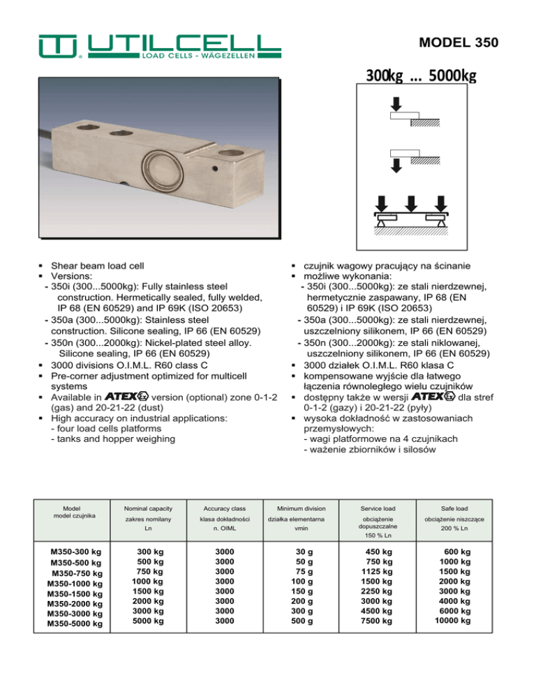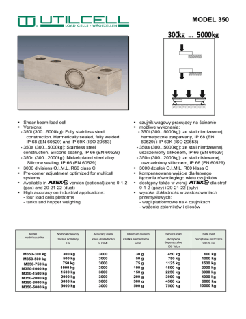 MODEL 350 300kg ... 5000kg § Shear beam load cell § Versions: - 350i (300...5000kg): Fully stainless steel construction. Hermetically sealed, fully welded, IP 68 (EN 60529) and IP 69K (ISO 20653) - 350a (300...5000kg): Stainless steel construction. Silicone sealing, IP 66 (EN 60529) - 350n (300...2000kg): Nickel-plated steel alloy. Silicone sealing, IP 66 (EN 60529) § 3000 divisions O.I.M.L. R60 class C § Pre-corner adjustment optimized for multicell systems § Available in version (optional) zone 0-1-2 (gas) and 20-21-22 (dust) § High accuracy on industrial applications: - four load cells platforms - tanks and hopper weighing Model model czujnika Nominal capacity Accuracy class zakres nomilany klasa dokładności Ln n. OIML § czujnik wagowy pracujący na ścinanie § możliwe wykonania: - 350i (300...5000kg): ze stali nierdzewnej, hermetycznie zaspawany, IP 68 (EN 60529) i IP 69K (ISO 20653) - 350a (300...5000kg): ze stali nierdzewnej, uszczelniony silikonem, IP 66 (EN 60529) - 350n (300...2000kg): ze stali niklowanej, uszczelniony silikonem, IP 66 (EN 60529) § 3000 działek O.I.M.L. R60 klasa C § kompensowane wyjście dla łatwego łączenia równoległego wielu czujników § dostępny także w wersji dla stref 0-1-2 (gazy) i 20-21-22 (pyły) § wysoka dokładność w zastosowaniach przemysłowych: - wagi platformowe na 4 czujnikach - ważenie zbiorników i silosów Minimum division Service load Safe load działka elementarna obciążenie dopuszczalne obciążenie niszczące vmin 200 % Ln 150 % Ln M350-300 kg M350-500 kg M350-750 kg M350-1000 kg M350-1500 kg M350-2000 kg M350-3000 kg M350-5000 kg 300 kg 500 kg 750 kg 1000 kg 1500 kg 2000 kg 3000 kg 5000 kg 3000 3000 3000 3000 3000 3000 3000 3000 30 g 50 g 75 g 100 g 150 g 200 g 300 g 500 g 450 kg 750 kg 1125 kg 1500 kg 2250 kg 3000 kg 4500 kg 7500 kg 600 kg 1000 kg 1500 kg 2000 kg 3000 kg 4000 kg 6000 kg 10000 kg SPECIFICATIONS Nominal capacities (Ln) Accuracy class Minimum dead load Service load Safe load limit 300-500-7501000-150020003000-5000- kg Zakresy nominalne (Ln) n. OIML Klasa dokładności 0 %Ln Minimalne obciążenie wstępne 150 200 %Ln %Ln Dopuszczalne obciążenie Obciążenie niszczące 3000 Total error < ±0.017 %Sn (1) Błąd sumaryczny Repeatability error < ±0.015 %Sn Błąd powtarzalności Temperature effect: on zero on sensitivity Bład temperaturowy: < ±0.01 < ±0.006 %Sn/5°K %Sn/5°K Creep error (30 minutes) < ±0.016 %Sn Błąd pełzania (30 min) Temperature compensation -10...+40 °C Kompensacja temperaturowa Temperature limits -20...+70 °C punktu zera czułości Temperatura pracy mV/V (2) Czułość nominalna (Sn) Nominal sensitivity (Sn) 2 Nominal input voltage Maximum input voltage Input impedance Output impedance No load output Insulation resistance 10 15 400 ±20 350 ±3 < ±2 > 5000 V V Ω Ω %Sn MΩ Nominalne napięcie zasilania Maksymalne napięcie zasilania Oporność na wejściu Oporność na wyjściu Tolerancja sygnału zera Oporność izolacji 0.2-0.4 mm Maksymalne ugięcie (przy Ln) Maximum deflection (at Ln) 350 a/350n DANE TECHNICHNE (1) Total error: Non Linearity and Hysteresis / Błąd sumaryczny: nieliniowość i histereza (2) Pre-corner adjustment optimized at ±0.05% by output current calibration / Optymalizowana na ±0.05% kompensacja poprzez kalibrację prądu sygnału wyjściowego +IN (zielony) -IN (czarny) EKRAN +OUT (czerwony) -OUT (biały)