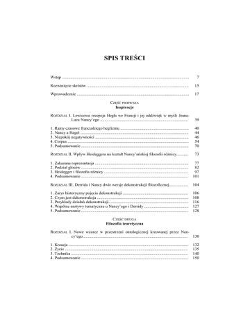 SPIS TREŚCI Wstęp ......................................................................................................................... 7 Rozwinięcie skrótów ................................................................................................. 15 Wprowadzenie ........................................................................................................... 17 CZĘŚĆ PIERWSZA Inspiracje ROZDZIAŁ I. Lewicowa recepcja Hegla we Francji i jej oddźwięk w myśli JeanaLuca Nancy’ego .................................................................................... 39 1. Ramy czasowe francuskiego heglizmu ................................................................. 2. Nancy a Hagel ....................................................................................................... 3. Niepokój negatywności ......................................................................................... 4. Corpus ................................................................................................................... 5. Podsumowanie ...................................................................................................... 40 44 46 54 70 ROZDZIAŁ II. Wpływ Heideggera na kształt Nancy’ańskiej filozofii różnicy........... 73 1. Zakazana reprezentacja ......................................................................................... 77 2. Podział głosów ...................................................................................................... 82 3. Heidegger i filozofia różnicy ................................................................................ 97 4. Podsumowanie ...................................................................................................... 101 ROZDZIAŁ III. Derrida i Nancy dwie wersje dekonstrukcji filozoficznej.................. 104 1. Zarys historyczny pojęcia dekonstrukcji .............................................................. 2. Czym jest dekonstrukcja ....................................................................................... 3. Przykłady działań dekonstrukcji............................................................................ 4. Wspólne motywy tematyczne u Nancy’ego i Derridy .......................................... 5. Podsumowanie ...................................................................................................... 106 108 116 127 128 CZĘŚĆ DRUGA Filozofia teoretyczna ROZDZIAŁ I. Nowe wzorce w przestrzeni ontologicznej kreowanej przez Nancy’ego.................................................................................................... 130 1. Kreacja .................................................................................................................. 2. Życie ..................................................................................................................... 3. Technika ............................................................................................................... 4. Podsumowanie ...................................................................................................... 132 135 140 150 ROZDZIAŁ II. Nowa ontologia ................................................................................... 152 1. Metafizyka a ontologia ......................................................................................... 2. Bycie jedno-mnogie .............................................................................................. 3. Rzeczy ................................................................................................................... 4. Dotyk ..................................................................................................................... 5. Podsumowanie ...................................................................................................... 152 158 166 173 183 ROZDZIAŁ III. Nancy’ańska filozofia sensu wobec tradycji woli znaczenia ............ 185 1. Niepamięć filozofii ................................................................................................ 185 2. Podsumowanie ....................................................................................................... 208 CZĘŚĆ TRZECIA Filozofia praktyczna ROZDZIAŁ I. Filozofia sztuki...................................................................................... 210 1. Prezentacja prezentacji .......................................................................................... 2. Miejsce sztuki ........................................................................................................ 3. Istota sztuki ............................................................................................................ 4. Podsumowanie ....................................................................................................... 211 215 222 229 ROZDZIAŁ II. Filozofia religii .................................................................................... 231 1. Dekonstrukcja chrześcijaństwa ............................................................................. 233 2. Dekluzja i adoracja ................................................................................................ 241 3. Podsumowanie ....................................................................................................... 249 ROZDZIAŁ III. Filozofia polityki ................................................................................ 251 1. Wspólnota .............................................................................................................. 2. Demokracja ........................................................................................................... 3. Dyskurs .................................................................................................................. 4. Czyn ..............................................................................