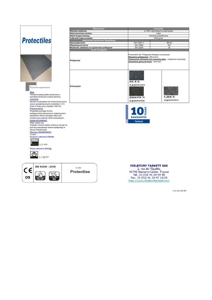 Właściwości Warstwa uŜytkowa Skład pierwszej warstwy Skład drugiej warstwy Całkowita waga produktu Właściwości techniczne/ Klasyfikacja Ognioodporność Współczynnik tarcia Mozliwość układania na ogrzewnaie podłogowe Cechy szczególne Pielęgnacja Kluczowe zagadnienia Opis Tekstylna płaska płytka dywanowa o szorstkiej strukturze (coarse deniers) Instalacja MontaŜ na pływająco lub utrzymywany (przy uŜyciu specjalistycznych produktów) 1,5 h przez 4 osoby przy instalacji 1000 m2 Przeznaczenie: Protectiles pomaga chronić podłogę przed intensywnym uŜytkowaniem, działaniem lekkich sprzętów takich jak krzesła oraz podczas robót budowlanych. Łatwa do instalacji: Płytki szybko się instaluje i równie szybko moŜna je usunąć za pomocą specjalnego wózka dostępnego w ofercie Tarkett Sport. Wymiary (EN426/EN427) 1mx2m Grubość całkowita (EN428) Waga całkowita (EN430) Kolorystyka Protectiles w 100% ognioodporny polipropylen Latex Warstwa poliolefinowa 3100 g/m2 EN 13501-1 EN 13893 EN 12524 Bfl-S1 DS. ok. Przewodnik dot. Pielęgnacji dostępny na Ŝyczenie Regularna pielęgnacja: odkurzanie Czyszczenie okresowe lub usuwanie plam - miejscowa renowacja Ususwanie gumy do Ŝucia - zamrozić
