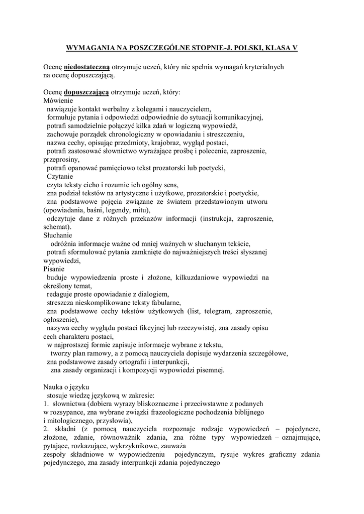 WYMAGANIA NA POSZCZEGÓLNE STOPNIE-J. POLSKI, KLASA V Ocenę niedostateczną otrzymuje uczeń, który nie spełnia wymagań kryterialnych na ocenę dopuszczającą. Ocenę dopuszczającą otrzymuje uczeń, który: Mówienie nawiązuje kontakt werbalny z kolegami i nauczycielem, formułuje pytania i odpowiedzi odpowiednie do sytuacji komunikacyjnej, potrafi samodzielnie połączyć kilka zdań w logiczną wypowiedź, zachowuje porządek chronologiczny w opowiadaniu i streszczeniu, nazwa cechy, opisując przedmioty, krajobraz, wygląd postaci, potrafi zastosować słownictwo wyrażające prośbę i polecenie, zaproszenie, przeprosiny, potrafi opanować pamięciowo tekst prozatorski lub poetycki, Czytanie czyta teksty cicho i rozumie ich ogólny sens, zna podział tekstów na artystyczne i użytkowe, prozatorskie i poetyckie, zna podstawowe pojęcia związane ze światem przedstawionym utworu (opowiadania, baśni, legendy, mitu), odczytuje dane z różnych przekazów informacji (instrukcja, zaproszenie, schemat). Słuchanie odróżnia informacje ważne od mniej ważnych w słuchanym tekście, potrafi sformułować pytania zamknięte do najważniejszych treści słyszanej wypowiedzi, Pisanie buduje wypowiedzenia proste i złożone, kilkuzdaniowe wypowiedzi na określony temat, redaguje proste opowiadanie z dialogiem, streszcza nieskomplikowane teksty fabularne, zna podstawowe cechy tekstów użytkowych (list, telegram, zaproszenie, ogłoszenie), nazywa cechy wyglądu postaci fikcyjnej lub rzeczywistej, zna zasady opisu cech charakteru postaci, w najprostszej formie zapisuje informacje wybrane z tekstu, tworzy plan ramowy, a z pomocą nauczyciela dopisuje wydarzenia szczegółowe, zna podstawowe zasady ortografii i interpunkcji, zna zasady organizacji i kompozycji wypowiedzi pisemnej. Nauka o języku stosuje wiedzę językową w zakresie: 1. słownictwa (dobiera wyrazy bliskoznaczne i przeciwstawne z podanych w rozsypance, zna wybrane związki frazeologiczne pochodzenia biblijnego i mitologicznego, przysłowia), 2. składni (z pomocą nauczyciela rozpoznaje rodzaje wypowiedzeń – pojedyncze, złożone, zdanie, równoważnik zdania, zna różne typy wypowiedzeń – oznajmujące, pytające, rozkazujące, wykrzyknikowe, zauważa zespoły składniowe w wypowiedzeniu pojedynczym, rysuje wykres graficzny zdania pojedynczego, zna zasady interpunkcji zdania pojedynczego i wypowiedzenia złożonego), 3. fleksji (z pomocą nauczyciela rozpoznaje formę i funkcję odmiennych i nieodmiennych części mowy przewidzianych w programie nauczania), 4. fonetyki (zna alfabet, dzieli wyrazy na głoski, litery, sylaby, z pomocą nauczyciela zauważa różnicę między wymową a zapisem samogłosek nosowych, głosek dźwięcznych i bezdźwięcznych, zna sposoby oznaczania miękkości głosek). Ocenę dostateczną otrzymuje uczeń, który: Mówienie angażuje się w rozmowę na określony temat, buduje kilkuzdaniowe wypowiedzi ustne, opowiada, streszcza i opisuje, używając odpowiednio dobranego słownictwa, używa odpowiedniego słownictwa, formułując zaproszenie, prośbę, przeprosiny, odmowę, wygłasza z pamięci teksty prozatorskie lub poetyckie, zwraca uwagę na słowa-klucze, zmienia tempo, posługuje się pauzą, Czytanie rozumie ogólny sens tekstów czytanych cicho, zauważa ich sens metaforyczny, płynnie czyta teksty głośno, poprawnie artykułuje i akcentuje wyrazy, rozróżnia teksty artystyczne i użytkowe, prozatorskie i poetyckie, wyszukuje, rozpoznaje i rozumie informacje zawarte w artykule, instrukcji, schemacie, notatce, wykresie. Słuchanie potrafi zrekonstruować sens słyszanych wcześniej poleceń, instrukcji, innych wypowiedzi, na podstawie słyszanego tekstu potrafi sformułować pytania zamknięte do najważniejszych jego treści. Pisanie pisze wypowiedzi o charakterze artystycznym (opowiadanie z dialogiem, opis) i użytkowym (list, telegram, zaproszenie, zawiadomienie), opisuje cechy zewnętrzne i wewnętrzne postaci fikcyjnej lub rzeczywistej, zapisuje najważniejsze informacje w formie kilku zdań, wpisu danych w tabelę, na schemacie, wykresie, pisze streszczenie utworu, tworzy plan ramowy, a z pomocą nauczyciela plan szczegółowy, zna i stosuje zasady ortografii i interpunkcji, stosuje zasady estetycznego zapisu oraz organizacji i kompozycji wypowiedzi pisemnej. Nauka o języku stosuje wiedzę językową w zakresie: 1. słownictwa (dopisuje wyrazy bliskoznaczne i przeciwstawne, wyjaśnia znaczenie i pochodzenie wybranych frazeologizmów biblijnych i mitologicznych, przysłów, powiedzeń), 2. składni (rozpoznaje rodzaje wypowiedzeń – pojedyncze i złożone, zdanie, równoważnik zdania, wyróżnia różne ich typy – oznajmujące, pytające, rozkazujące, wykrzyknikowe, wskazuje zespoły składniowe w zdaniu, rysuje wykres graficzny zdania pojedynczego), 3. fleksji (zna podstawowe formy i funkcje odmiennych i nieodmiennych części mowy przewidzianych w programie nauczania), 4. fonetyki (posługuje się alfabetem, poprawnie artykułuje głoski, uwzględnia różnicę między zapisem a wymową samogłosek nosowych, głosek dźwięcznych i bezdźwięcznych, oznacza miękkość głosek przez i oraz kreseczkę). Ocenę dobrą otrzymuje uczeń, który: Mówienie aktywnie uczestniczy w dyskusji na tematy związane z codziennymi sytuacjami, samodzielnie wypowiada się na temat przeczytanych lektur, argumentuje swoje stanowisko, odwołując się do doświadczeń życiowych oraz przeczytanego tekstu, opowiada i opisuje, stosując odpowiednie słownictwo, wygłaszając tekst z pamięci, zwraca uwagę na ważne jego treści, zmusza odbiorcę do refleksji, stosuje się do norm językowych. Czytanie czyta teksty cicho, rozumiejąc ich sens na poziomie semantycznym, oraz odkrywa znaczenia przenośne, rozpoznaje i wskazuje charakterystyczne cechy różnych tekstów kultury (teksty literackie, użytkowe, publicystyczne, popularnonaukowe, przedstawienia teatralne i filmy, przekazy ikoni