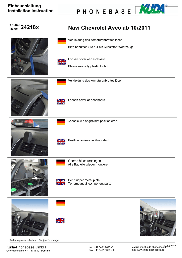 Einbauanleitung installation instruction Art.-Nr.: item# 24218x Navi Chevrolet Aveo ab 10/2011 Verkleidung des Armaturenbrettes lösen Bitte benutzen Sie nur ein Kunststoff-Werkzeug! Loosen cover of dashboard Please use only plastic tools! Verkleidung des Armaturenbrettes lösen Loosen cover of dashboard Konsole wie abgebildet positionieren Position console as illustrated Oberes Blech umbiegen Alle Bauteile wieder montieren Bend upper metal plate To remount all component parts Änderungen vorbehalten Subject to change Kuda-Phonebase GmbH Osterdammerstr. 67 D-49401 Damme tel: +49 5491 9695 -0 fax: +49 5491 9695 -30 24.04.2012 eMail: [email protected] net: www.kuda-phonebase.de Instructions d´ installation instrucciones de instalación Art. 24218x Navi Chevrolet Aveo ab 10/2011 Desserrez la couverture du tableau de bord Veuillez n’utiliser qu’un outil de matière plastique Suelte el revestimiento del tablero de instrumentos Use sólo herramientas de plástico! Desserrez la couverture du tableau de bord Suelte el revestimiento del tablero de instrumentos Positionnez la console comme illustré Posicione la consola como mostrado Tordez la tôle de dessus Remontez les éléments de construction Tuerza la chapa arriba Remonte todos partes de construcción . Nous nous réservons la possibilité de modification instrukcja montazu Kuda-Phonebase GmbH Osterdammerstr. 67 D-49401 Damme Salvo posibles modificaciones tel: +49 5491 9695 -0 fax: +49 5491 9695 -30 24.04.2012 eMail: [email protected] net: www.kuda-phonebase.de instrukcja montazu installatie instructie Art. 24218x Navi Chevrolet Aveo ab 10/2011 Raamwerk losmaken van onstrumtenpaneel Alleen plastic gereedschap gebruiken alstublieft! Oslone deski rozdzielczej poluzowac Prosze uzywac tylko narzedzi z tworzywa sztucznego. Raamwerk losmaken van onstrumtenpaneel Oslone deski rozdzielczej poluzowac Konsole zoals afgebeeld positioneren Uchwyt umiescic jak na przedstawionym zdjeciu. Tuerza la chapa arriba Remonte todos partes de construcción Gorna blaszke zagiac Wszystkie elementy ponownie zamontowac Nous nous réservons la possibilité de modification Kuda-Phonebase GmbH Osterdammerstr. 67 D-49401 Damme Salvo posibles modificaciones tel: +49 5491 9695 -0 fax: +49 5491 9695 -30 24.04.2012 eMail: [email protected] net: www.kuda-phonebase.de