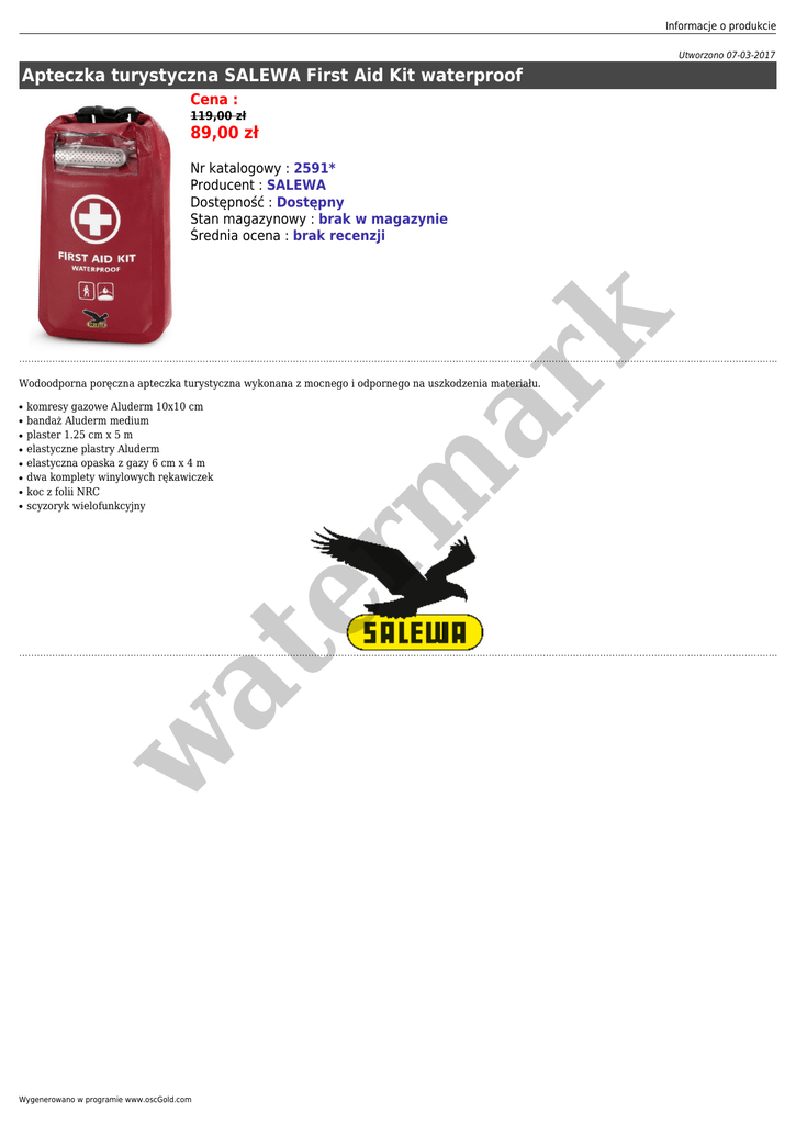 Informacje o produkcie Utworzono 07-03-2017 Apteczka turystyczna SALEWA First Aid Kit waterproof Cena : 119,00 zł 89,00 zł er m ar k Nr katalogowy : 2591* Producent : SALEWA Dostępność : Dostępny Stan magazynowy : brak w magazynie Średnia ocena : brak recenzji Wodoodporna poręczna apteczka turystyczna wykonana z mocnego i odpornego na uszkodzenia materiału. ● ● ● ● ● ● ● w at ● komresy gazowe Aluderm 10x10 cm bandaż Aluderm medium plaster 1.25 cm x 5 m elastyczne plastry Aluderm elastyczna opaska z gazy 6 cm x 4 m dwa komplety winylowych rękawiczek koc z folii NRC scyzoryk wielofunkcyjny Wygenerowano w programie www.oscGold.com