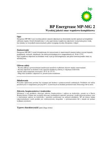 BP Energrease MP-MG 2 Wysokiej jakości smar wapniowo-kompleksowy Opis Energrease MP-MG 2 jest wysokiej jakości smarem odpornym na ekstremalne naciski opartym na kompleksie sulfonatu wapnia. Został sformułowany w celu zapewnienia wyjątkowej odporności wymywania przez wodę. Jest idealny we wszystkich zastosowaniach, gdzie występują wysokie obciąŜenia i wilgoć. Zastosowanie Energrease MP-MG 2 został sformułowany do zastosowania w smarowanych smarem stałym sworzni koparek, pogłębiarek, walcarek, obrabiarek i lin stalowych działających w temperaturach od -30 do 175°C. Jego wyjątkowa odporność na działanie wody czyni go niezastąpionym, tam gdzie konwencjonalne smary są nieefektywne. Główne zalety - Wysoka adhezja z powierzchniami metalowymi umoŜliwia wydłuŜenie okresów między smarowaniami - Wysoka odporność na działanie wody zapewnia dodatkową ochronę w wilgotnym środowisku -Szeroki zakres temperatur stosowania (-30 oC do 175 oC) - Długi okres działania i odporność na przedwczesne twardnienie Składowanie Wszystkie opakowania powinny być trzymane pod dachem w pomieszczeniach zamkniętych. Produktów nie naleŜy przechowywać w temperaturze powyŜej 60°C, wystawionych na działanie promieniowania słonecznego lub na mróz. Zdrowie, bezpieczeństwo i środowisko Informacje o tym produkcie, dotyczące zdrowia, bezpieczeństwa i wpływu na środowisko, zawarte są w Karcie Bezpieczeństwa. Podano tam szczegóły dotyczące ewentualnych zagroŜeń, przestrogi i środki pierwszej pomocy wraz z omówieniem wpływu na środowisko i sposobów pozbywania się zuŜytych produktów. BP nie ponosi Ŝadnej odpowiedzialności, jeŜeli produkt jest wykorzystywany niezgodnie z przeznaczeniem lub z innymi niŜ podano środkami ostroŜności. Typowe charakterystyki (patrz druga strona) BP Energrease MP-MG 2 Wysokiej jakości smar wapniowo-kompleksowy Typowa charakterystyka fizykochemiczna Metoda oznaczenia Jednostka Rodzaj zagęszczacza - - kompleks wapniowy Klasyfikacja NLGI ISO 2137, ASTM D 217 - 2 Tekstura - - gładka Barwa - - brązowa nieprzezroczysta Temp. kroplenia ASTM D566 °C >300 Lepkość oleju w 40°°C ISO 3105, ASTM D446 mm2/s 180 Penetracja robocza, 25°C/60 cykli ISO 2137, ASTM D 217 0.1 mm 285 Wymywanie wodą ASTM D4049 % wag - Zabezpieczenie antykorozyjne (Emcor) IP 220, DIN 51802 - 0 ObciąŜalność Timken OK ASTM D2509 Ibs 65 Test czterokulowy ASTM D 2783, DIN 51350/4 N 540 Odporność na korozję ASTM B117 Skala 1-6 1 PowyŜsze dane są typowymi wartościami uzyskiwanymi przy normalnych tolerancjach produkcyjnych i nie stanowią specyfikacji technicznych. Mogą ulegać zmianom z uwagi na ciągły rozwój produktów. Aktualizacja: 15/06/2009