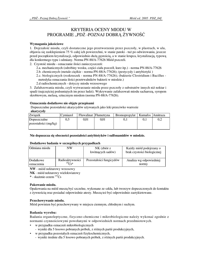 „ PD - Poznaj Dobr ywno " Miód ed. 2005 PDZ_04f KRYTERIA OCENY MIODU W PROGRAMIE „PD -POZNAJ DOBR YWNO Wymagania jako ciowe 1. Dojrzało miodu, czyli dostateczne jego przetworzenie przez pszczoły, w plastrach, w ulu, objawia si zasklepieniem 75 % całej ich powierzchni, w stanie patoki - tu po odwirowaniu, jeszcze przed pocz tkiem krystalizacji, odpowiednio du g sto ci , a w stanie krupca, krystalizacj , typow dla konkretnego typu i odmiany. Norma PN-88/A-77626 Miód pszczeli. 2. Czysto miodu - oznaczanie ilo ci zanieczyszcze : 2.a. mechanicznych (odrobiny wosku, cz ci ciała pszczół, kurz itp.) - norma PN-88/A-77626 2.b. chemicznych (metale ci kie - norma PN-88/A-77626); (pestycydy i antybiotyki ) 2.c. biologicznych (rozkruszek - norma PN-88/A-77626); (bakterie Clostridium i Bacillus metodyka oznaczania ilo ci przetrwalników bakterii w miodzie.) 2.d radiochemicznych - dotyczy miodu wrzosowego 3. Zafałszowania miodu, czyli wytwarzanie miodu przez pszczoły z substratów innych ni nektar i spad (najcz ciej podsuni tych im przez ludzi). Wykrywanie zafałszowa miodu sacharoz , syropem skrobiowym, melas , sztucznym miodem (norma PN-88/A-77626). Oznaczenia dodatkowe nie obj te przepisami Dopuszczalne pozostało ci akarycydów u ywanych jako leki przeciwko warrozie akarycydy Zwi zek Cymiazol Fluwalinat Flumetryna Bromopropylat Kumafos Amitraza 0,5 0,01 0,01 0,1 0,1 0,2 Dopuszczalne pozostało ci (mg/kg) Nie dopuszcza si obecno ci pozostało ci antybiotyków i sulfonamidów w miodzie. Dodatkowe badania w szczególnych przypadkach Odmiana miodu NW NK (zbiór z kwitn cych sadów) Radioaktywno ci Dodatkowe 137 Cs* oznaczenia NW - miód nektarowy wrzosowy NK - miód nektarowy wielokwiatowy * - ska enie cezem 137Cs Pozostało ci fungicydów Ka dy miód podejrzany o brak czysto ci biologicznej Analiza wg odpowiedniej normy Pakowanie miodu. Opakowania na miód musz by szczelne, wykonane ze szkła, lub tworzyw dopuszczonych do kontaktu z ywno ci oraz posiada odpowiednie atesty. Musz te by odpowiednio zaetykietowane. Przechowywanie miodu. Miód powinien by przechowywany w miejscu ciemnym, chłodnym i suchym. Badania wyrobu: Badania organoleptyczne, fizyczno-chemiczne i mikrobiologiczne nale y wykona zgodnie z normami czynno ciowymi powołanymi w odpowiednich normach przedmiotowych. • w przypadku oznacze mikrobiologicznych - wyniki dla 5 losowo pobranych próbek, z ró nych partii produkcyjnych, • w przypadku pozostałych oznacze fizykochemicznych, - wyniki rednie dla 5 losowo pobranych próbek, z ró nych partii produkcyjnych.