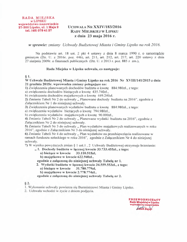 § 1W Uchwale Budżetowej Miasta i Gminy Lipsko na rok 2016 Nr XVIII/141/2015 z dnia