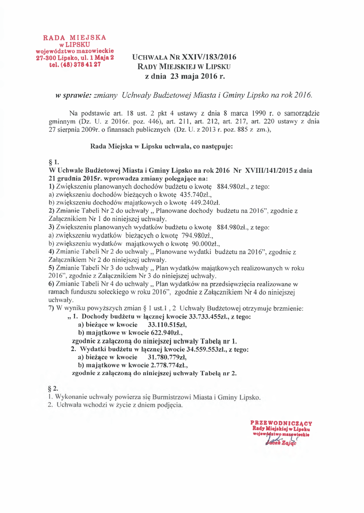Uchwała Nr XXIV/183/2016 Rady Miejskiej w Lipsku z