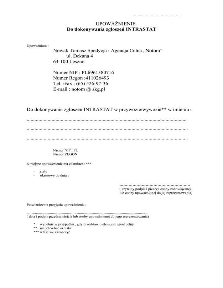 ……..…………………………... UPOWAŻNIENIE Do dokonywania zgłoszeń INTRASTAT Upoważniam : Nowak Tomasz Spedycja i Agencja Celna „Notom” ul. Dekana 4 64-100 Leszno Numer NIP : PL6961380716 Numer Regon :411026493 Tel. /Fax : (65) 526-97-36 E-mail : notom @ skg.pl Do dokonywania zgłoszeń INTRASTAT w przywozie/wywozie** w imieniu : .......................................................................................................................... ........................................................................................................................... ........................................................................................................................... Numer NIP : PL Numer REGON Niniejsze upoważnienie ma charakter : *** - stały okresowy do dnia : ...................................................... ( czytelny podpis i pieczęć osoby zobowiązanej lub osoby upoważnionej do jej reprezentowania) Potwierdzenie przyjęcia upoważnienia : ................................................................................................................................. ( data i podpis przedstawiciela lub osoby upoważnionej do jego reprezentowania) * wypełnić w przypadku , gdy przedstawicielem jest agent celny ** niepotrzebne skreślić *** właściwe zaznaczyć