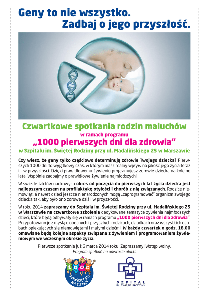 Geny to nie wszystko. Zadbaj o jego przyszłość. Czwartkowe spotkania rodzin maluchów w ramach programu „1000 pierwszych dni dla zdrowia” w Szpitalu im. Świętej Rodziny przy ul. Madalińskiego 25 w Warszawie Czy wiesz, że geny tylko częściowo determinują zdrowie Twojego dziecka? Pierwszych 1000 dni to wyjątkowy czas, w którym masz realny wpływ na jakość jego życia teraz i… w przyszłości. Dzięki prawidłowemu żywieniu programujesz zdrowie dziecka na kolejne lata. Wspólnie zadbajmy o prawidłowe żywienie najmłodszych! W świetle faktów naukowych okres od poczęcia do pierwszych lat życia dziecka jest najlepszym czasem na profilaktykę otyłości i chorób z nią związanych. Rodzice niemowląt, a nawet dzieci jeszcze nienarodzonych mogą „zaprogramować” organizm swojego dziecka tak, aby było ono zdrowe dziś i w przyszłości. W roku 2014 zapraszamy do Szpitala im. Świętej Rodziny przy ul. Madalińskiego 25 w Warszawie na czwartkowe szkolenia dedykowane tematyce żywienia najmłodszych dzieci, które będą odbywały się w ramach programu „1000 pierwszych dni dla zdrowia”. Przygotowano je z myślą o obecnych i przyszłych rodzicach, dziadkach oraz wszystkich osobach opiekujących się niemowlętami i małymi dziećmi. W każdy czwartek o godz. 18.00 omawiane będą kolejne aspekty związane z żywieniem i programowaniem żywieniowym we wczesnym okresie życia. Pierwsze spotkanie już 6 marca 2014 roku. Zapraszamy! Wstęp wolny. Program spotkań na odwrocie ulotki. PROGRAM SPOTKAŃ w 2014 roku: „1000 pierwszych dni” – najlepszy czas na profilaktykę chorób wieku dorosłego. Dlaczego mówimy o zdrowiu malucha w jego w życiu dorosłym tak wcześnie? Co to jest programowanie żywieniowe we wczesnym okresie życia? Jakie problemy zdrowotne w dorosłym życiu mogą dotyczyć dzisiejszych niemowląt? Czy można przewidzieć otyłość w wieku dorosłym już w brzuchu mamy oraz we wczesnym dzieciństwie? Jak rodzina może pomóc dziecku stać się zdrowym dorosłym? Terminy spotkań: 6 marca, 10 kwietnia, 22 maja, 26 czerwca, 31 lipca, 4 września, 9 października, 13 listopada – godz. 18.00. Miejsce spotkań: hol główny. D ieta przyszłej mamy i kobiety karmiącej. Czy to już czas na zapobieganie chorobom serca u dziecka i przyszłego dorosłego? Fakty, mity i nowe spojrzenie na odżywianie kobiety w ciąży i karmiącej. Czy dieta przyszłej mamy może mieć wpływ na przyszłe preferencje smakowe dziecka? Czy profilaktyka chorób serca może rozpocząć się już w okresie prenatalnym? Jak odżywiać się w ciąży i podczas karmienia piersią z myślą o zdrowiu dziecka teraz i w przyszłości? Terminy spotkań: 13 marca, 17 kwietnia, 29 maja, 3 lipca, 7 sierpnia, 11 września, 16 października, 20 listopada – godz. 18.00. Miejsce spotkań: hol główny. „Najlepsze pod słońcem” – mleko mamy Wszystko o zaletach karmienia malucha piersią. Zdrowie dziecka dziś i w przyszłości. Korzyści dla mamy i malucha. Czy to możliwe, aby mleko mamy zapobiegało cukrzycy i nadciśnieniu tętniczemu nawet w wieku dorosłym dziecka? Terminy spotkań: 20 marca, 17 kwietnia (wyjątkowo o godz. 19:00), 5 czerwca, 10 lipca, 7 sierpnia (wyjątkowo o godz. 19.00), 18 września, 23 października, 27 listopada – godz. 18.00. Miejsce spotkań: hol główny. J ak prawidłowo rozszerzać dietę niemowlęcia? Kiedy i jak rozpocząć rozszerzanie diety dziecka? Jak nauczyć dzidziusia jeść pokarmy kluczowe dla jego dobrego zdrowia w przyszłości? Czy preferencje smaku niemowlęcia pomagają, czy przeszkadzają mu w wyrabianiu zdrowych nawyków żywieniowych? „Od papki, do pajdki” – jak zmienia się konsystencja dań malucha i dlaczego jest ona tak ważna dla rozwoju dziecka? Kiedy przychodzi czas dania z „dorosłego stołu”? Terminy spotkań: 27 marca, 8 maja, 12 czerwca, 17 lipca, 21 sierpnia, 25 września, 30 października, 4 grudnia – godz. 18.00. Miejsce spotkań: hol główny. J ak prawidłowo komponować dietę dziecka w wieku 1-3 lata? Jak powinien wyglądać talerz małego dziecka? Jakie posiłki i w jakich ilościach powinno zjeść małe dziecko? Co powinien pić maluch? Jak na półce sklepowej rozpoznać żywność przeznaczoną dla małych dzieci i jakie kryteria powinna ona spełniać? Które informacje na opakowaniu produktu są ważne, a które mogą wprowadzić w błąd? Co niepokoi ekspertów w diecie dwu- i trzy-latków? Terminy spotkań: 3 kwietnia, 15 maja, 19 czerwca, 24 lipca, 28 sierpnia, 2 października, 6 listopada, 11 grudnia – godz. 18.00. Miejsce spotkań: hol główny. Zdajemy sobie sprawę, że nie jest łatwo żywić dziecko zgodnie z zaleceniami. W oparciu o najnowsze doniesienia naukowe wraz z ekspertami przygotowaliśmy platformę edukacyjną www.1000dni.pl . Znajdziesz na niej pomocne informacje oraz zalecenia żywieniowe dla Twojego dziecka. Wspólnie zadbajmy o prawidłowe żywienie najmłodszych!