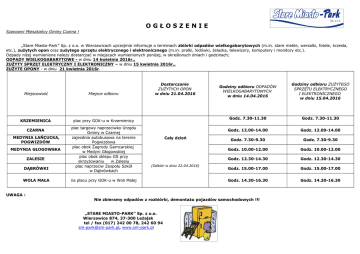 OGŁOSZENIE Szanowni Mieszkańcy Gminy Czarna ! „Stare Miasto-Park” Sp. z o.o. w Wierzawicach uprzejmie informuje o terminach zbiórki odpadów wielkogabarytowych (m.in. stare meble, wersalki, fotele, krzesła, etc.), zużytych opon oraz zużytego sprzętu elektrycznego i elektronicznego (m.in. pralki, lodówki, żelazka, telewizory, komputery i monitory etc.). Odpady niżej wymienione należy dostarczać w miejscach wymienionych poniżej, w określonych dniach i godzinach; ODPADY WIELKOGABARYTOWE - w dniu 14 kwietnia 2016r., ZUŻYTY SPRZĘT ELEKTRYCZNY I ELEKTRONICZNY – w dniu 15 kwietnia 2016r., ZUŻYTE OPONY - w dniu 21 kwietnia 2016r. Miejscowość Miejsce odbioru KRZEMIENICA plac przy GOK-u w Krzemienicy CZARNA MEDYNIA ŁAŃCUCKA, POGWIZDÓW MEDYNIA GŁOGOWSKA ZALESIE DĄBRÓWKI WOLA MAŁA UWAGA : plac targowy naprzeciwko Urzędu Gminy w Czarnej zajezdnia autobusowa na terenie Pogwizdowa plac obok Zagrody Garncarskiej w Medyni Głogowskiej plac obok sklepu GS przy skrzyżowaniu w Zalesiu plac naprzeciw Zespołu Szkół w Dąbrówkach Dostarczanie ZUŻYTYCH OPON w dniu 21.04.2016 Cały dzień (Odbiór w dniu 22.04.2016) na placu przy GOK-u w Woli Małej Godziny odbioru ODPADÓW WIELKOGABARYTOWYCH w dniu 14.04.2016 Godziny odbioru ZUŻYTEGO SPRZĘTU ELEKTRYCZNEGO I ELEKTRONICZNEGO w dniu 15.04.2016 Godz. 7.30-11.30 Godz. 7.30-11.30 Godz. 12.00-14.00 Godz. 12.00-14.00 Godz. 7.30-9.30 Godz. 7.30-9.30 Godz. 10.00-12.00 Godz. 10.00-12.00 Godz. 12.30-14.30 Godz. 12.30-14.30 Godz. 15.00-17.00 Godz. 15.00-17.00 Godz. 14.30-16.30 Godz. 14.30-16.30 Nie zbieramy odpadów z rozbiórki, demontażu pojazdów samochodowych !!! „STARE MIASTO-PARK” Sp. z o.o. Wierzawice 874, 37-300 Leżajsk tel / fax (017) 242 00 78, 242 60 94 [email protected], www.sm-park.pl