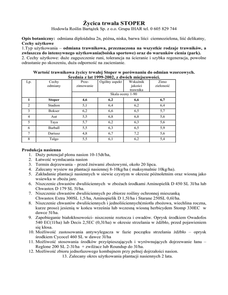 Życica trwała STOPER Hodowla Roślin Bartążek Sp. z o.o. Grupa IHAR tel. 0 605 829 744 Opis botaniczny: odmiana diploidalna 2n, późna, niska, barwa liści ciemnozielona, liść delikatny, Cechy użytkowe 1.Typ użytkowania – odmiana trawnikowa, przeznaczona na wszystkie rodzaje trawników, a zwłaszcza do intensywnego użytkowania(boiska sportowe) oraz do warunków cienia (park). 2. Cechy użytkowe: duże zagęszczenie runi, tolerancja na ścieranie i szybka regeneracja, powolne odrastanie po skoszeniu, duża odporność na zacienianie. Wartość trawnikowa życicy trwałej Stoper w porównaniu do odmian wzorcowych. Średnia z lat 1999-2002, z dwóch miejscowości. Lp. Cechy odmiany Przezimowanie Ogólny aspekt Wskaźnik jakości trawnika Skala oceny 1-90 Zimo zieloność 1 Stoper 4,6 6,2 6,6 6,7 2 Stadion 5,1 6,4 6,2 6,4 3 Bokser 6,2 6,6 6,5 5,7 4 Aut 5,5 6,8 6,8 5,6 5 Taya 5,7 6,2 6,3 5,6 6 Barball 5,5 6,3 6,5 5,9 7 Dariusz 4,8 6,7 7,2 5,6 8 Talgo 5,5 6,1 6,2 5,4 Produkcja nasienna 1. Duży potencjał plonu nasion 10-15dt/ha, 2. Łatwość wymłacania nasion 3. Termin dojrzewania – przed żniwami zbożowymi, około 20 lipca. 4. Zalecany wysiew na plantacji nasiennej 8-10kg/ha ( maksymalnie 10kg/ha). 5. Zakładanie plantacji nasiennych w siewie czystym w okresie późnoletnim oraz wiosną jako wsiewka w zboża jare. 6. Niszczenie chwastów dwuliściennych w zbożach środkami Aminopielik D 450 SL 3l/ha lub Chwastox D 179 SL 5l/ha. 7. Niszczenie chwastów dwuliściennych po zbiorze rośliny ochronnej mieszanką Chwastox Extra 300SL 1,5/ha, Aminopielik D 1,5l/ha i Starane 250SL 0,6l/ha. 8. Niszczenie chwastów dwuliściennych i jednoliściennych(miotła zbożowa, wiechlina roczna, kurze proso) jesienią w końcu września lub wczesną wiosną herbicydem Stomp 330EC w dawce 5l/ha. 9. Zapobieganie białokłosowości- niszczenie roztocza i owadów. Oprysk środkiem Owadofos 540 EC(1l/ha) lub Decis 2,5EC (0,3l/ha) w okresie strzelania w źdźbło, przed pojawieniem się kłosa. 10. Możliwość zastosowania antywylegacza w fazie początku strzelania źdźbło – oprysk środkiem Cycocel 460 SL w dawce 3l/ha 11. Możliwość stosowania środków przyśpieszających i wyrównujących dojrzewanie łanu – Reglone 200 SL 2-3l/ha + zwilżacz lub Roundup do 3l/ha. 12. Możliwość zbioru jednofazowego kombajnem przy pełnej dojrzałości nasion. 13. Zalecany okres użytkowania plantacji nasiennych 2 lata.